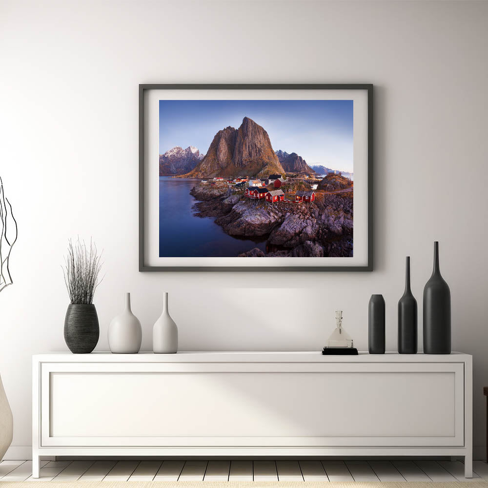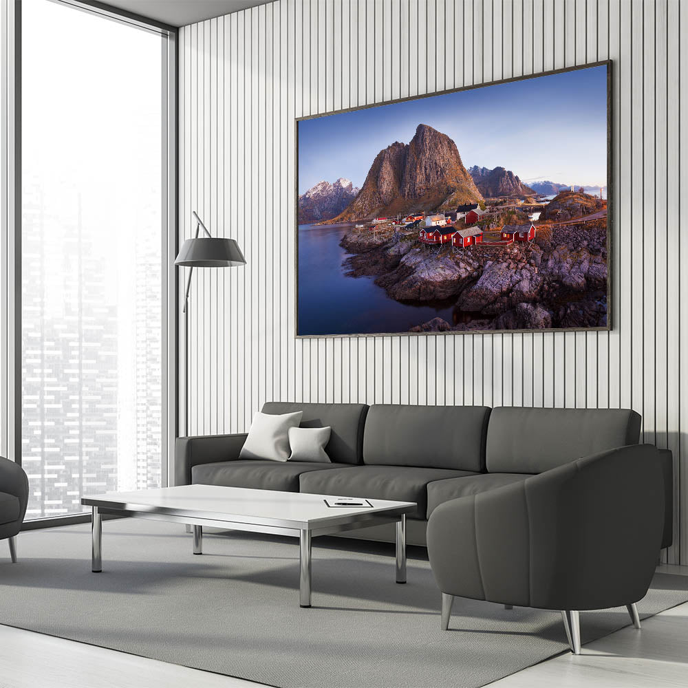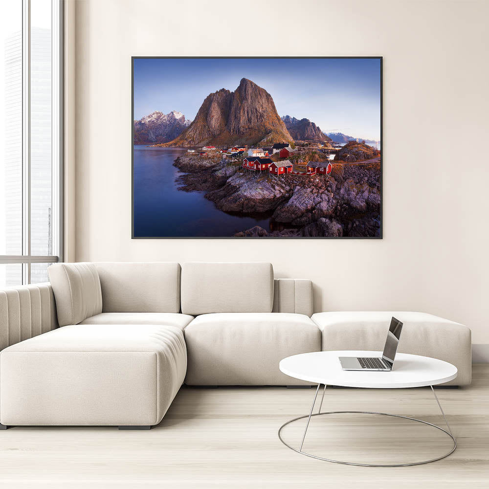 Discover the serene beauty of a remote coastal village nestled against towering mountains with this captivating piece of village landscape art. This artwork showcases a picturesque scene where red houses are perched on rocky shores, with majestic mountains rising in the background. The calm waters and the rich, earthy tones of the landscape create a tranquil and inviting atmosphere, perfect for adding a touch of rustic charm to any room.