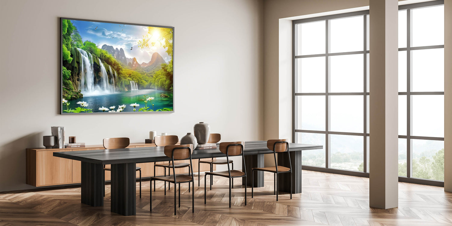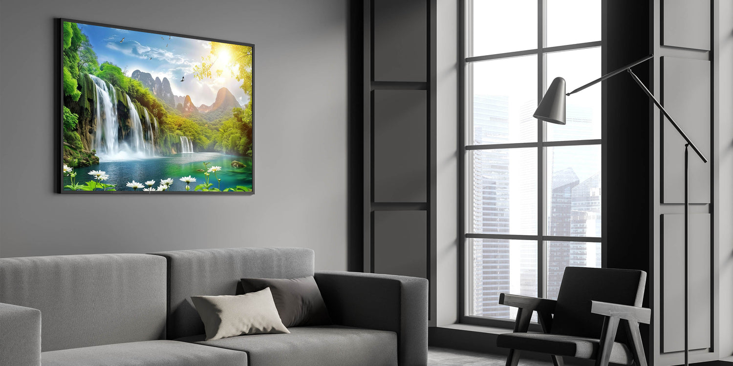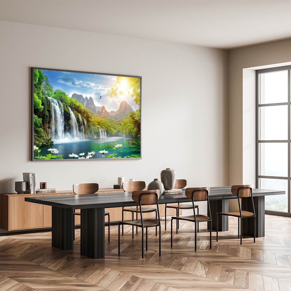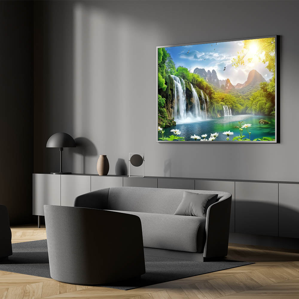 - High-quality waterfall canvas available in various formats, including stretched and framed canvas, acrylic glass, and rolled prints.