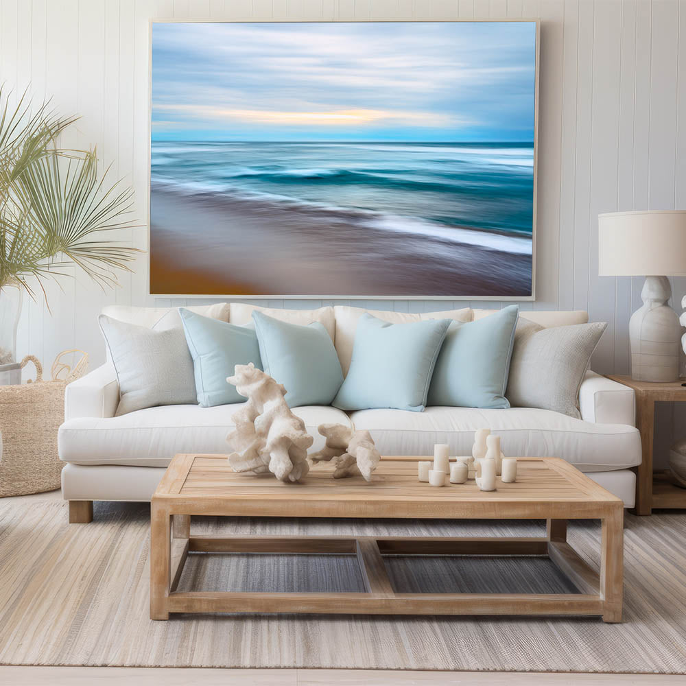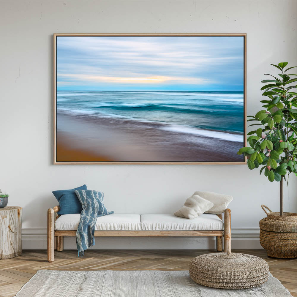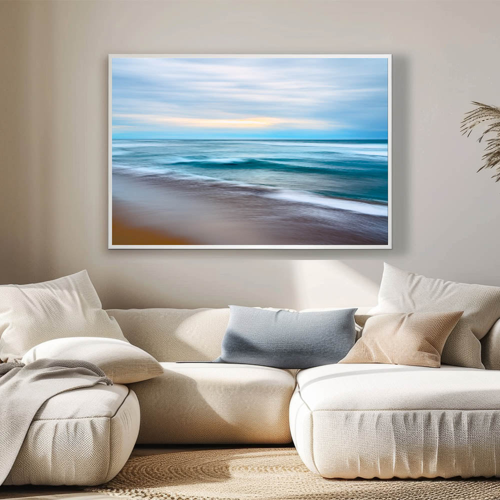 Transform your home with the soothing beauty of the ocean with this tranquil coastal wall art featuring soft, blurred waves gently rolling onto the shore. The serene blend of blue and sandy tones captures the peaceful ambiance of the beach, making this artwork ideal for those looking to create a relaxing, coastal-inspired atmosphere. The minimalistic style and calming color palette make it a perfect addition to any beach-themed or oceanic decor, effortlessly enhancing modern, contemporary, or nautical interiors.