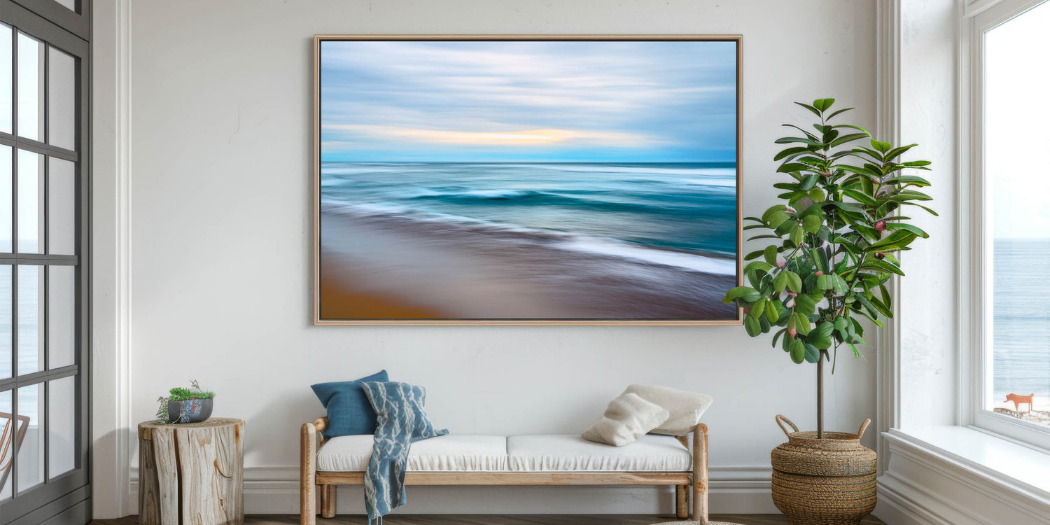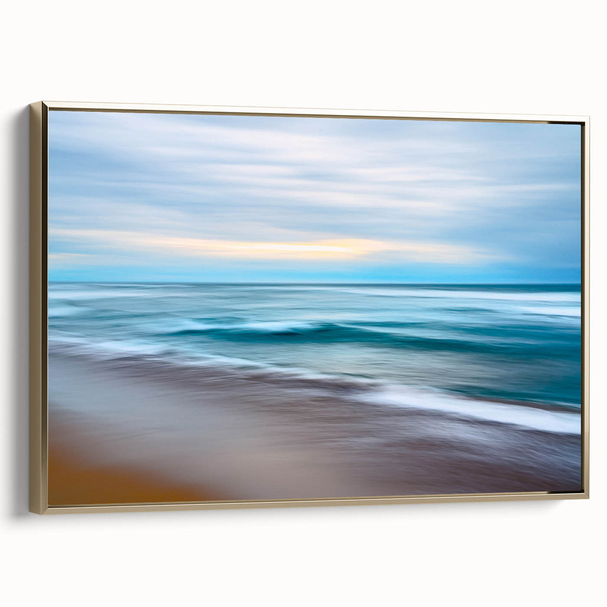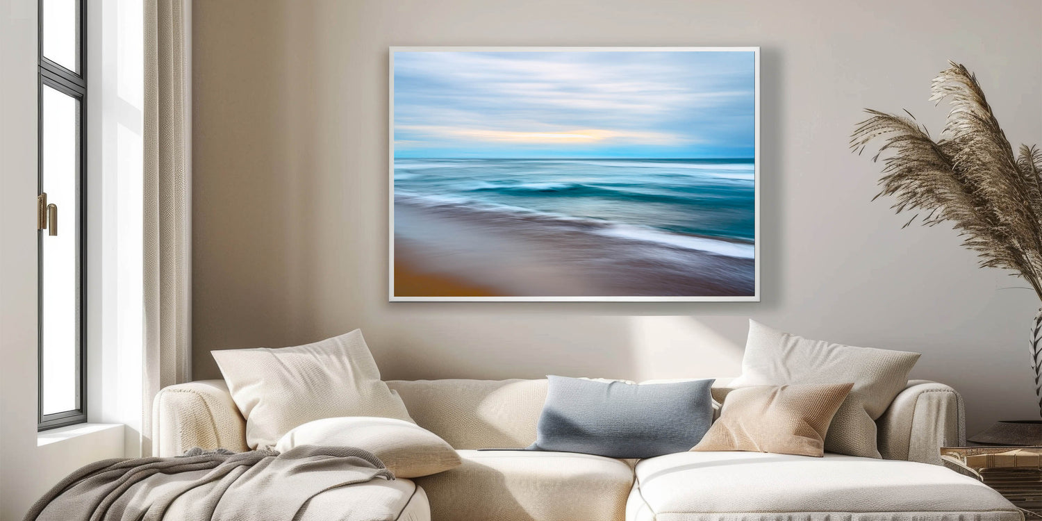 Transform your home with the soothing beauty of the ocean with this tranquil coastal wall art featuring soft, blurred waves gently rolling onto the shore. The serene blend of blue and sandy tones captures the peaceful ambiance of the beach, making this artwork ideal for those looking to create a relaxing, coastal-inspired atmosphere. The minimalistic style and calming color palette make it a perfect addition to any beach-themed or oceanic decor, effortlessly enhancing modern, contemporary, or nautical interiors.