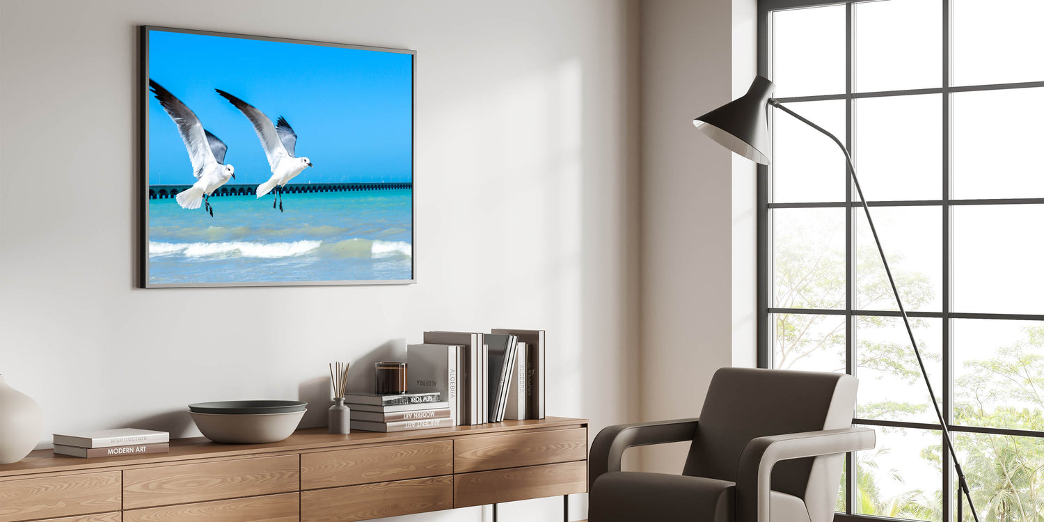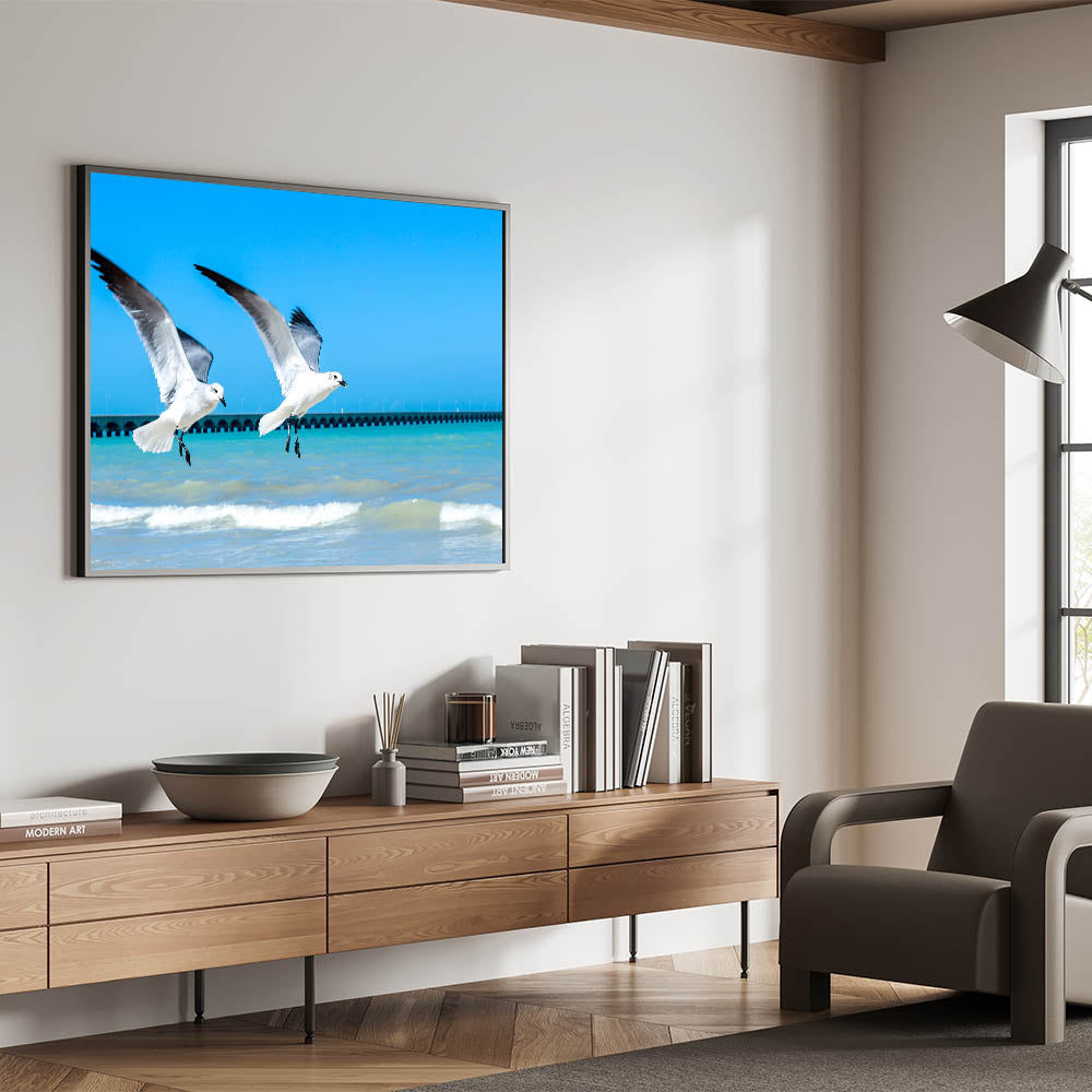 Experience the freedom of the Yucatan coast with this breathtaking wall art, capturing the graceful flight of seagulls over a stunning turquoise beach. The bright blue sky, the waves of the Gulf of Mexico, and the birds in motion make this Yucatan canvas art a perfect addition for beach lovers and nature enthusiasts. This vivid Yucatan travel photography piece brings the beauty of the coast directly into your home.