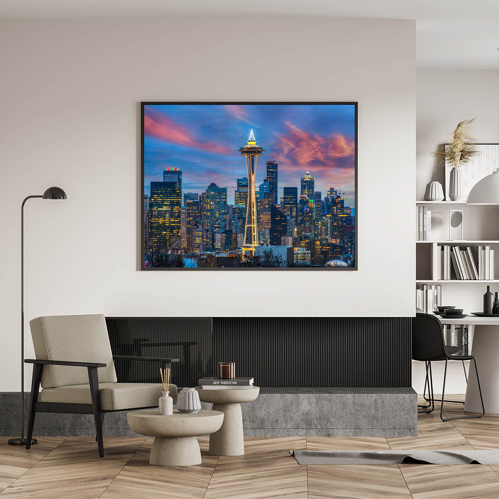 This captivating Seattle cityscape photography features the iconic Space Needle against a backdrop of vibrant sunset colors. The glowing city lights combined with the striking sky make this piece of Seattle wall art an ideal choice for adding a touch of urban elegance to your space. Capturing the essence of the city’s skyline, this artwork offers a stunning view that brings warmth and energy to any room.
