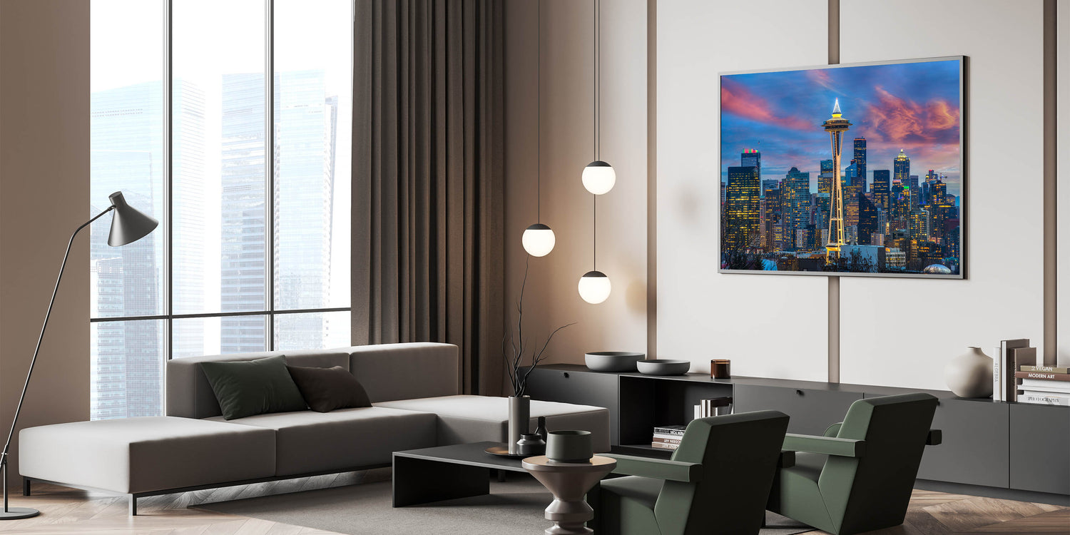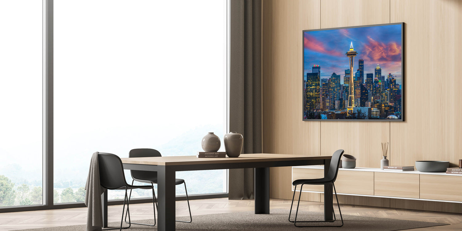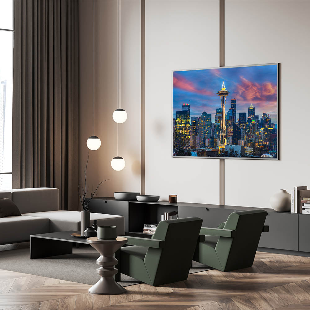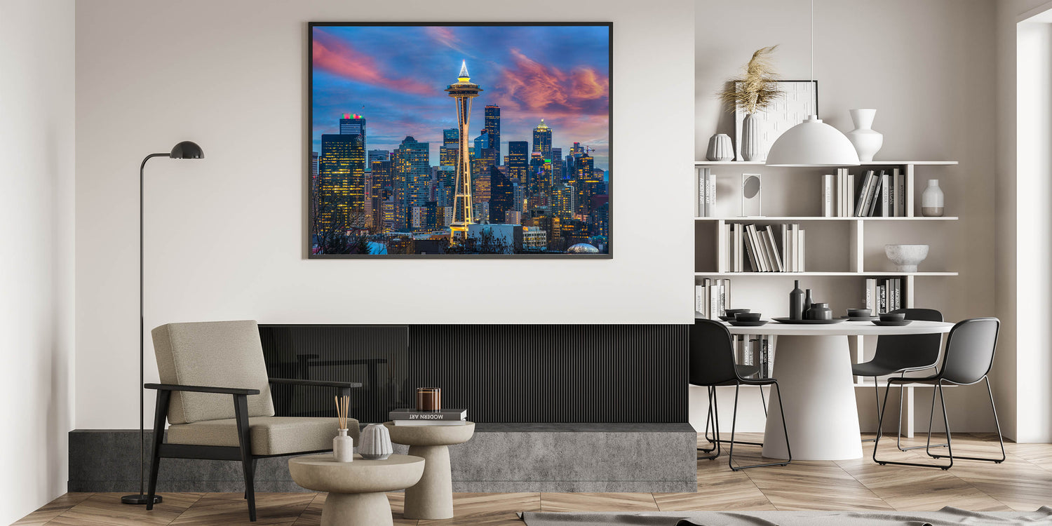 - High-quality Seattle prints showcasing the Space Needle and skyline at sunset