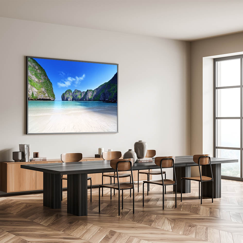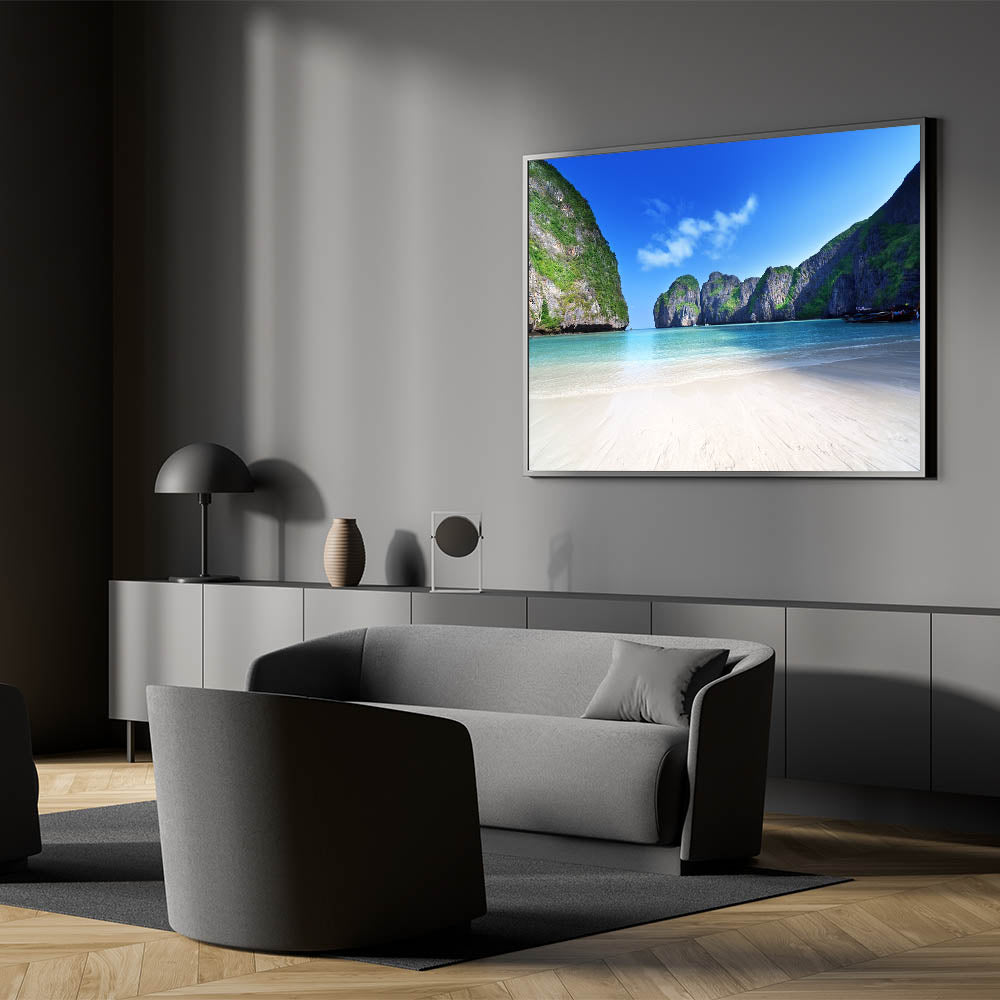 Transform your living space into a tropical retreat with this stunning wall art featuring a secluded cove beach. The artwork captures the serene beauty of clear turquoise waters gently lapping onto a pristine sandy shore, surrounded by towering green cliffs. The deep blue sky adds to the tranquil atmosphere, making this piece perfect for bringing a touch of nature’s calm into your home.