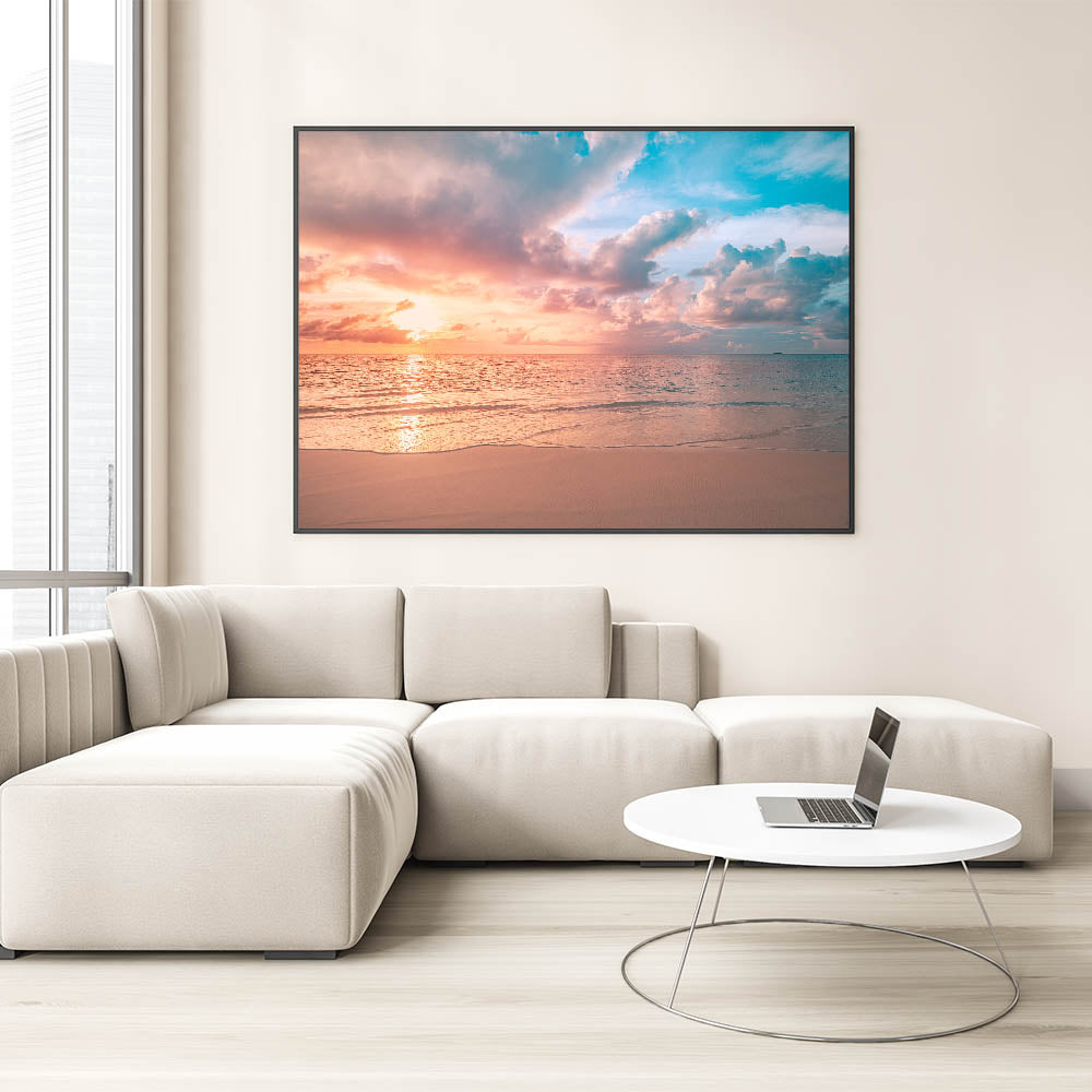 Immerse yourself in the peaceful beauty of a beach sunset with this stunning coastal landscape wall art. This artwork captures the serene moment when the sun dips below the horizon, painting the sky in soft hues of pink, orange, and blue. The tranquil ocean waves gently kiss the shore, creating a calming atmosphere perfect for any room in your home.