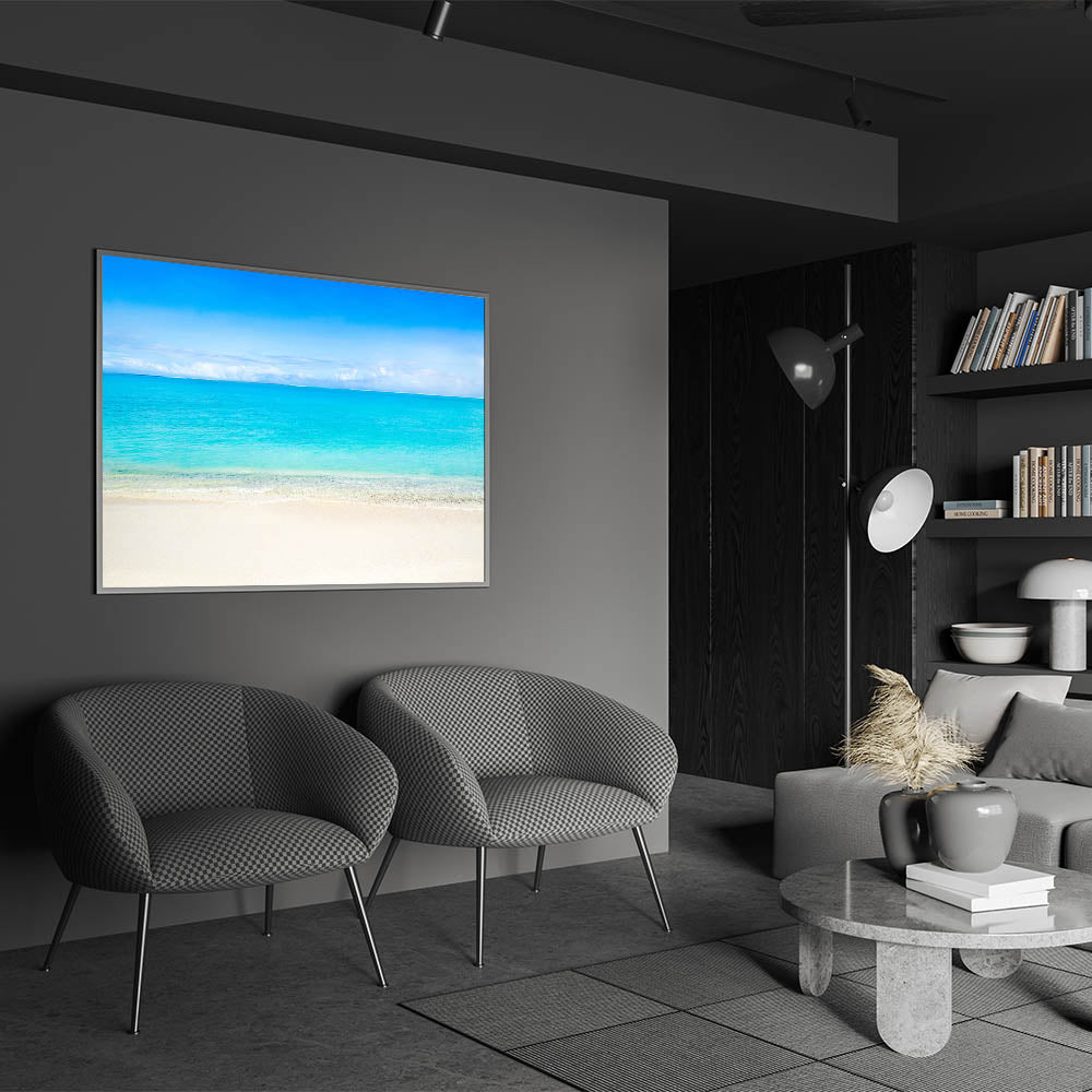 Immerse yourself in the tranquil beauty of Cancun with this stunning beachscape wall art. Featuring a crystal-clear turquoise sea blending with the bright sky, this artwork perfectly captures the essence of Cancun’s serene coastline. The soft waves gently lapping against the sandy shore evoke a sense of calm, making this piece an ideal choice for those looking to bring a touch of relaxation and coastal charm into their space.