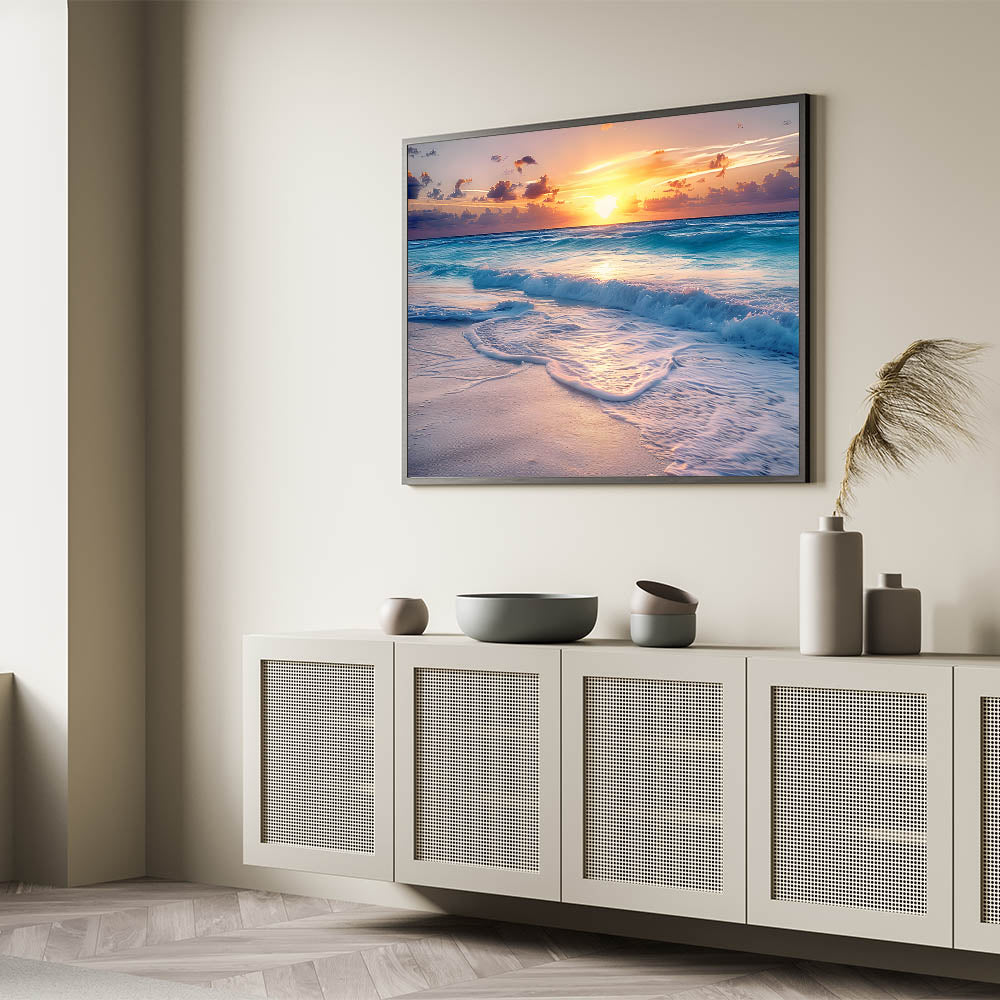 Immerse yourself in the calm and beauty of the ocean with this stunning Cancun sunset beach wall art. Featuring gentle waves washing over the shore as the sun sets, this tranquil scene captures the essence of coastal serenity. The soft pastel hues of the sunset reflecting on the water create a peaceful atmosphere, perfect for adding a soothing touch to any space. Whether you're decorating your living room, bedroom, or office, this high-quality Cancun beach print brings the relaxation of the ocean into your home.