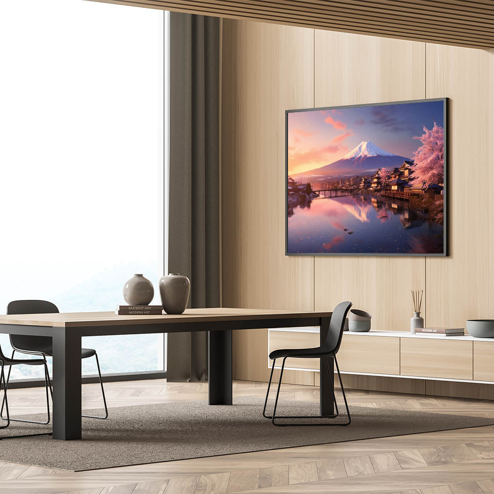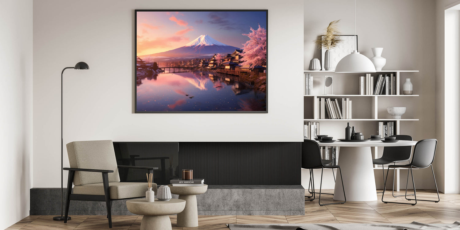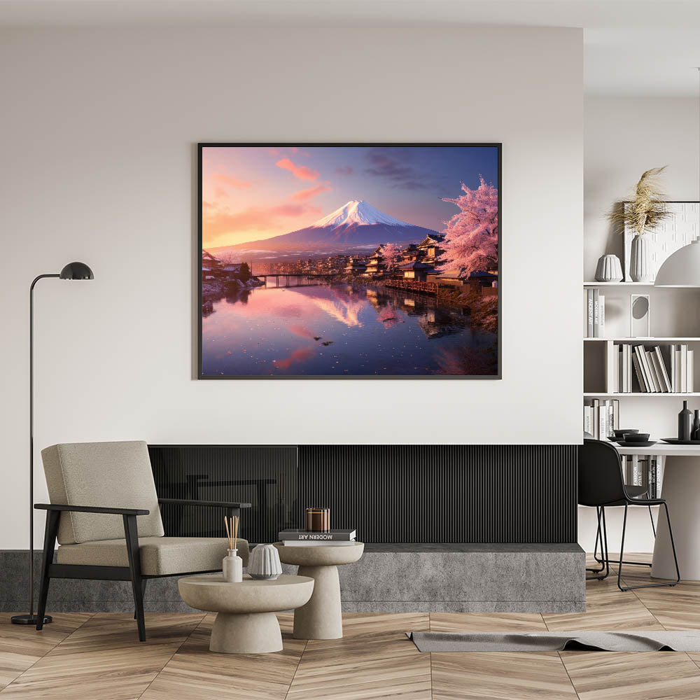 Capture the tranquil beauty of Japan with this breathtaking village landscape painting. The artwork showcases a serene village set against the iconic backdrop of Mount Fuji, with delicate cherry blossoms in full bloom reflecting on the calm waters of a nearby river. The soft hues of the sunrise, combined with the traditional Japanese architecture, create a peaceful and harmonious scene that is perfect for bringing a touch of elegance and calm to any room.