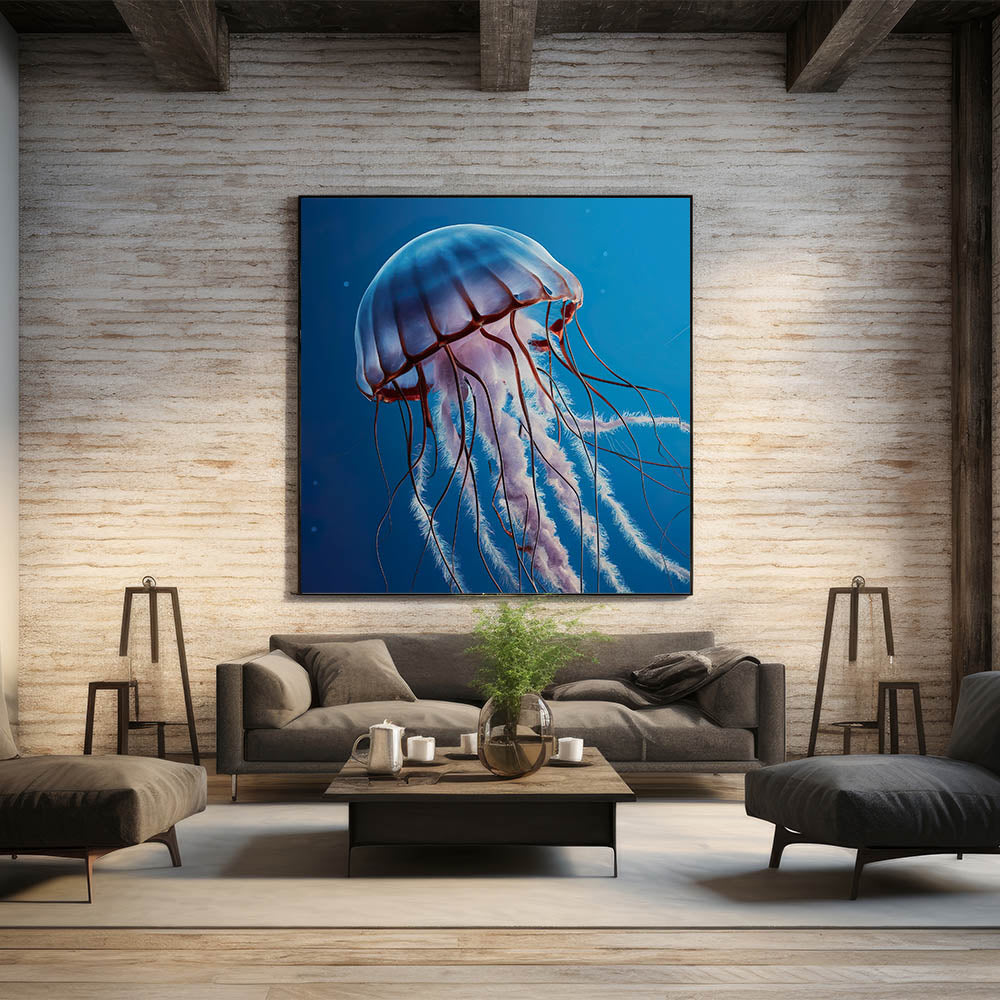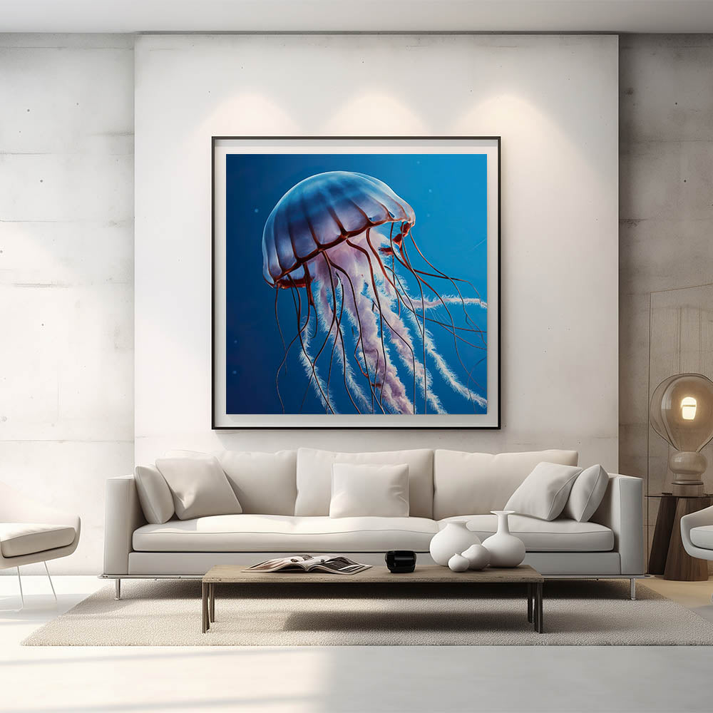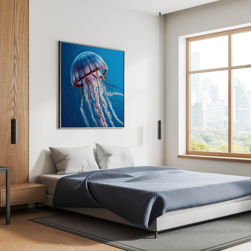 Immerse yourself in the tranquility of the ocean with our Serene Jellyfish Wall Art. This captivating piece features a jellyfish floating peacefully through the calm, deep blue waters. The soft hues and graceful lines of the jellyfish create a soothing visual experience, making this artwork a perfect addition to any space that seeks to evoke a sense of calm and relaxation.