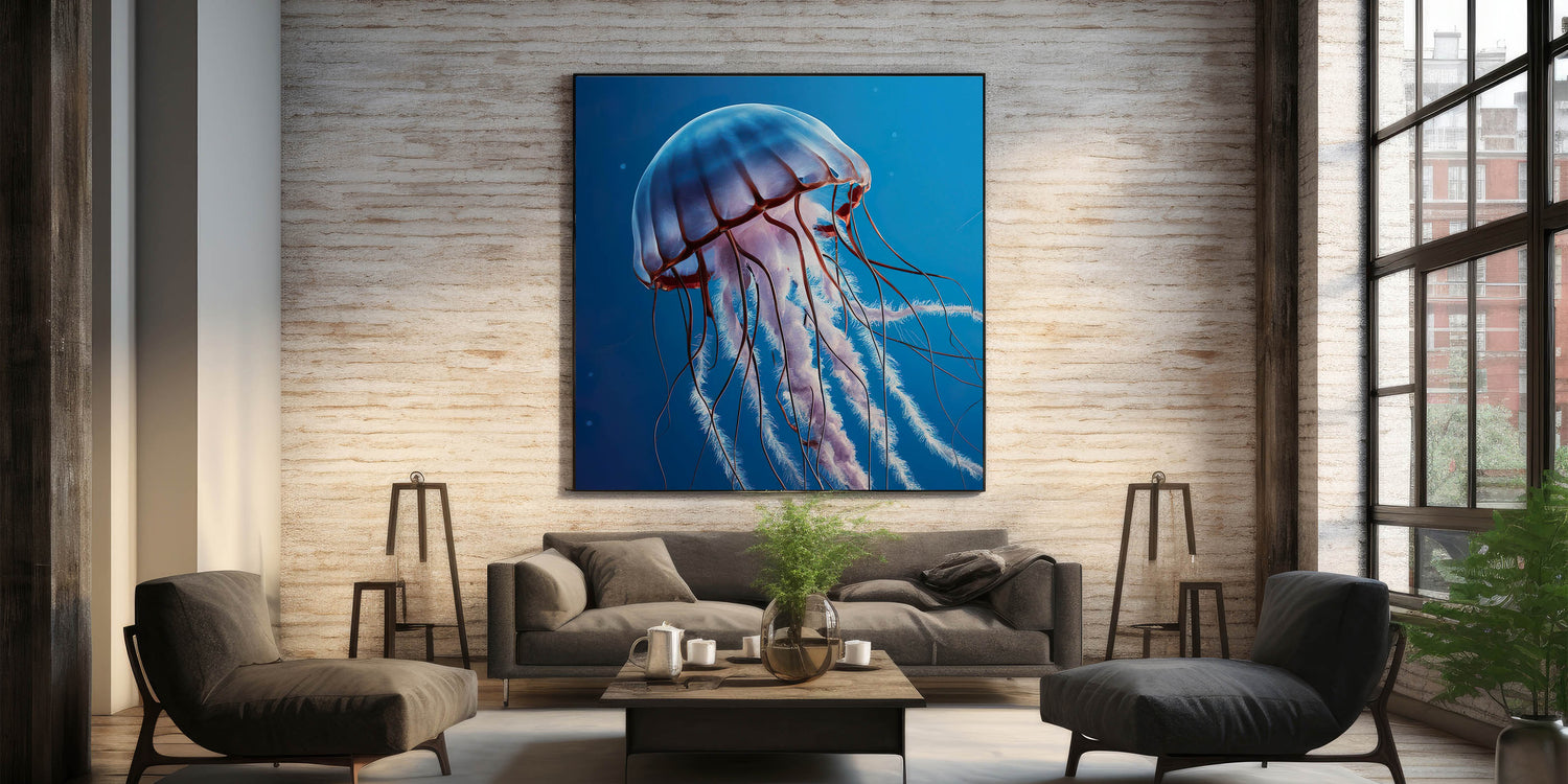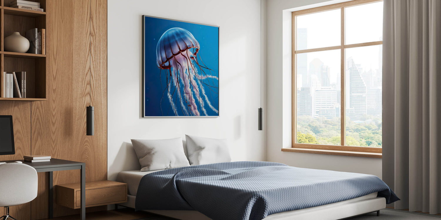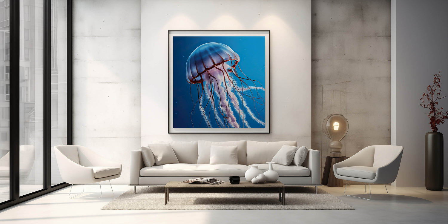 Immerse yourself in the tranquility of the ocean with our Serene Jellyfish Wall Art. This captivating piece features a jellyfish floating peacefully through the calm, deep blue waters. The soft hues and graceful lines of the jellyfish create a soothing visual experience, making this artwork a perfect addition to any space that seeks to evoke a sense of calm and relaxation.