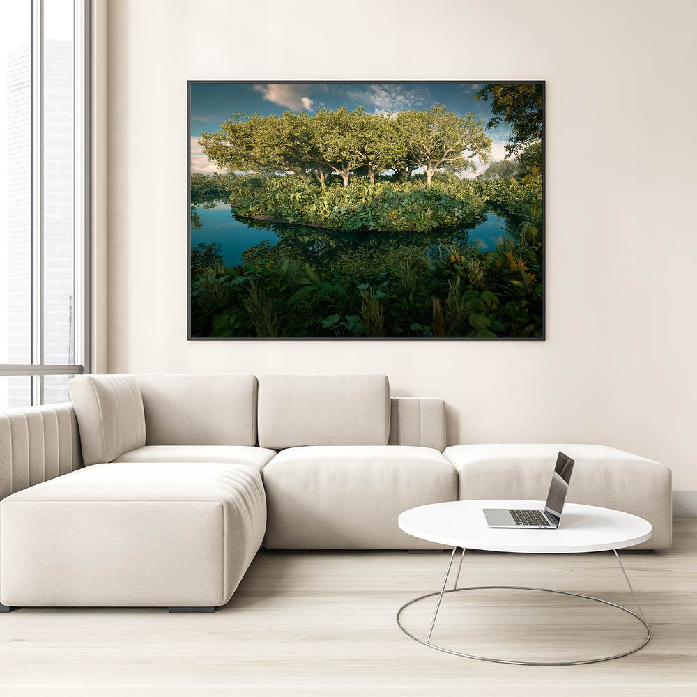 Immerse yourself in the tranquil beauty of the rainforest with this serene wall art. Featuring a peaceful jungle scene with lush greenery and a reflective water body, this artwork captures the essence of nature's calm. The soft light filtering through the trees enhances the sense of serenity, making this piece perfect for creating a peaceful atmosphere in any room.