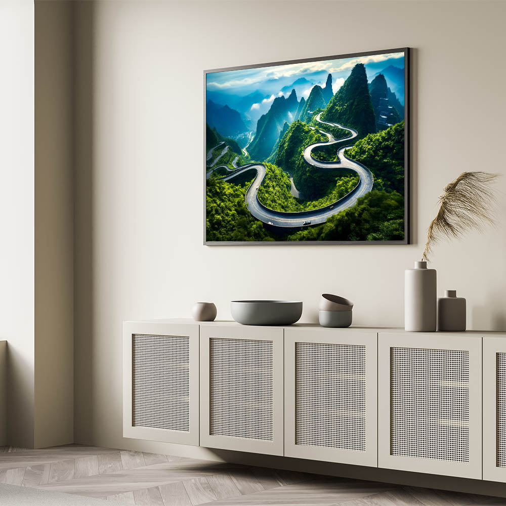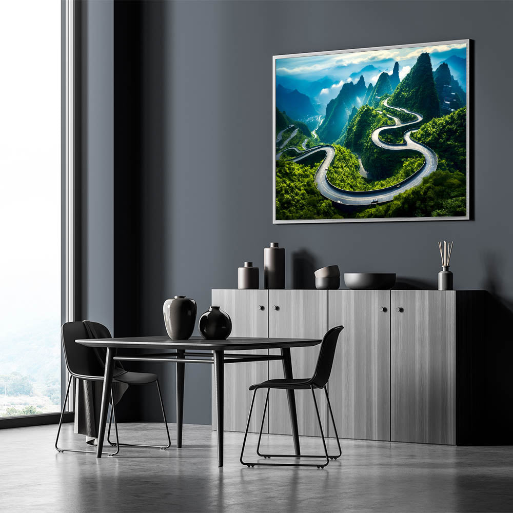 Embark on a visual journey with this breathtaking serpentine mountain road wall art. The image showcases a winding road that weaves through lush, green mountains, offering a stunning view that combines the beauty of nature with the thrill of adventure. Perfect for those who are inspired by the great outdoors and love the sense of exploration, this artwork brings the grandeur of mountain landscapes into your home decor.