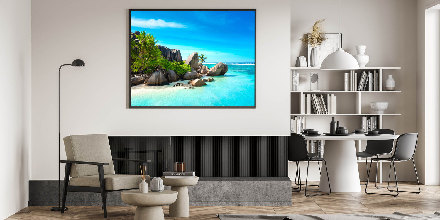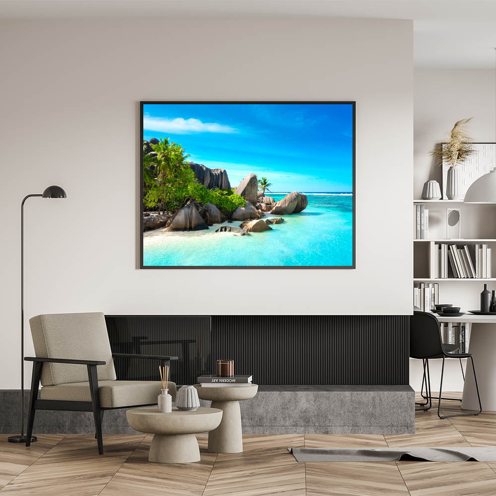 Let this tropical Seychelles beach art bring a touch of island paradise into your decor. Perfect for living rooms, bedrooms, or offices, this piece captures the vibrant beauty of a tropical getaway and adds a sense of calm and relaxation to any space.