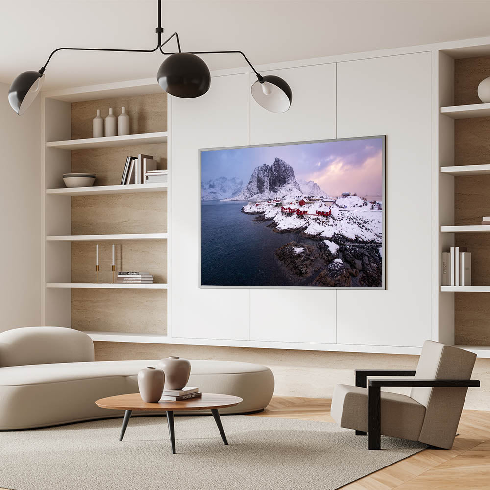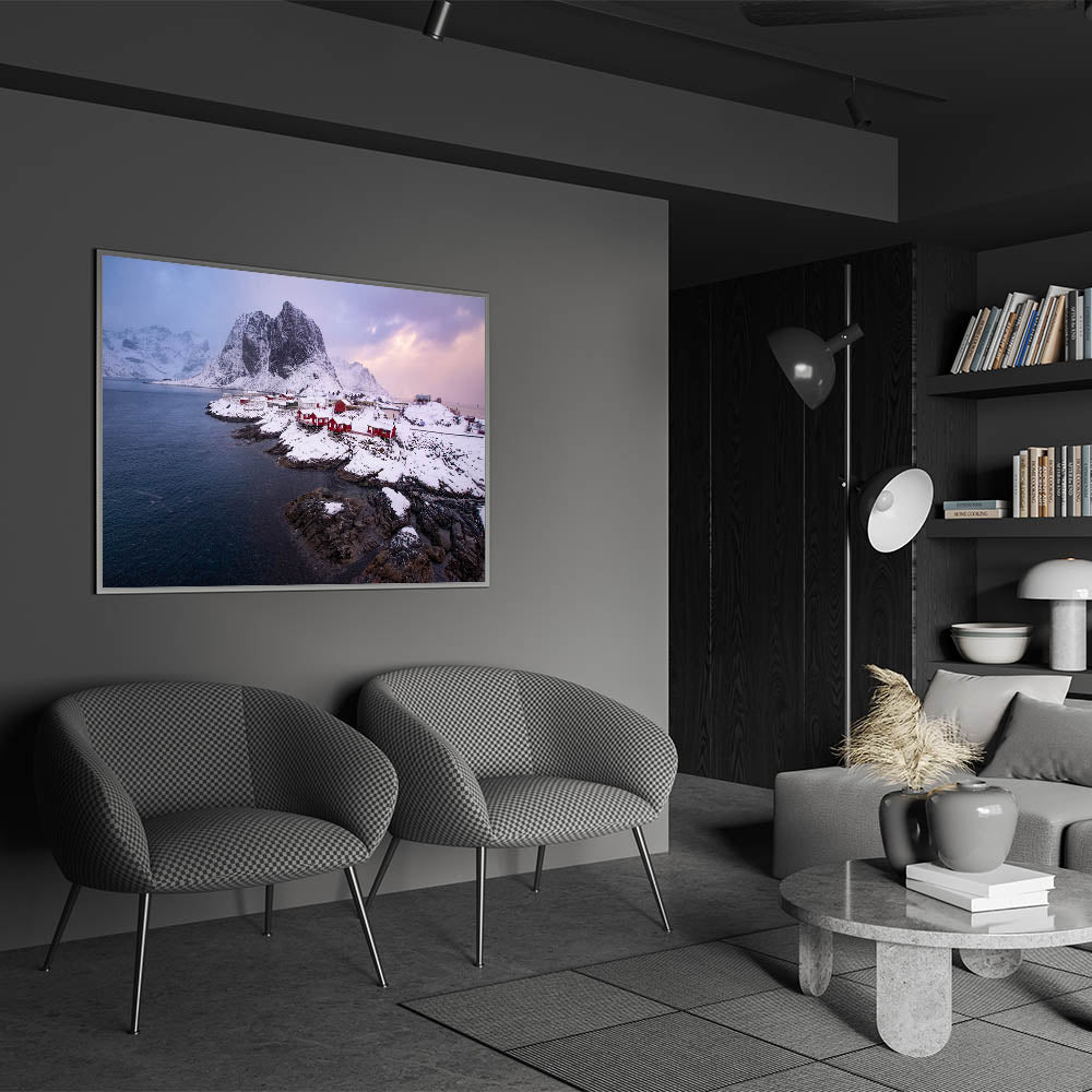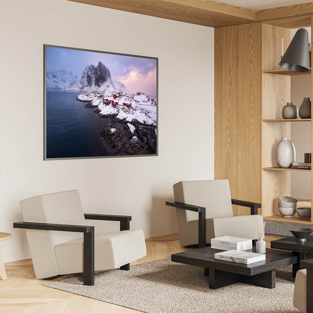 This Idyllic village canvas print invites you to enjoy the serene beauty of a Nordic winter. It's an ideal piece for those who love the calm and pristine landscapes of the far north, making it a perfect addition to your winter decor.