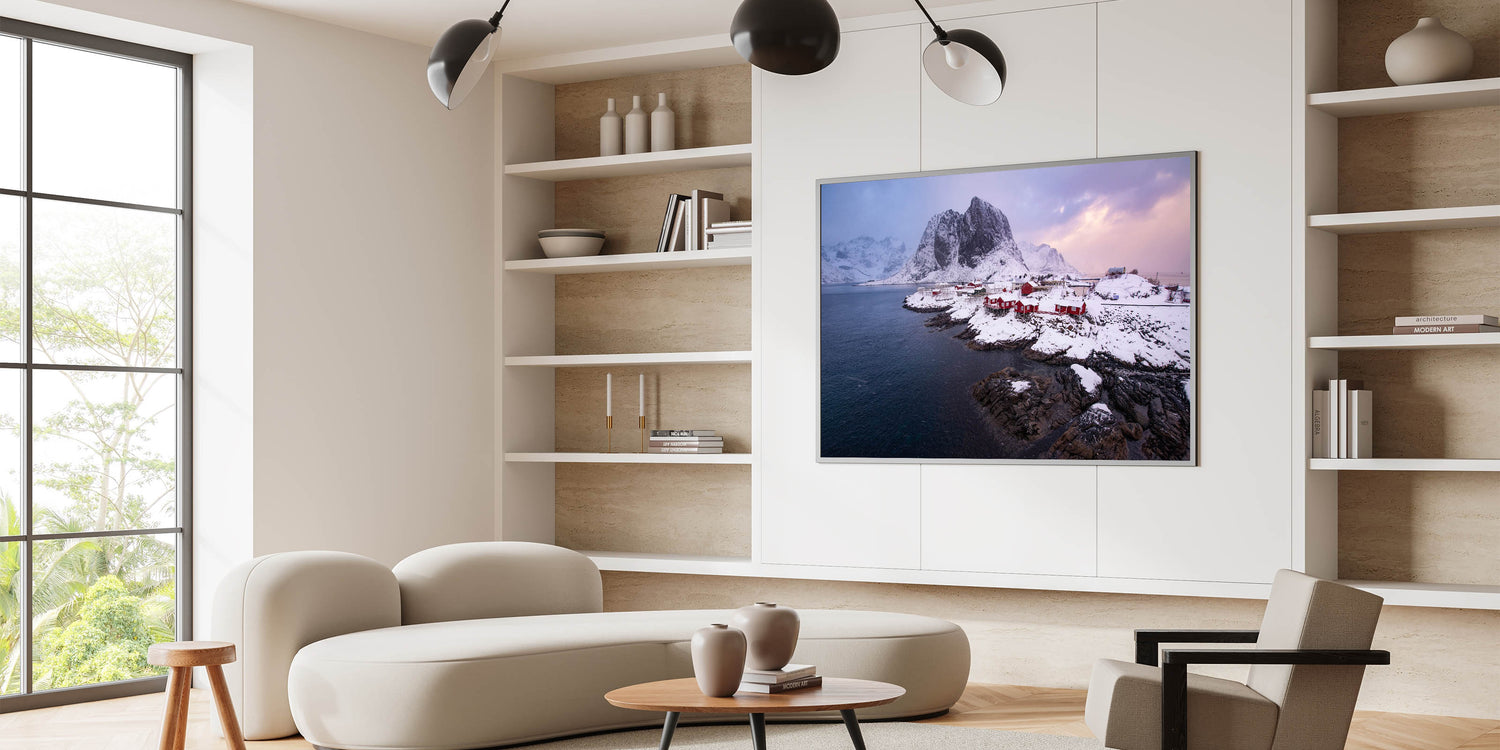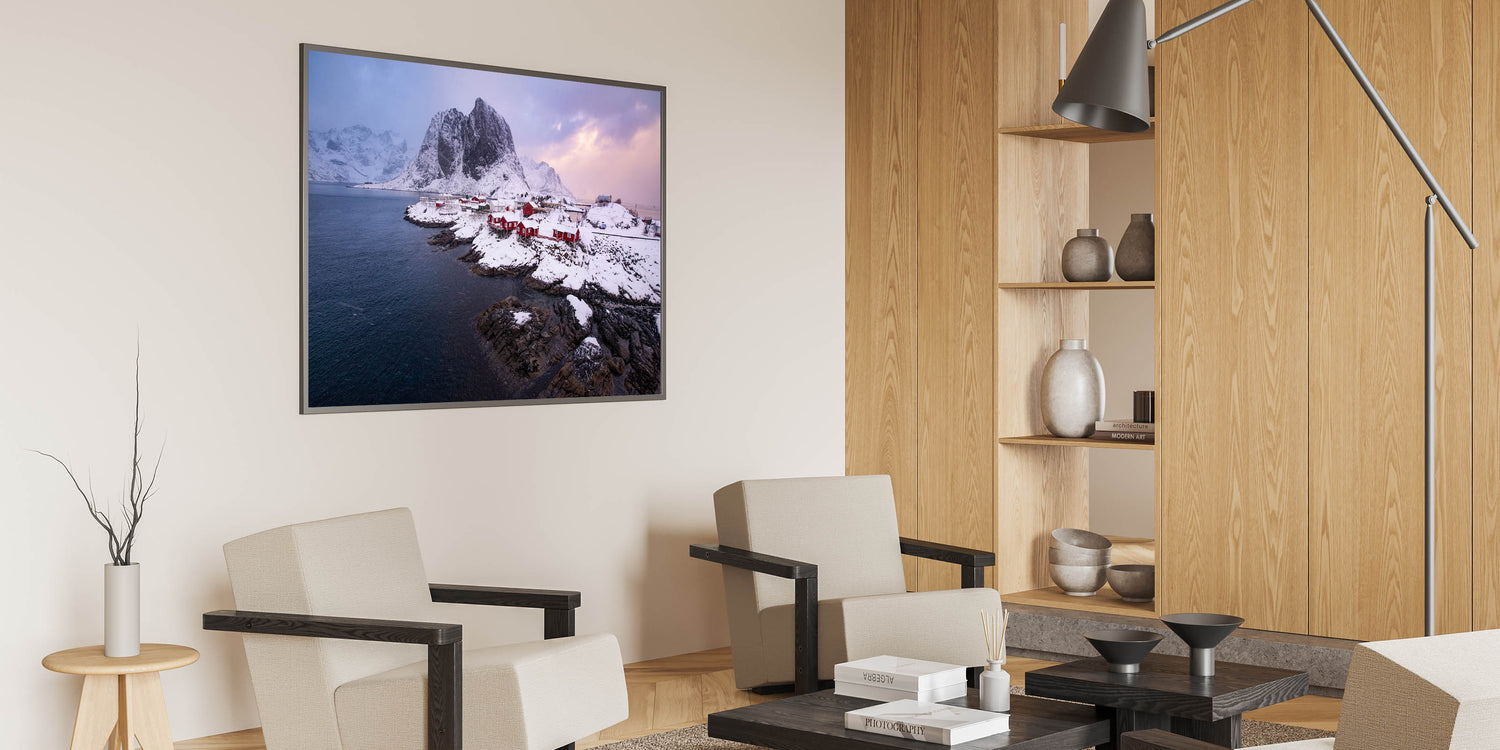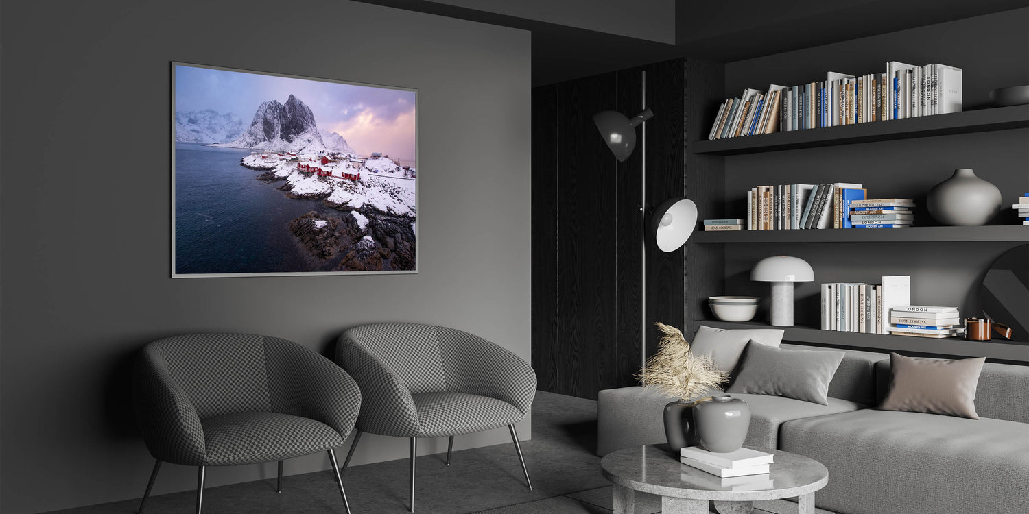This Idyllic village canvas print invites you to enjoy the serene beauty of a Nordic winter. It's an ideal piece for those who love the calm and pristine landscapes of the far north, making it a perfect addition to your winter decor.