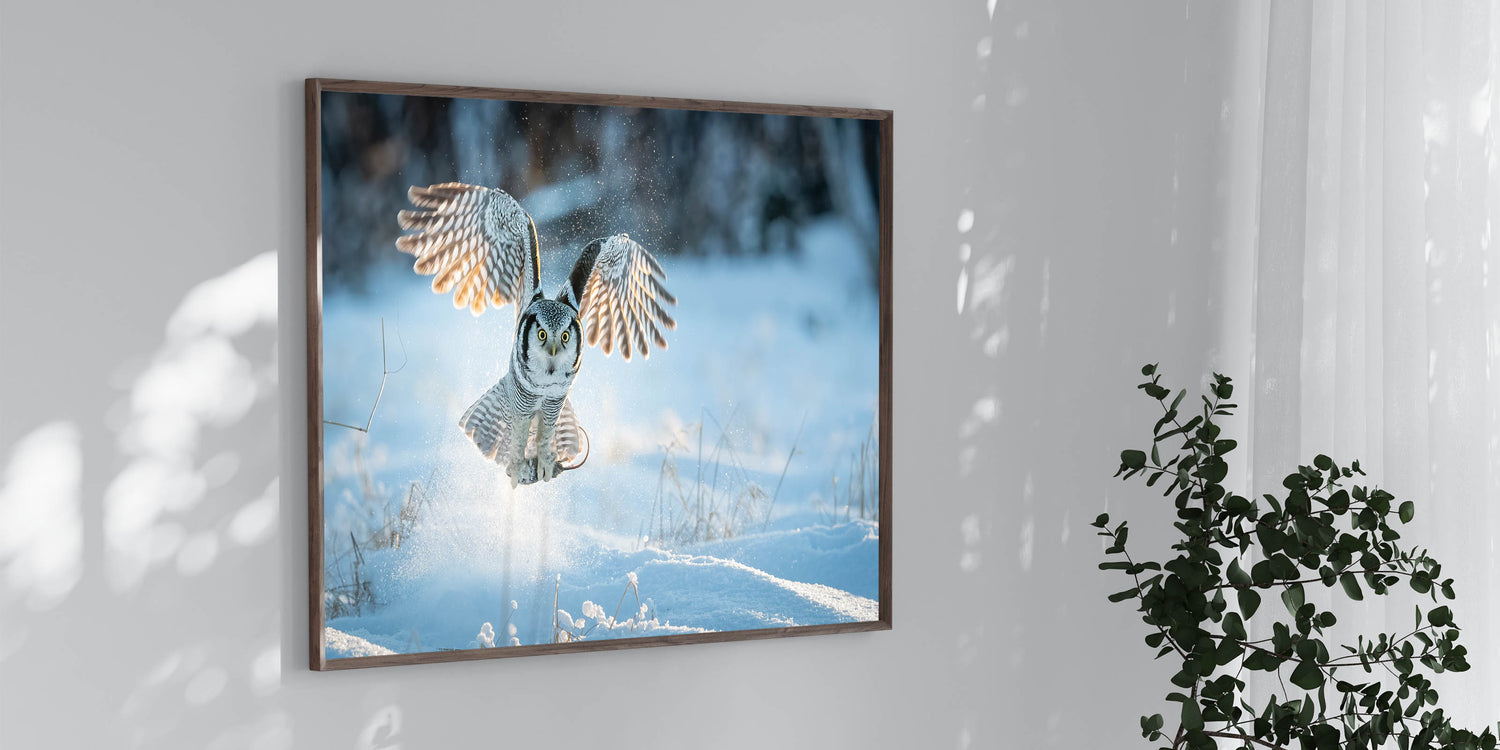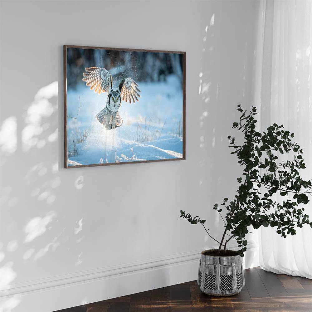 This piece is perfect for nature lovers and those who appreciate the quiet strength of winter landscapes. The contrast between the owl's detailed plumage and the crisp, bright snow creates a visually stunning composition that will add a touch of wilderness and serenity to any room.