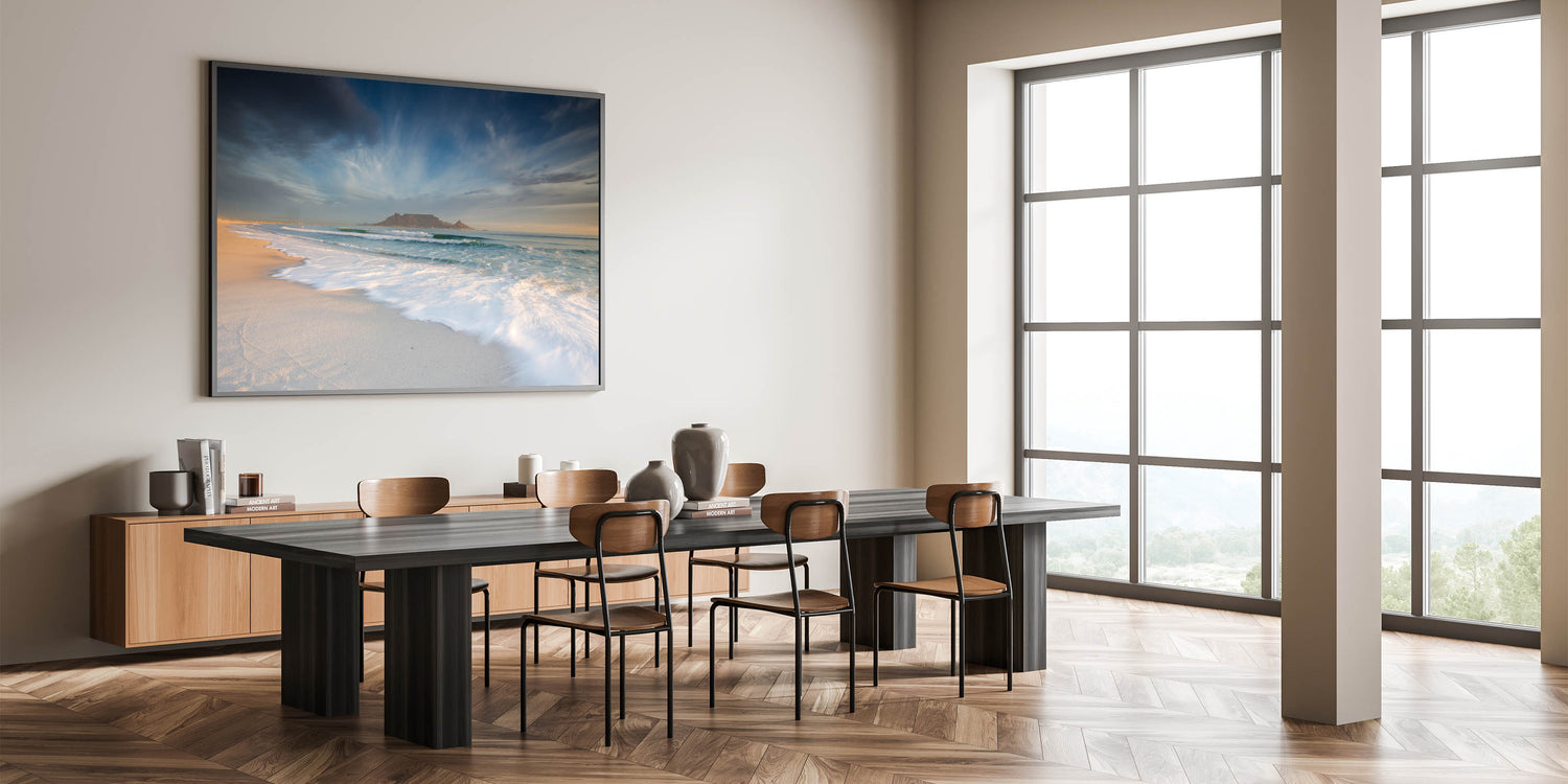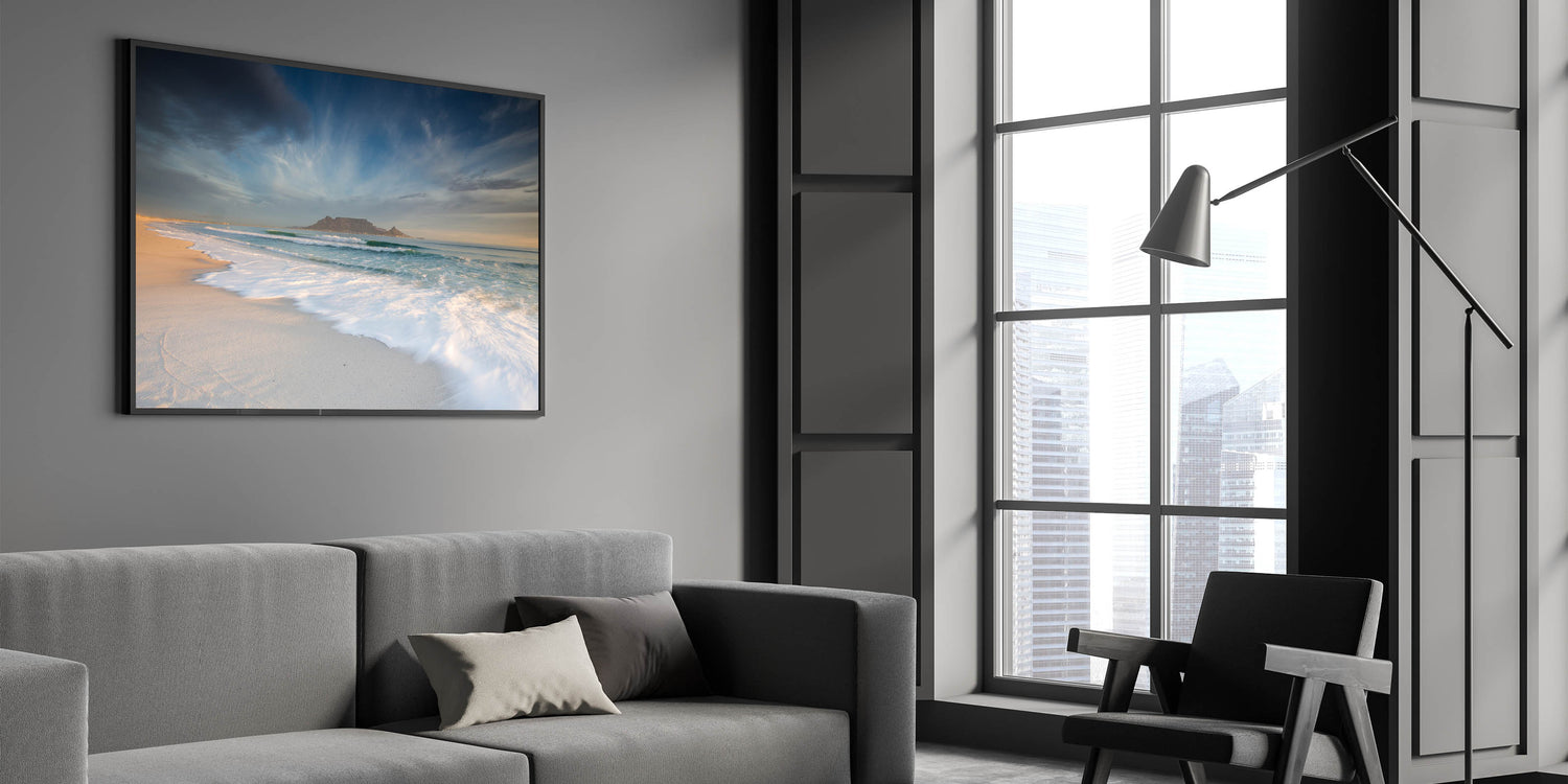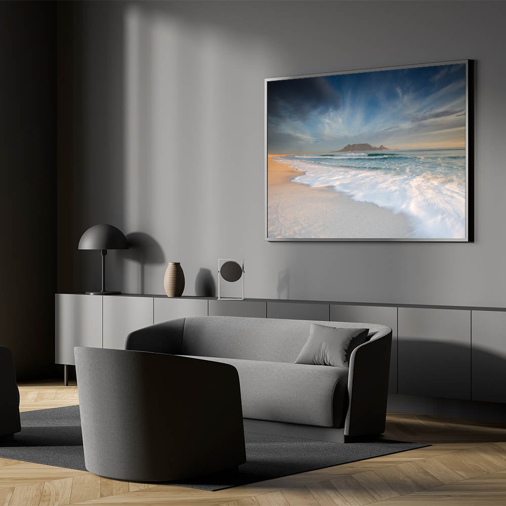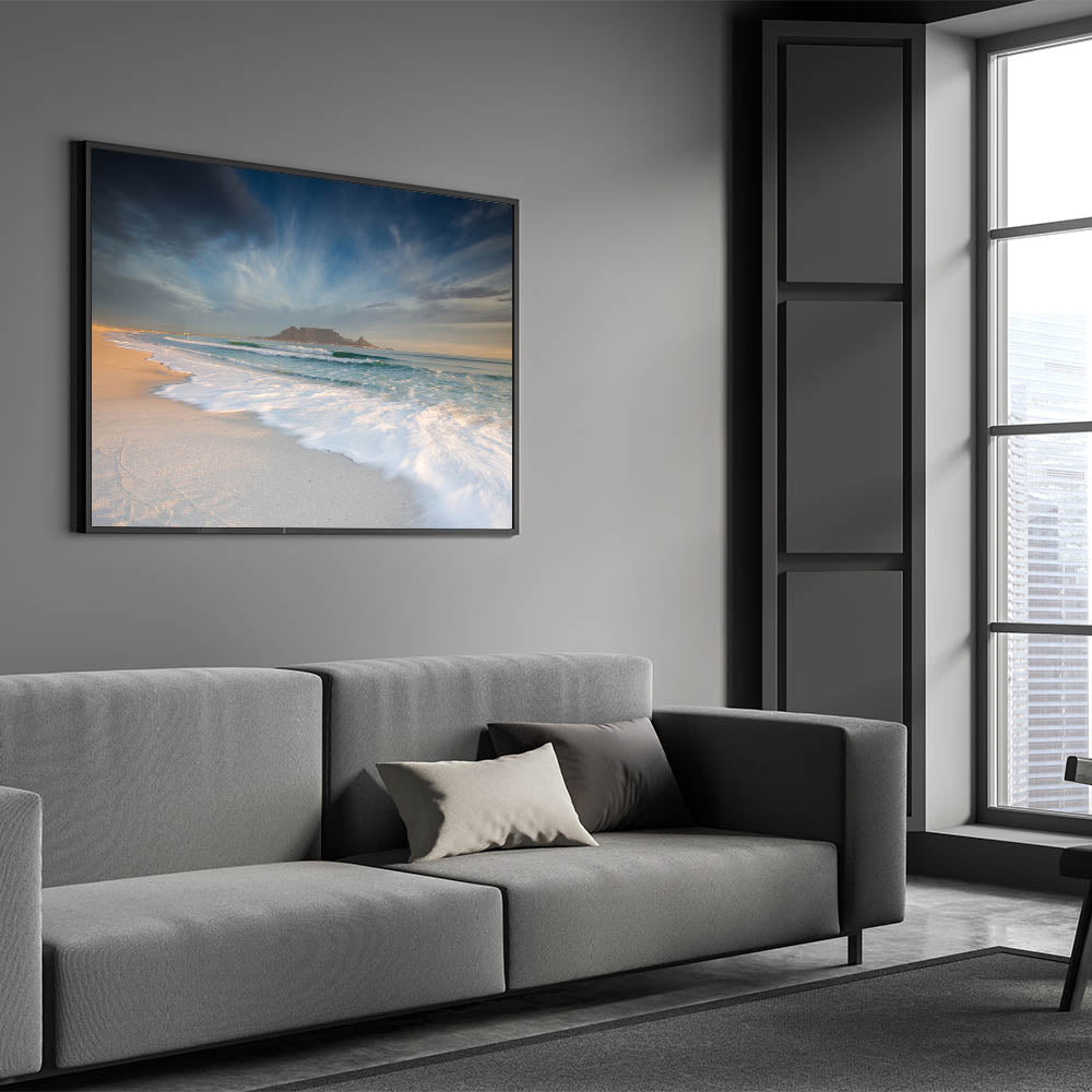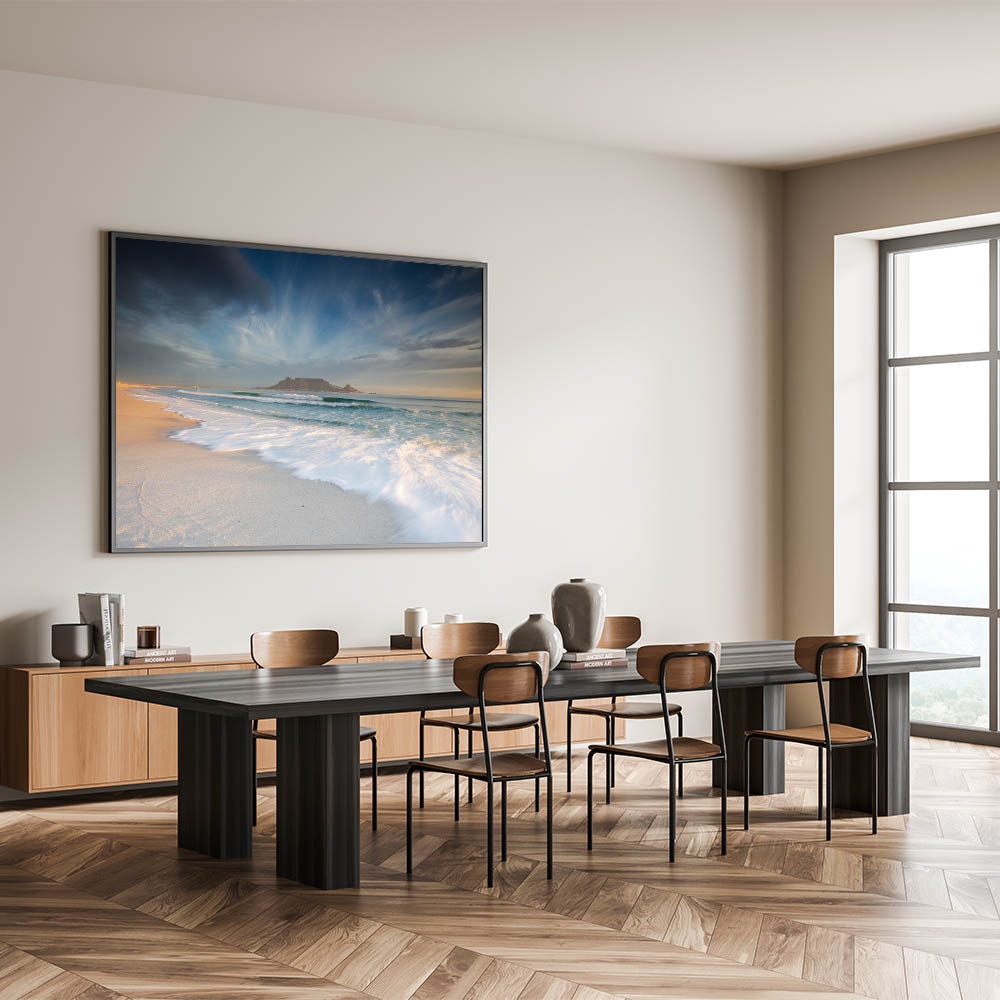 Embrace the peaceful beauty of South Africa with this calming beach scene wall art, featuring the iconic Table Mountain in the distance. The soft waves gently lapping against the shoreline, the expansive sky, and the golden sands create a sense of serenity and stillness, making it a perfect addition to any room needing a tranquil touch. This artwork beautifully captures the essence of Cape Town’s natural beauty and peaceful coastlines.