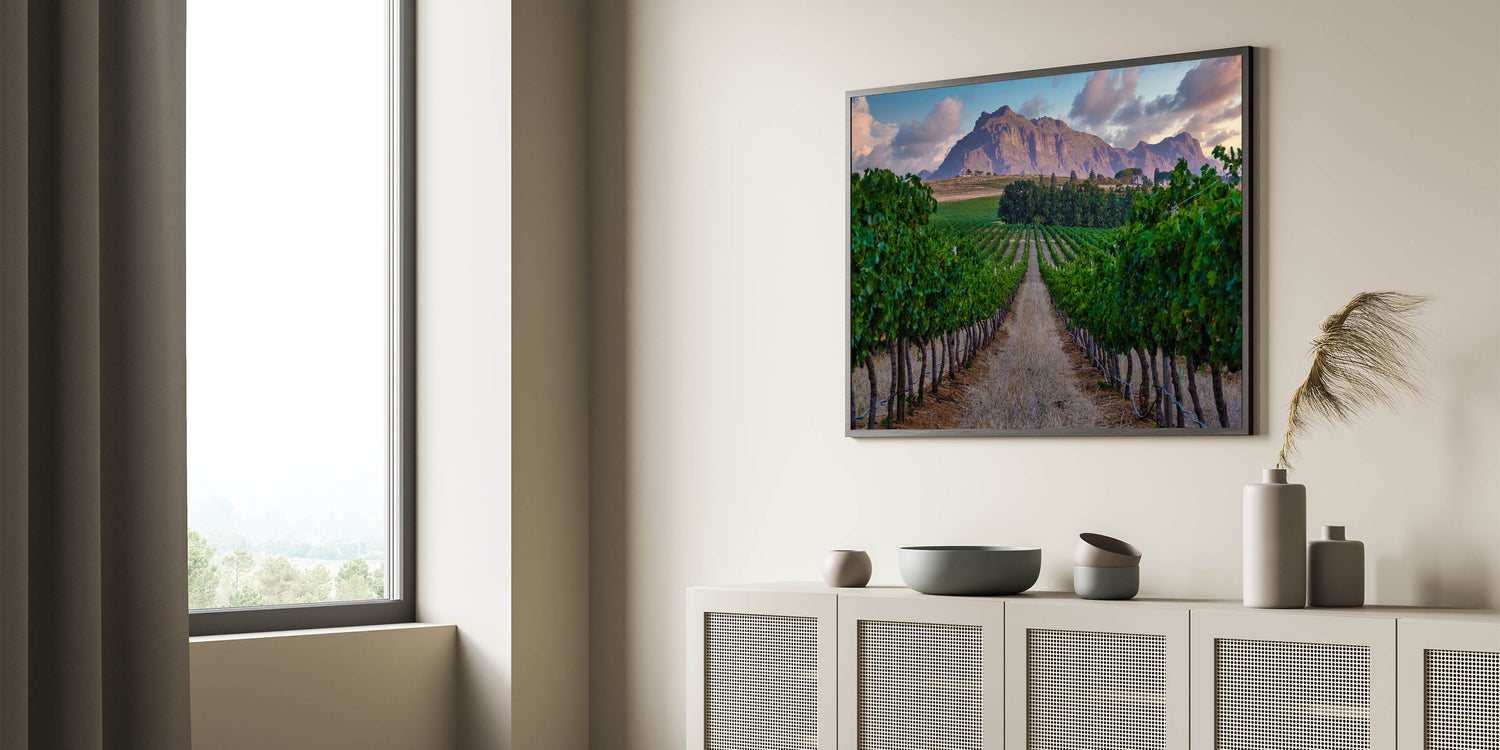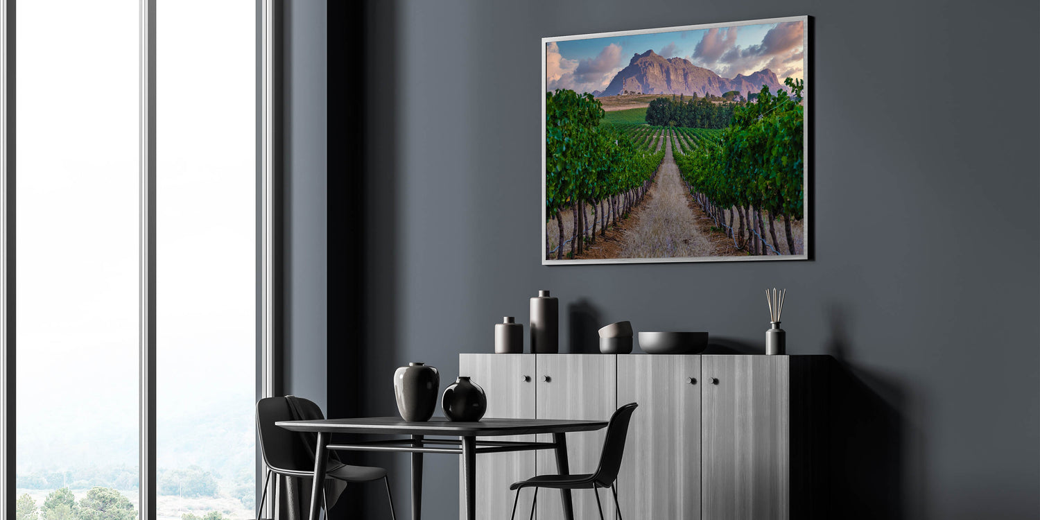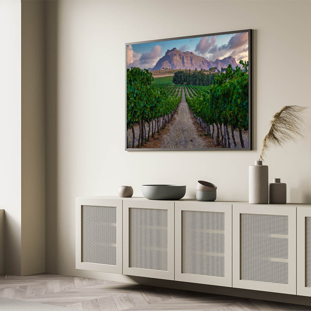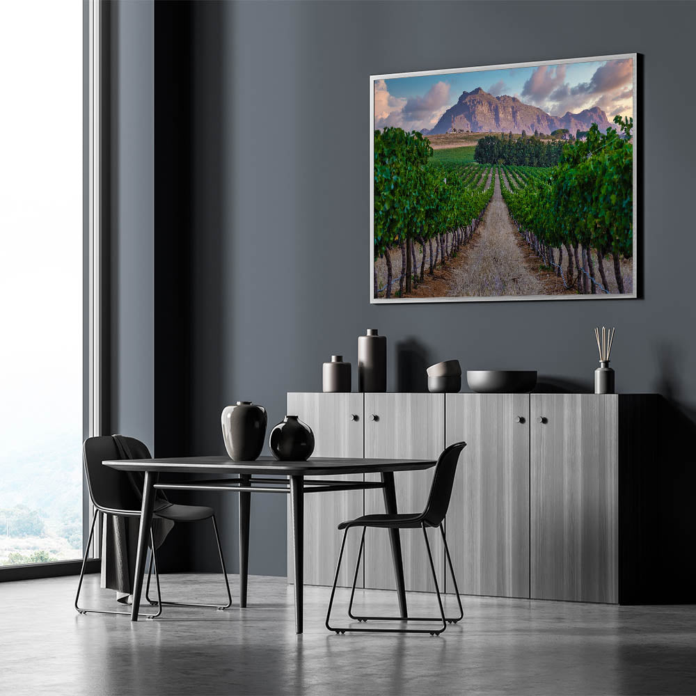 Whether you're a fan of wine country or simply appreciate the peaceful beauty of South African landscapes, this print is sure to captivate and bring a sense of calm to any space.
