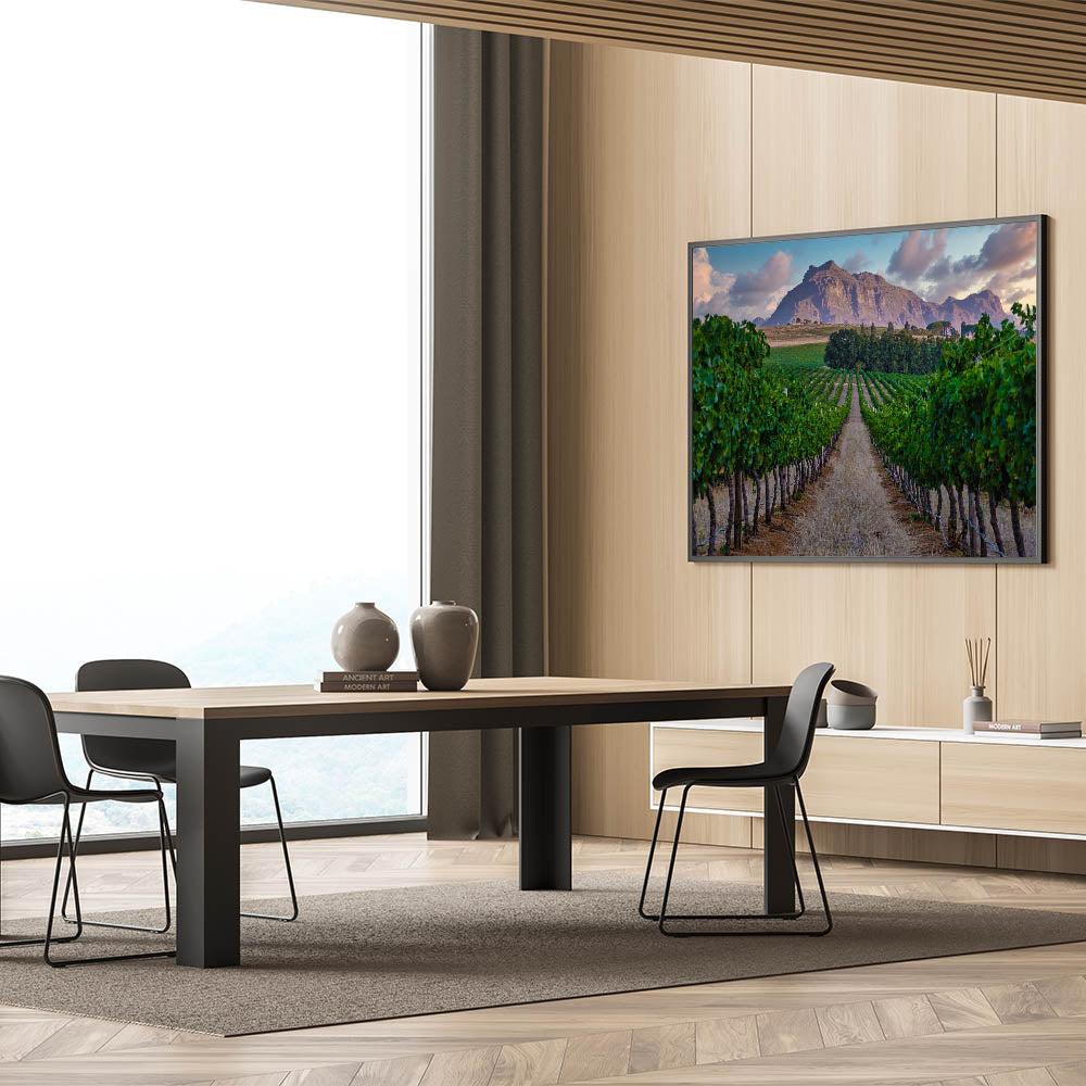 Immerse yourself in the beauty of South Africa’s wine country with this stunning landscape print, capturing the lush vineyards set against a majestic mountain backdrop. The rows of vibrant green vines stretch into the distance, creating a sense of serenity and harmony with nature. This artwork is perfect for wine lovers, nature enthusiasts, or anyone looking to bring the calming beauty of the countryside into their home decor.