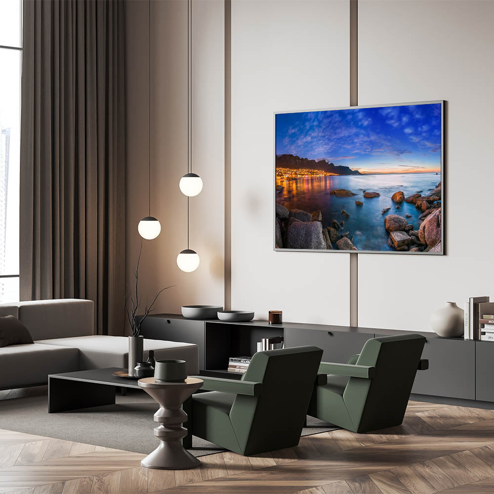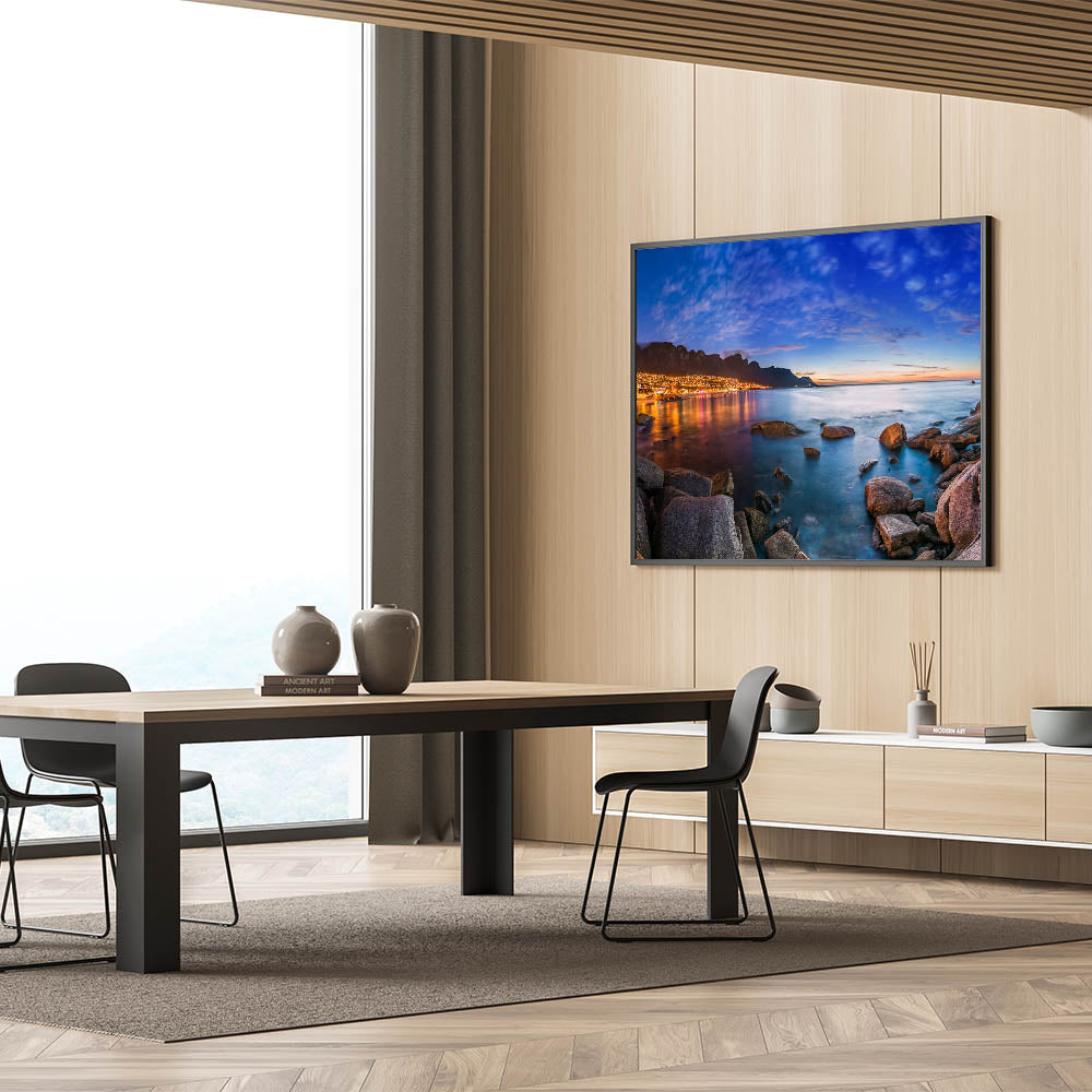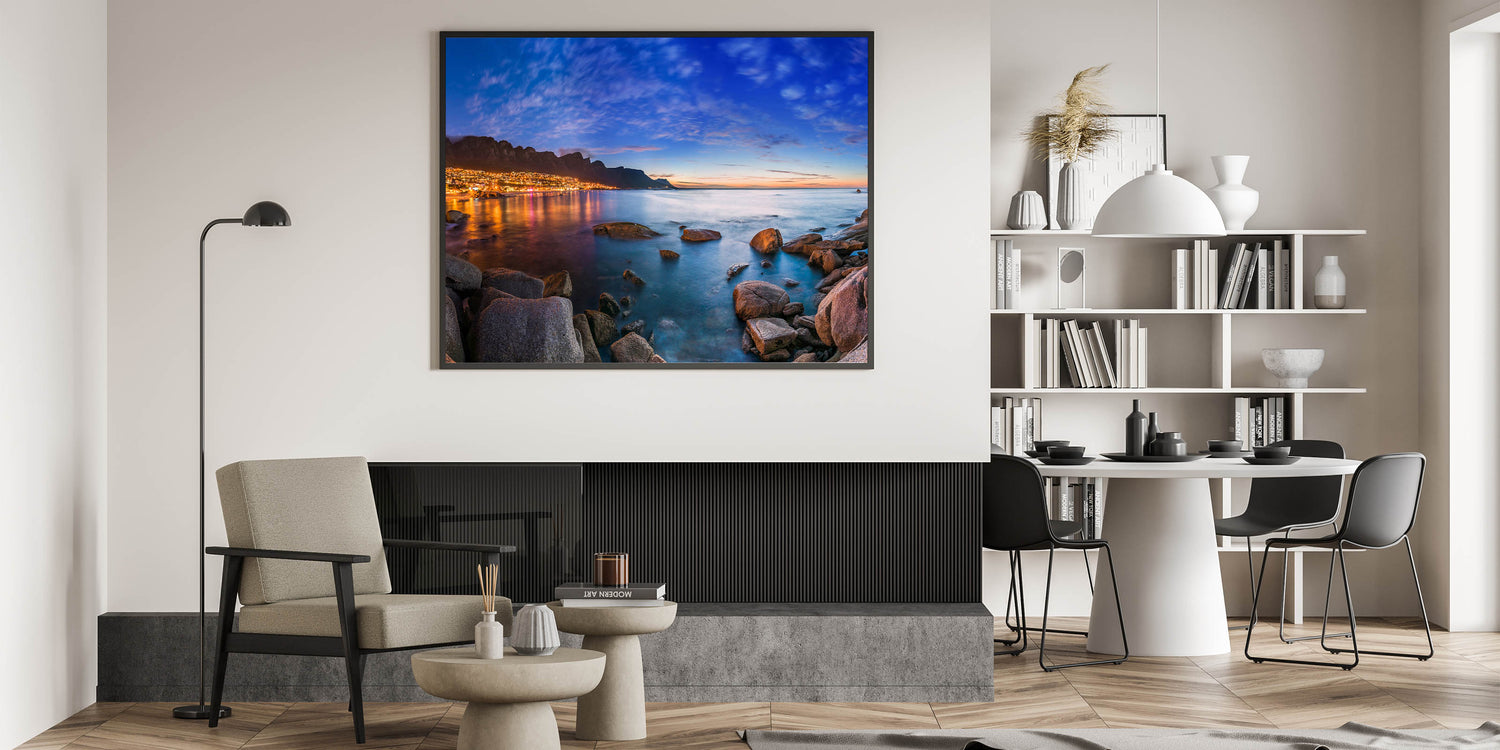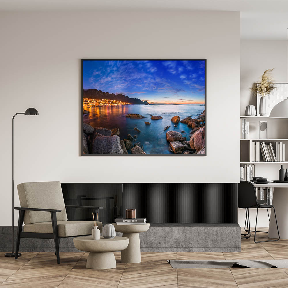 Transform your space with the captivating beauty of South Africa’s coastal nightlife. This stunning wall art showcases the tranquil waters of Cape Town, reflecting the warm glow of city lights as dusk falls. The contrast between the rocky shoreline and the illuminated city creates a mesmerizing scene that brings both serenity and vibrancy into your home. The rich blues of the night sky and the shimmering lights create a perfect blend of natural and urban beauty.