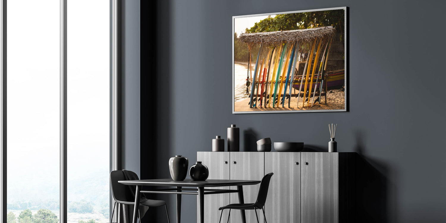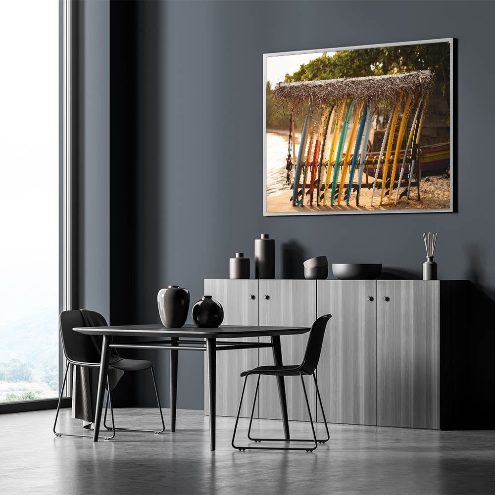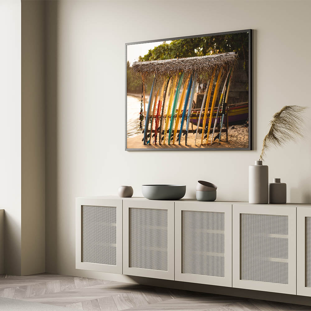 This vibrant Sri Lanka photography print features a colorful collection of surfboards lined up against a traditional thatched hut, set on a serene tropical beach. The golden hues of the sunset highlight the playful colors of the surfboards, adding a warm, tropical vibe to any room. This Sri Lanka canvas art perfectly encapsulates the island’s laid-back beach culture and coastal beauty, making it an ideal piece for lovers of the ocean and tropical living.
