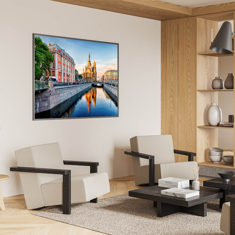 Elevate your interior design with this iconic view of St. Petersburg Street Scenes Wall Art, showcasing one of the city's most famous landmarks reflected in the calm waters of the canal.