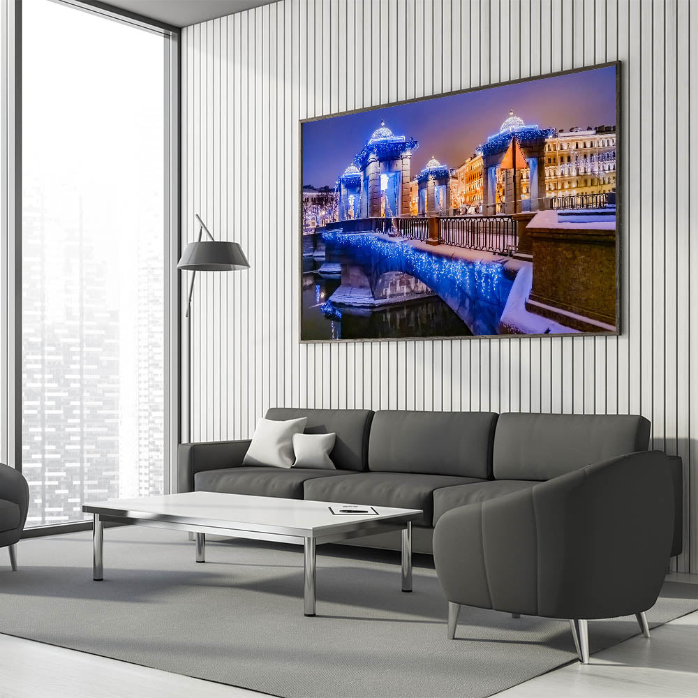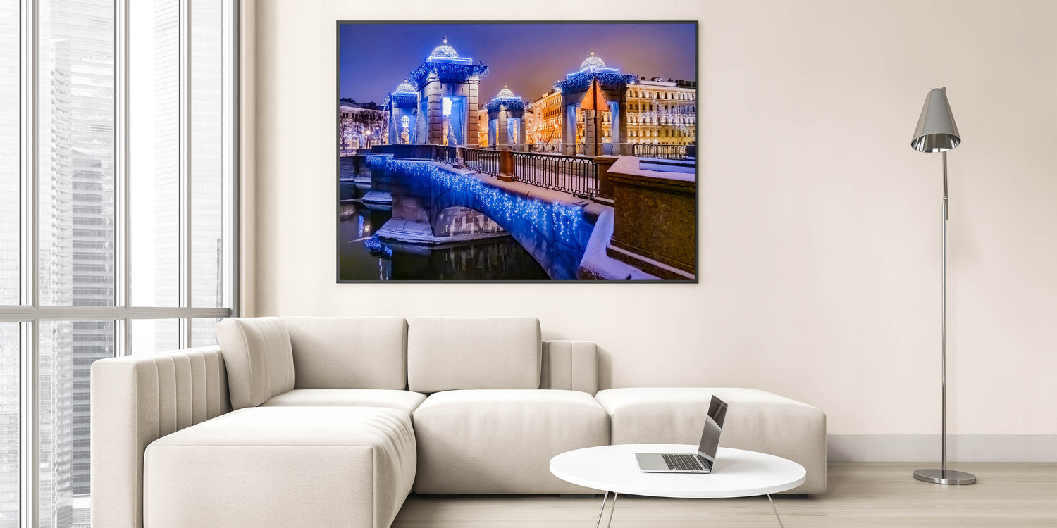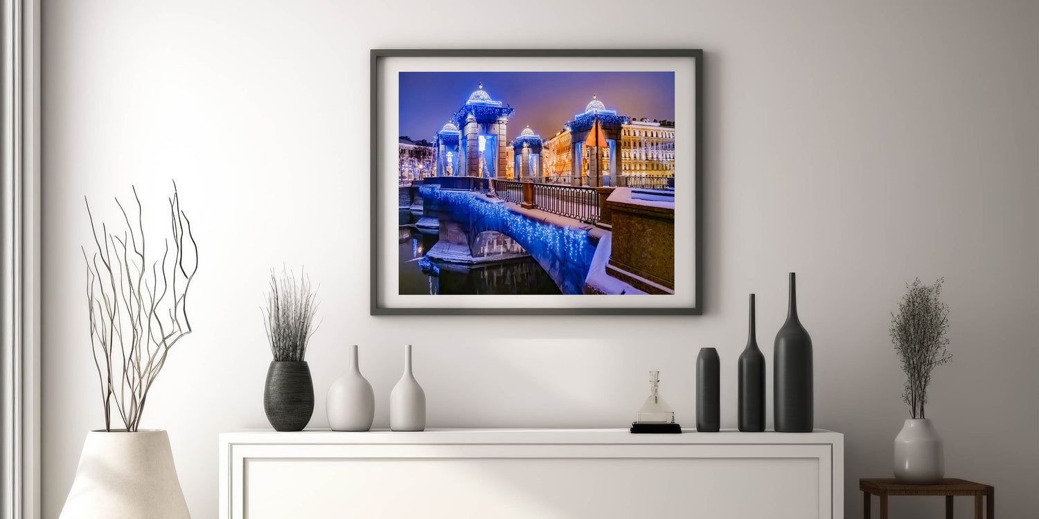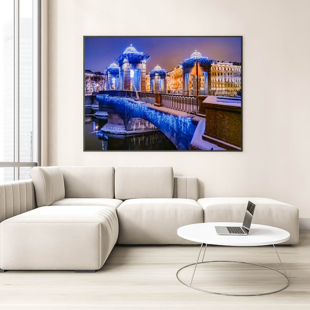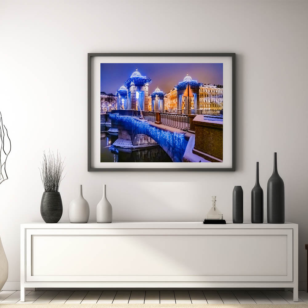 This St. Petersburg Wall Art captures the enchanting glow of a winter evening in the city. The scene features an illuminated bridge adorned with twinkling lights, casting a warm and inviting ambiance across the snow-covered landscape. The vibrant colors of the lights against the deep blues of the night sky and the snowy streets make this St. Petersburg Cityscape Art a captivating piece for any space. This artwork perfectly reflects the festive and serene beauty of St. Petersburg during the winter months.