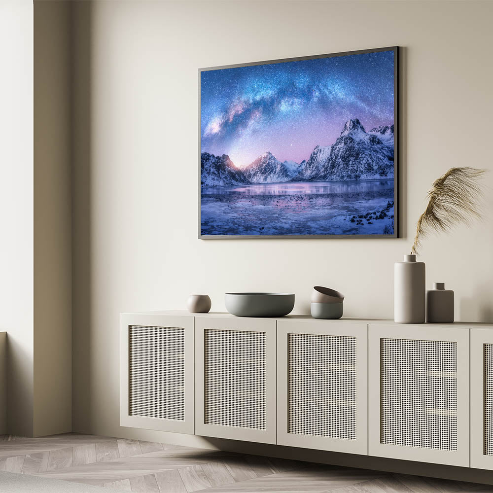 Step into a world of wonder with this captivating starry night mountain art. The breathtaking view of snow-capped mountains under a brilliant, star-filled sky creates a scene that is both magical and serene. The soft glow of the Milky Way stretches across the sky, casting a mystical light over the icy landscape below. This winter landscape print is perfect for adding a touch of enchantment to any room, making it an ideal piece for those who appreciate the beauty of the night sky and the tranquility of winter.