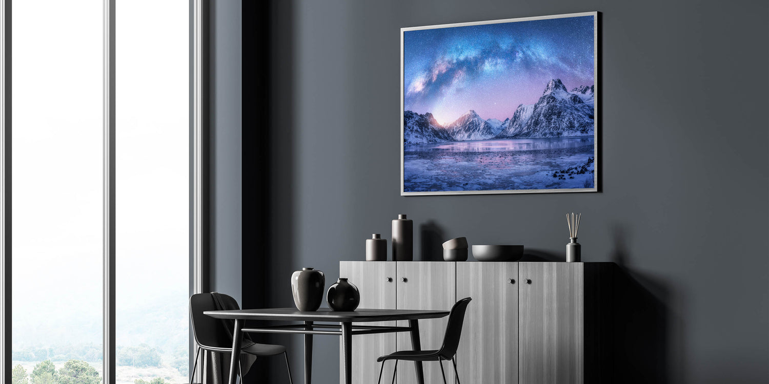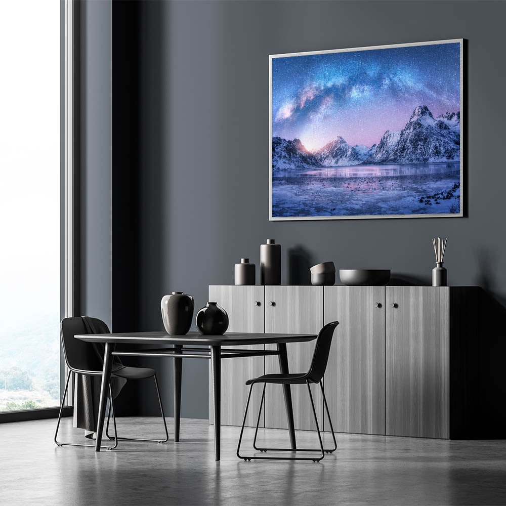 Transform your home with this enchanting mountain artwork. The combination of the starry sky and the majestic mountains creates a peaceful and awe-inspiring atmosphere that will captivate anyone who sees it. Order now to bring this magical landscape into your home.
