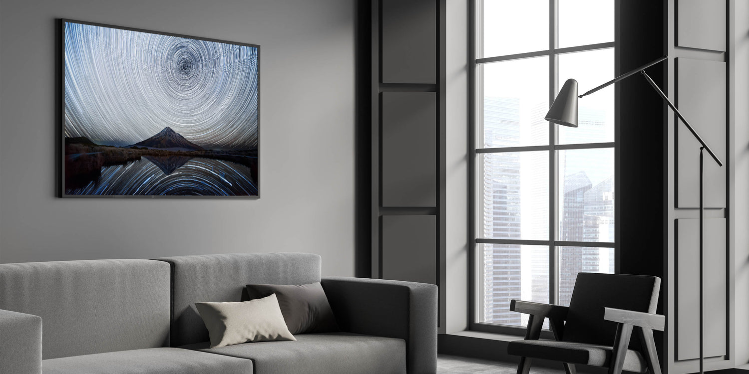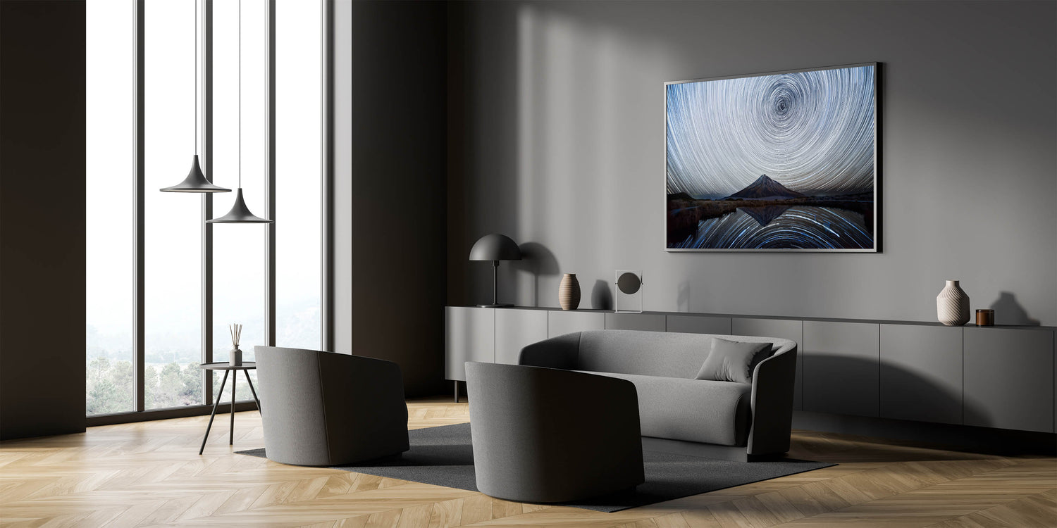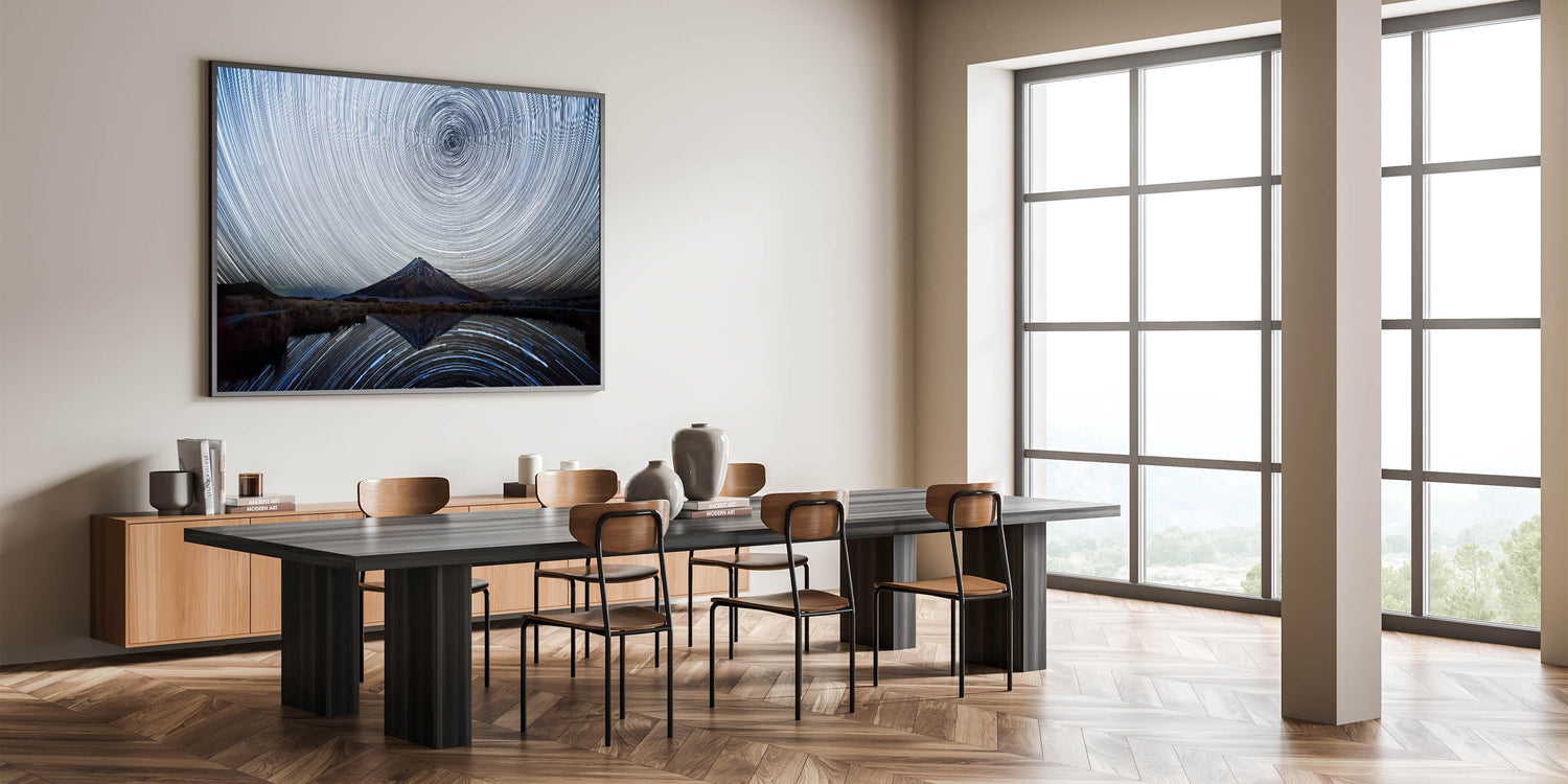 Elevate your home decor with this captivating starry sky artwork. The swirling stars and the serene mountain reflection create a tranquil yet awe-inspiring atmosphere that will make any room feel like a gateway to the cosmos. Order today to bring this stunning nightscape into your home.