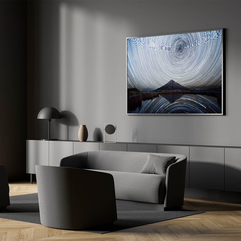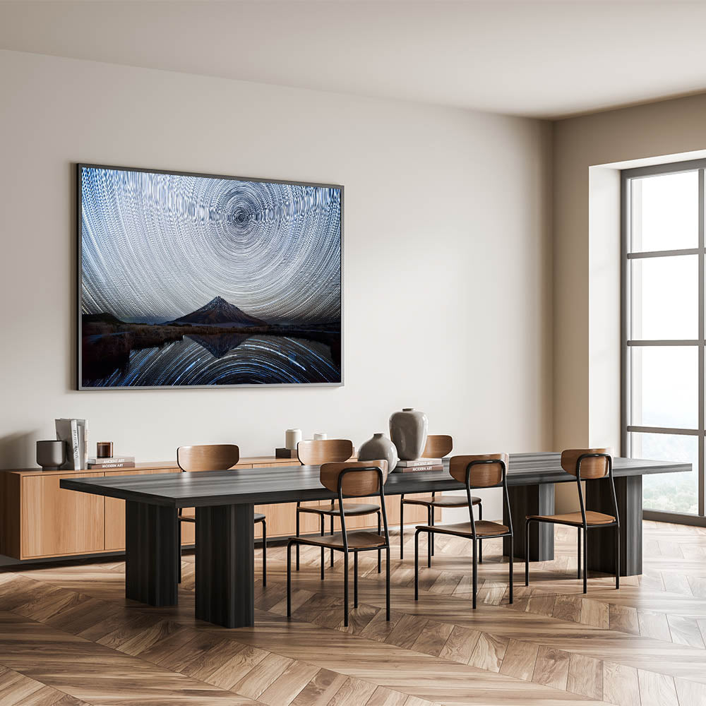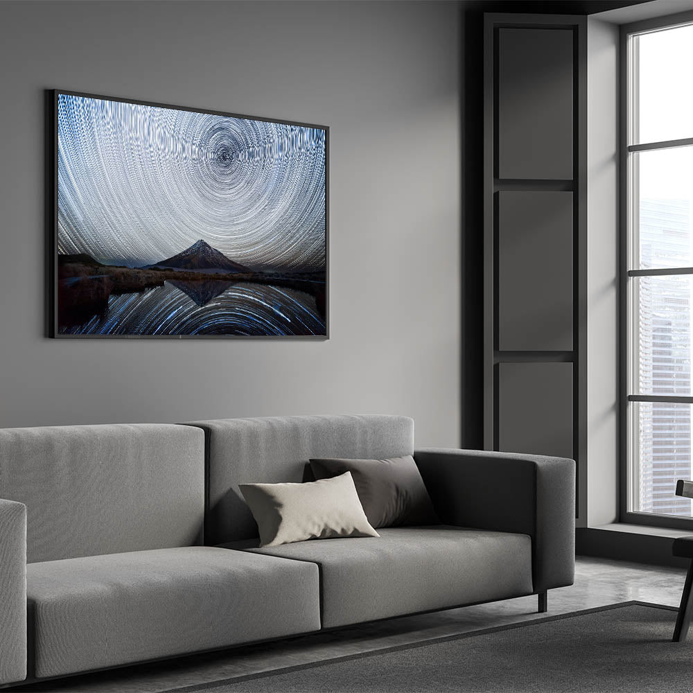 Dive into the cosmic wonder of the night with this mesmerizing starry sky spiral art. The captivating spiral trails of stars, centered above a solitary mountain peak, create a hypnotic visual effect that draws you into the depths of the universe. The mountain, reflected perfectly in the still waters below, adds to the surreal and enchanting atmosphere of this nightscape. This stunning piece is perfect for those who appreciate the mysteries of the night sky and want to bring a touch of cosmic beauty into their home.