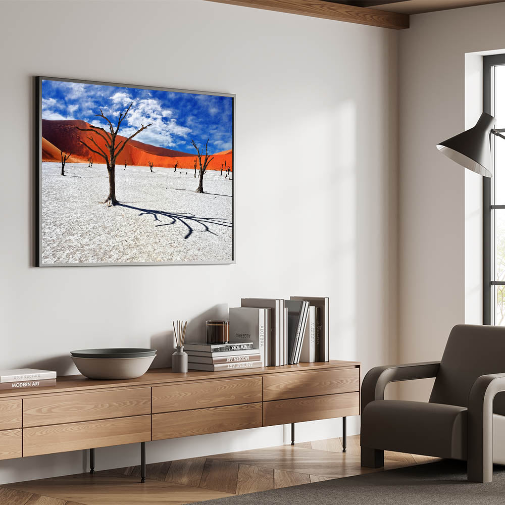 Bring the raw beauty of Namibia into your space with this striking wall art, showcasing the hauntingly beautiful landscape of dead trees set against the vivid orange dunes and a crisp blue sky. This Namibian landscape photography captures the stark contrasts and surreal beauty of one of Africa's most iconic deserts, making it a perfect piece for those who appreciate the rugged and untamed aspects of nature.