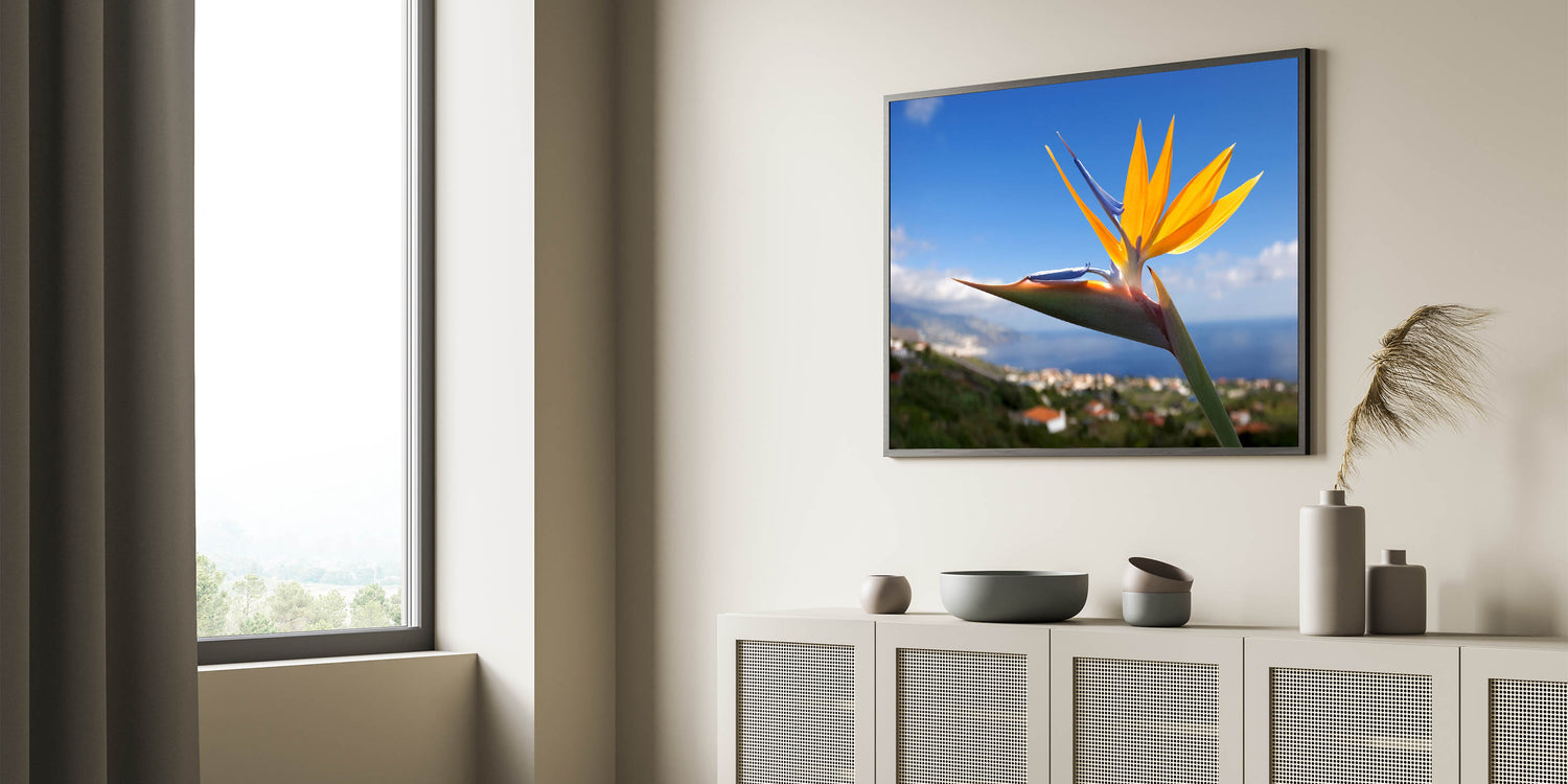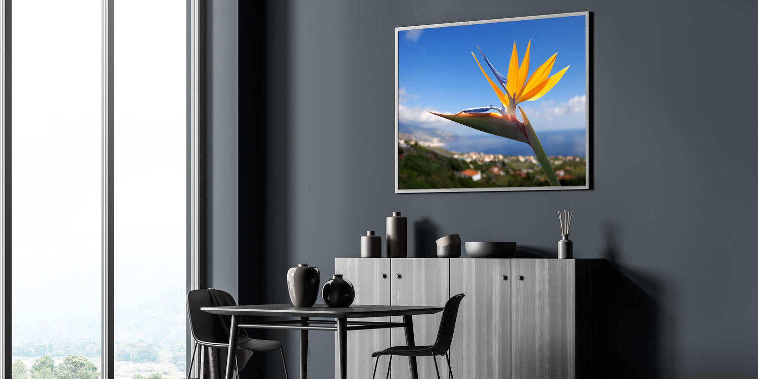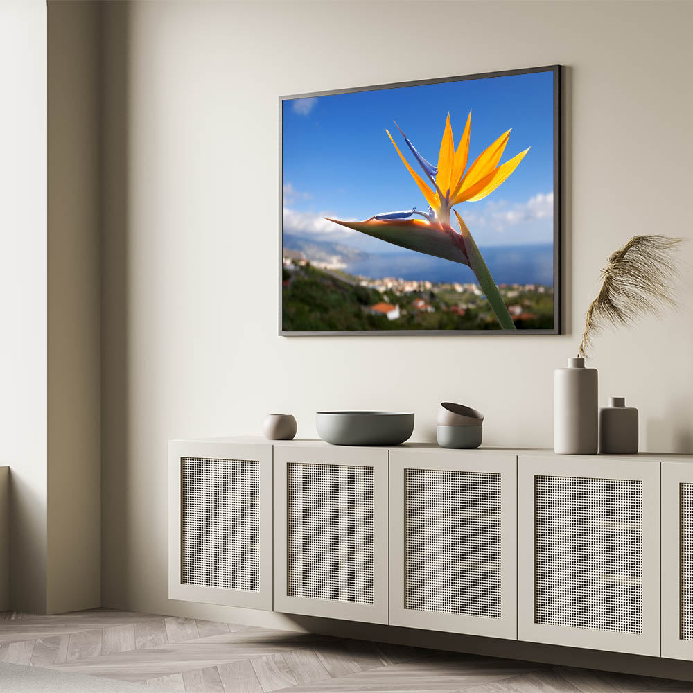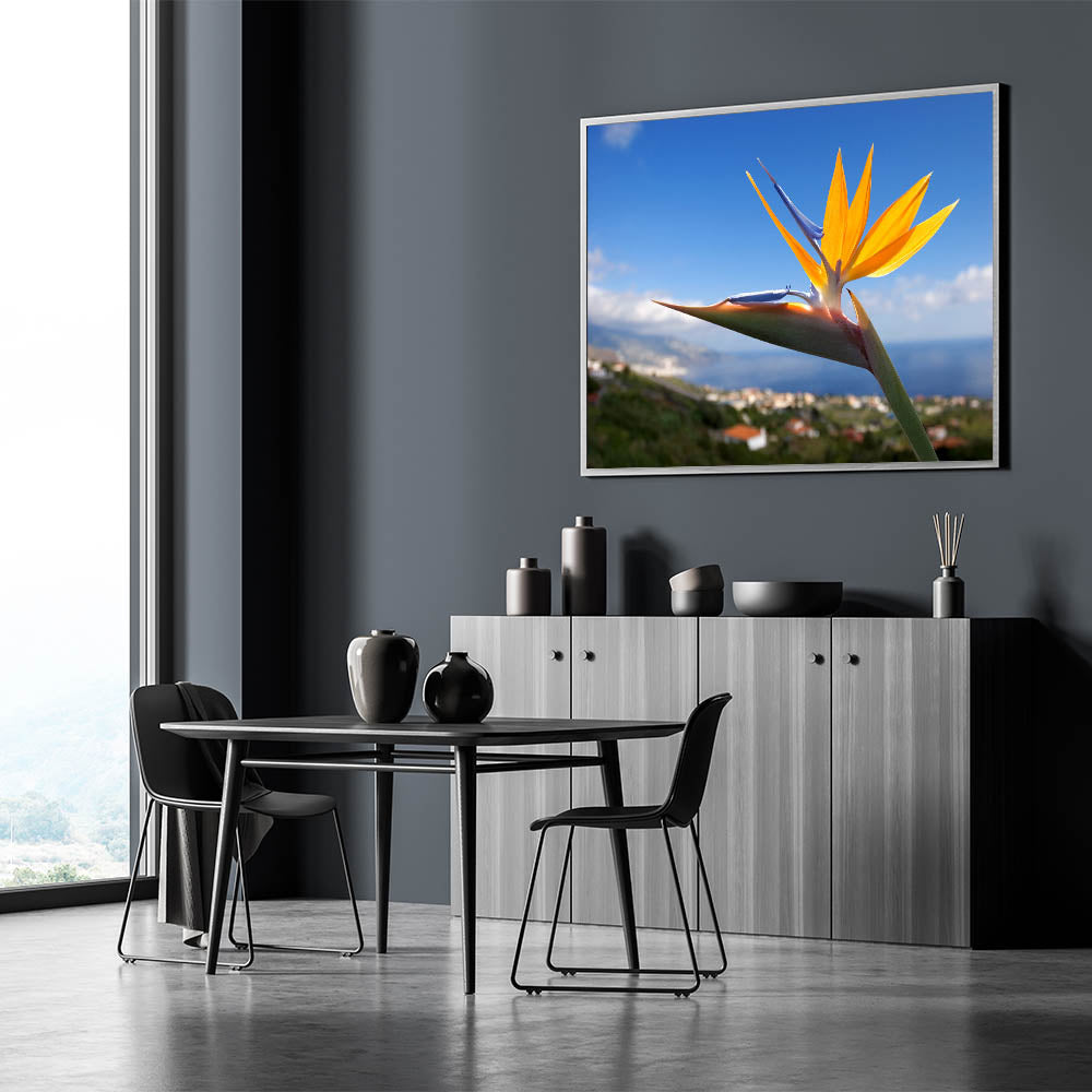 Elevate your home décor with the Bird of Paradise Art Print, a beautiful representation of one of nature's most exotic and vibrant flowers. The striking orange and yellow petals of the Strelitzia bloom against a stunning blue sky backdrop, making this piece an eye-catching addition to any room. Perfect for adding a touch of tropical elegance and vivid color to your space.