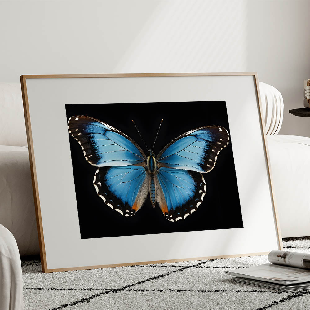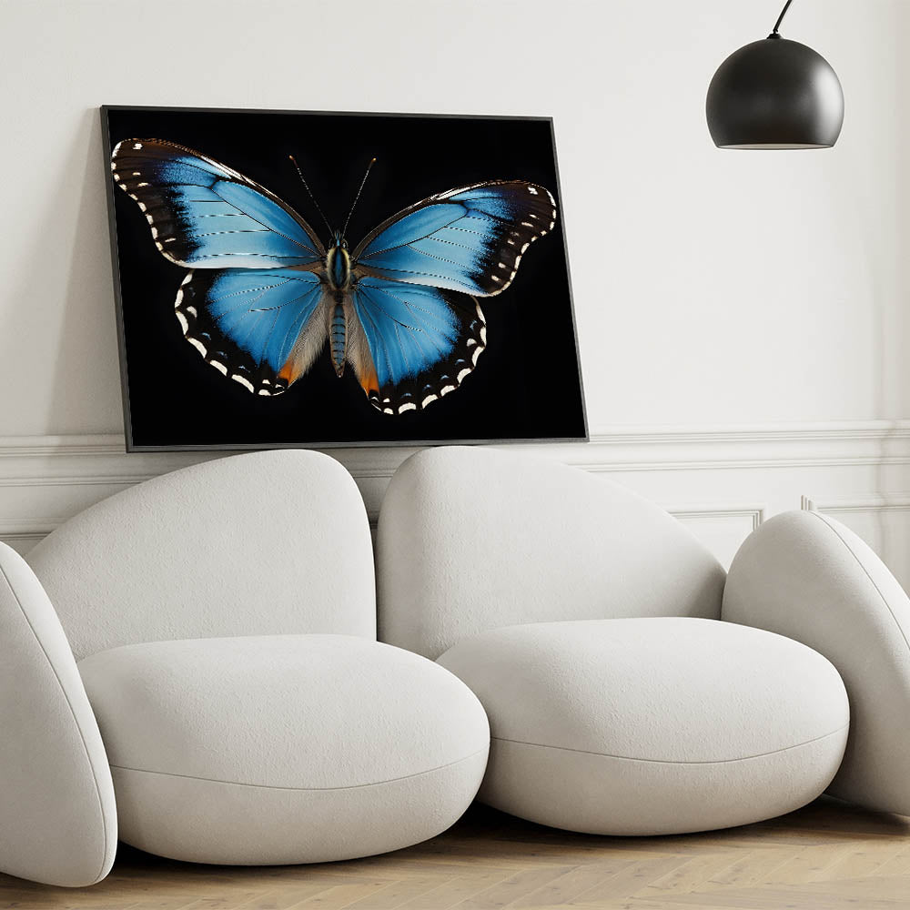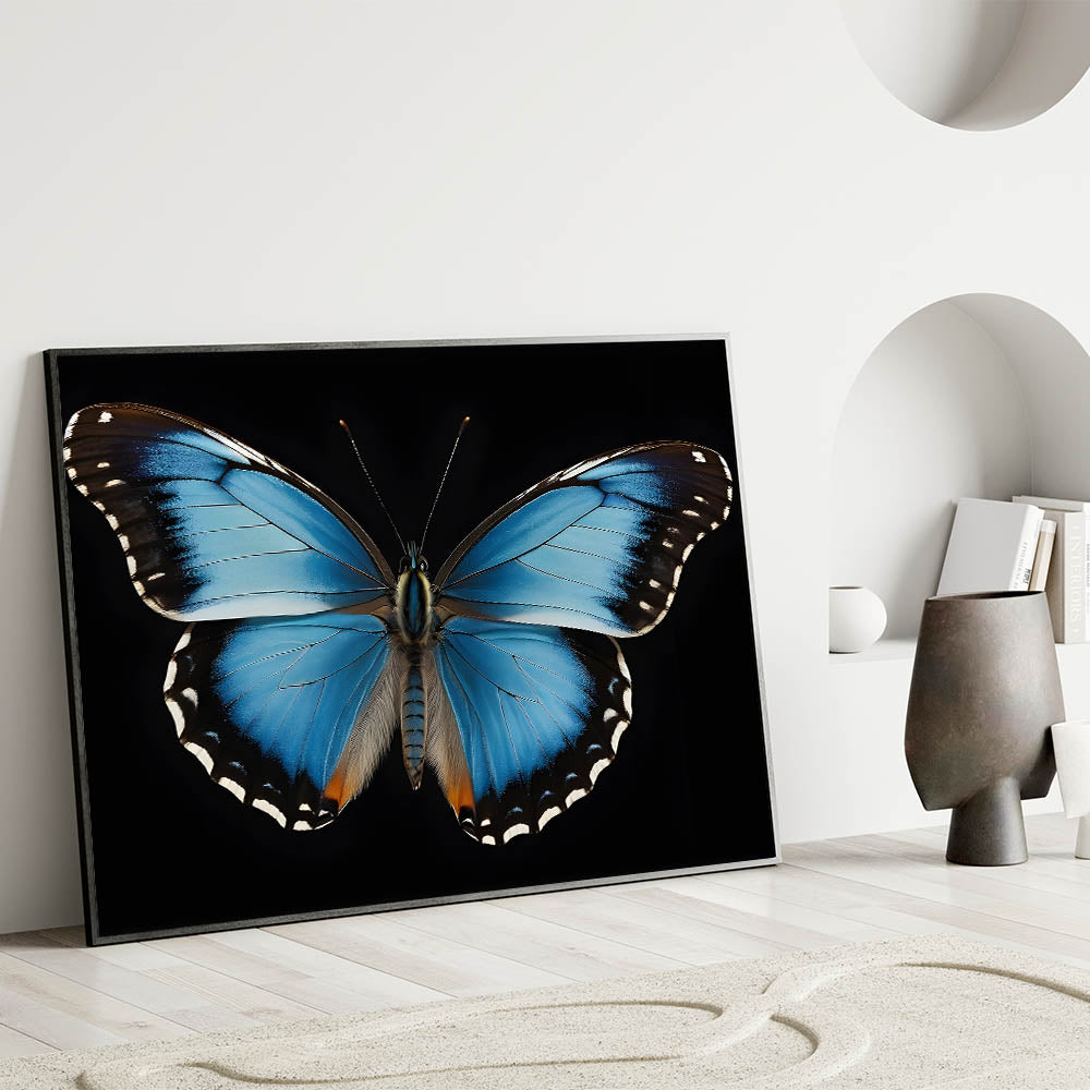 Elevate your home decor with this stunning blue butterfly wall art, a perfect representation of elegance and nature's beauty. The butterfly's wings, with their striking shades of blue accented by delicate touches of black and white, create a mesmerizing visual contrast against the deep black background. This artwork is ideal for adding a sophisticated touch to any space, from living rooms to bedrooms or even offices.