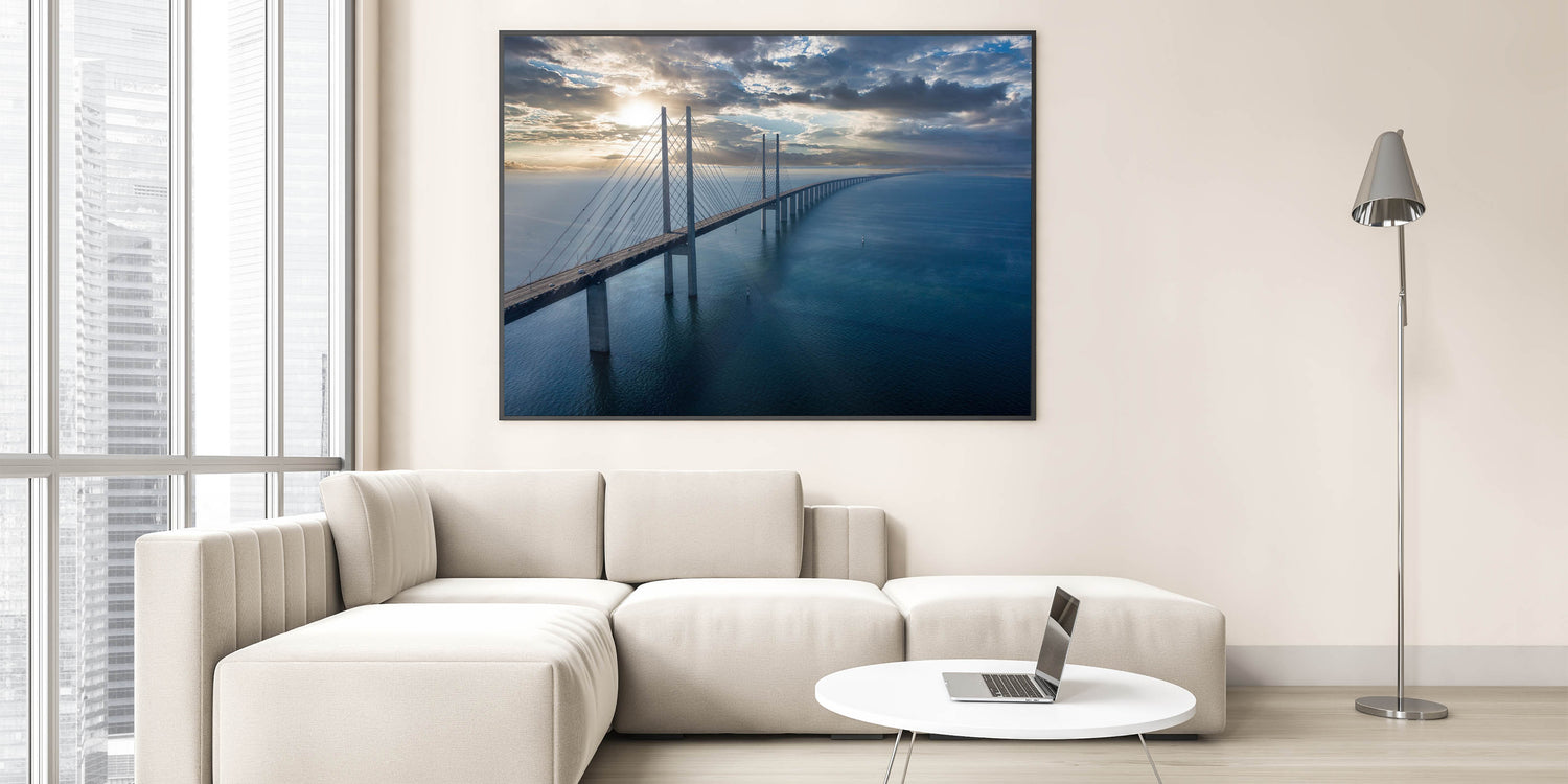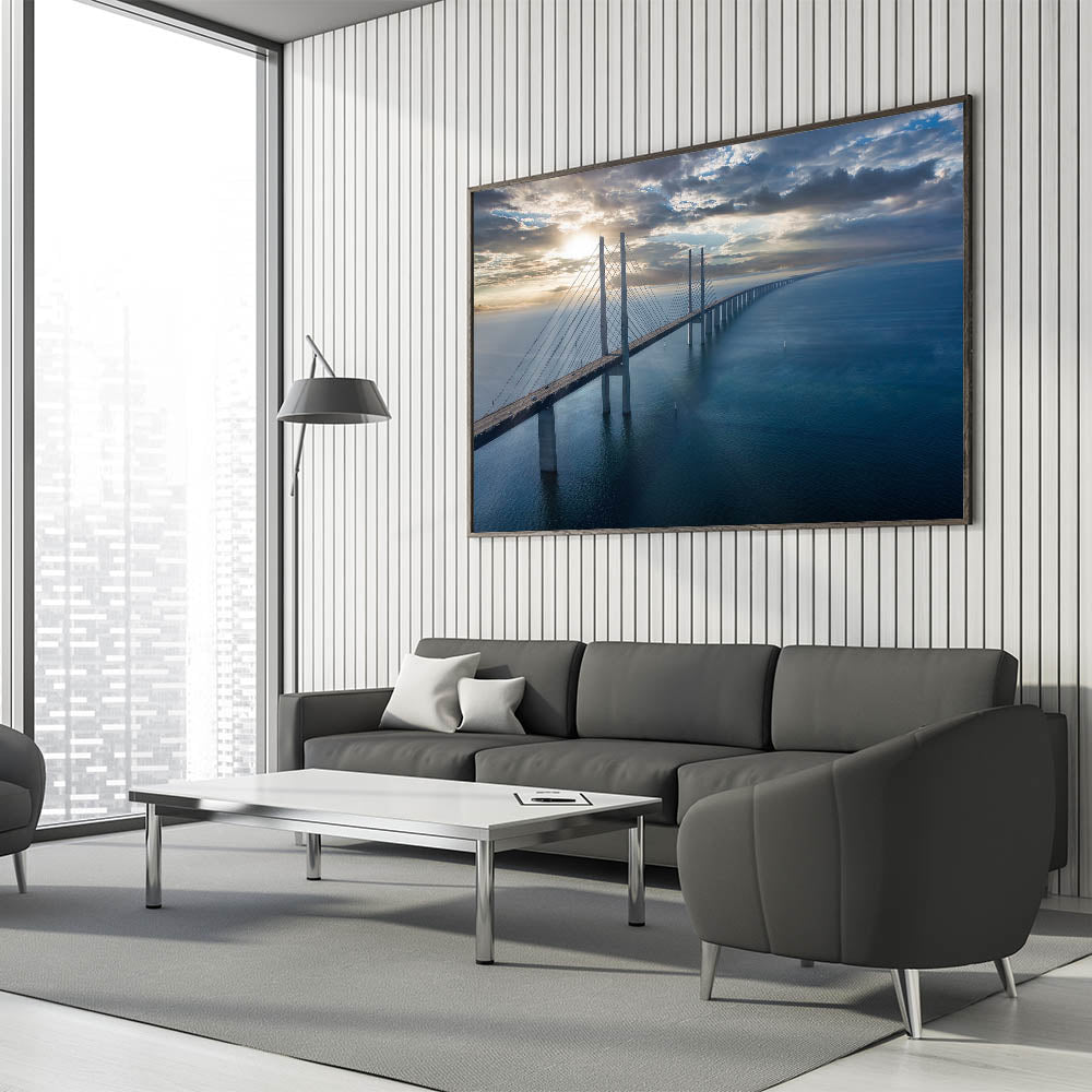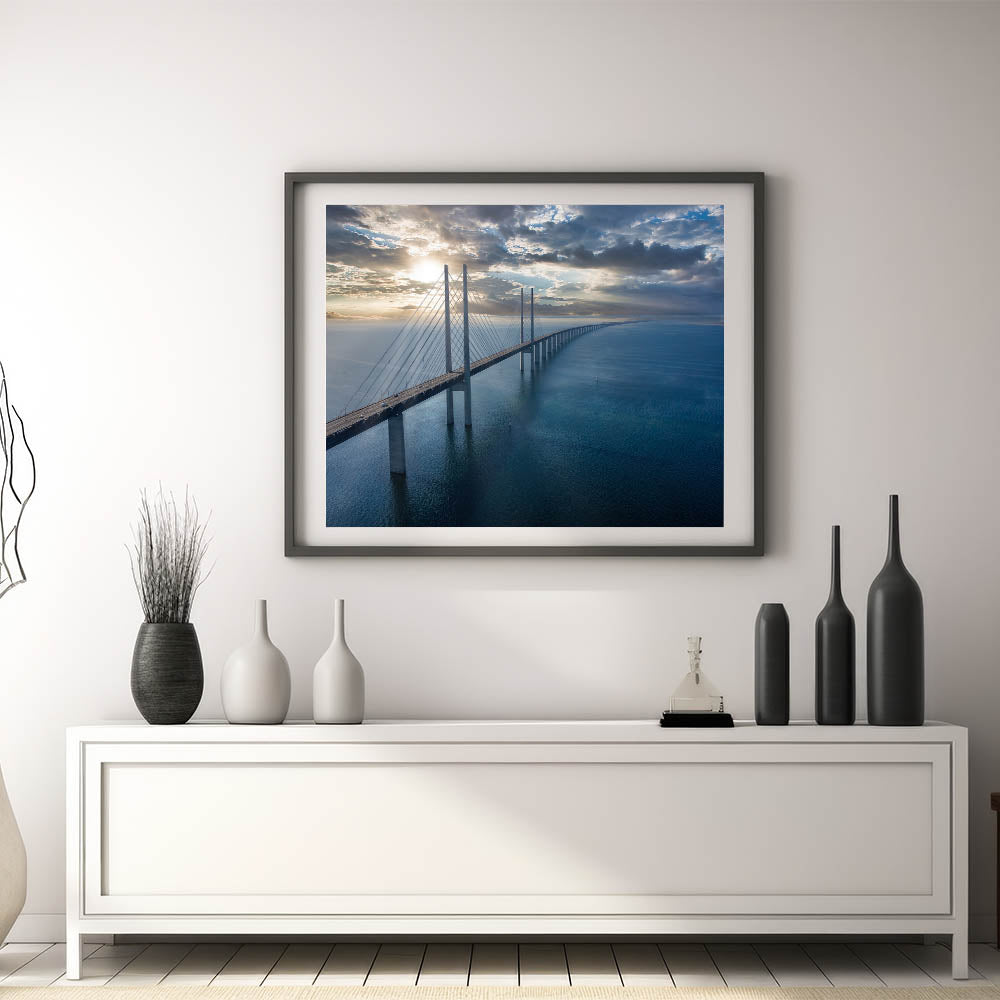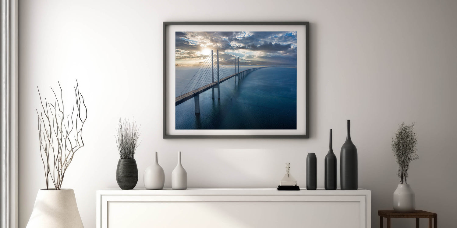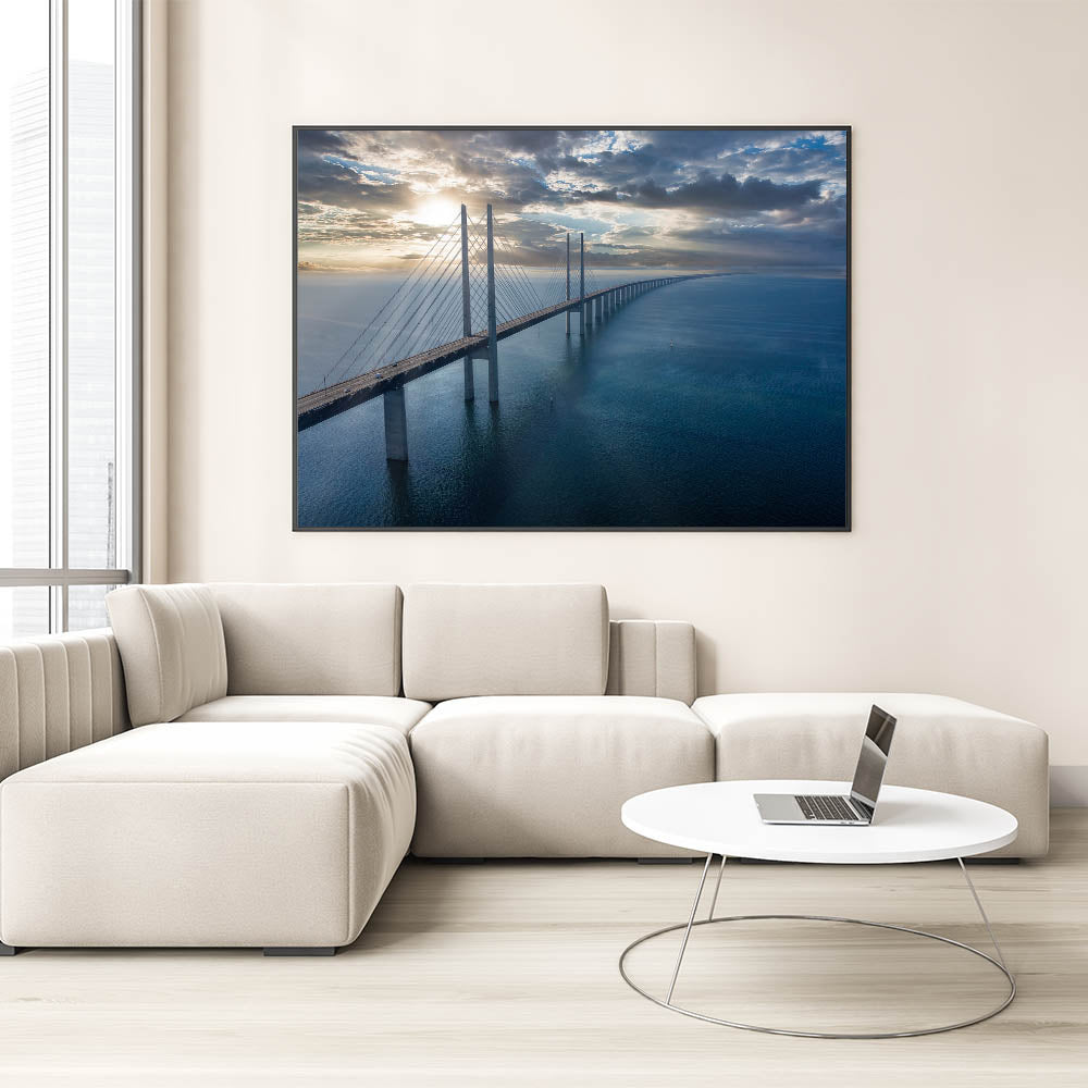 Elevate your interior decor with this breathtaking wall art showcasing a stunning bridge stretching over serene waters. This striking piece captures the grandeur of modern architecture against the tranquil backdrop of a calm sea and an expansive sky. Perfect for those who appreciate the beauty of minimalistic landscapes, this bridge photography print adds a touch of sophistication to any space.