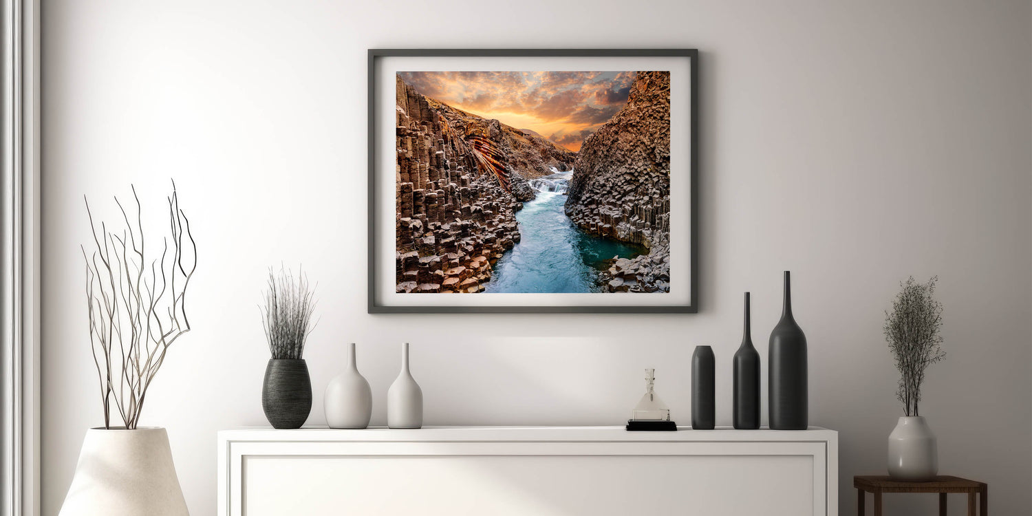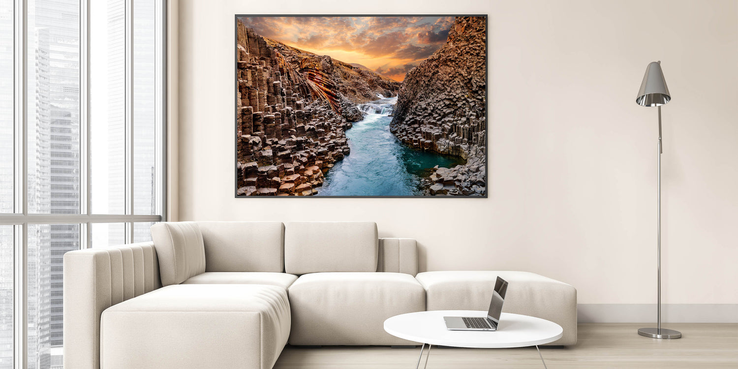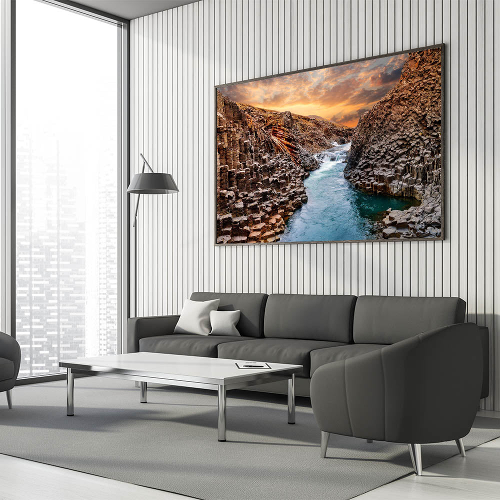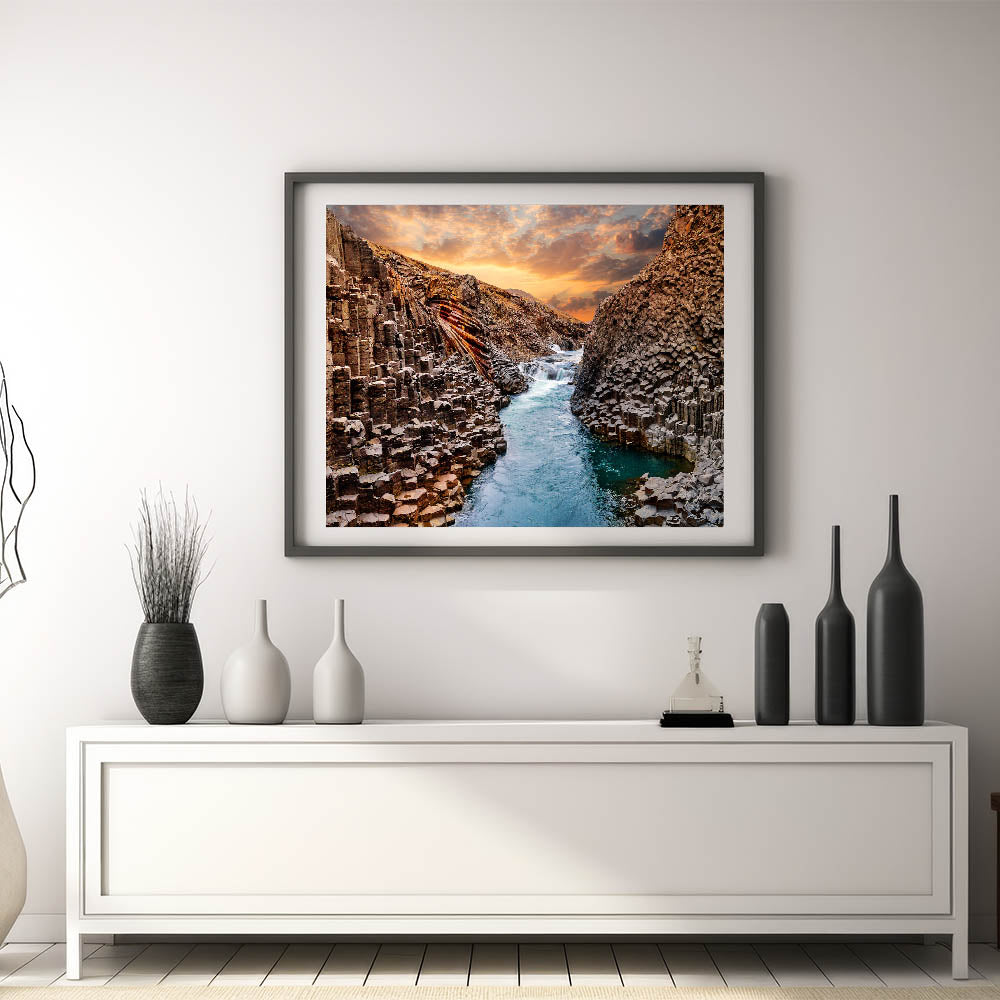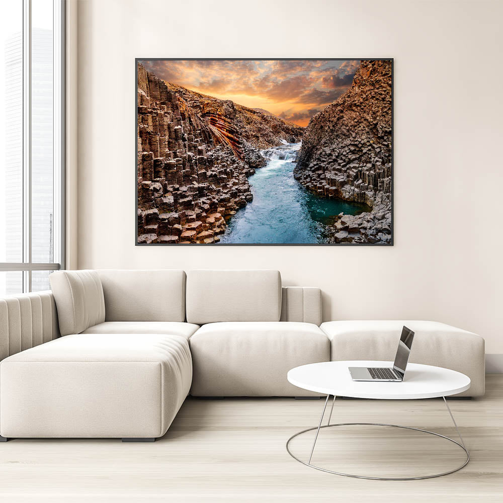 Discover the raw beauty of nature with this stunning canyon waterfall wall art. This breathtaking piece captures a dramatic scene where rugged, geometric rock formations meet a serene river flowing into a cascading waterfall. The vibrant colors of the sunset sky add warmth and contrast to the cool blue waters, creating a captivating visual experience that will transform any room.