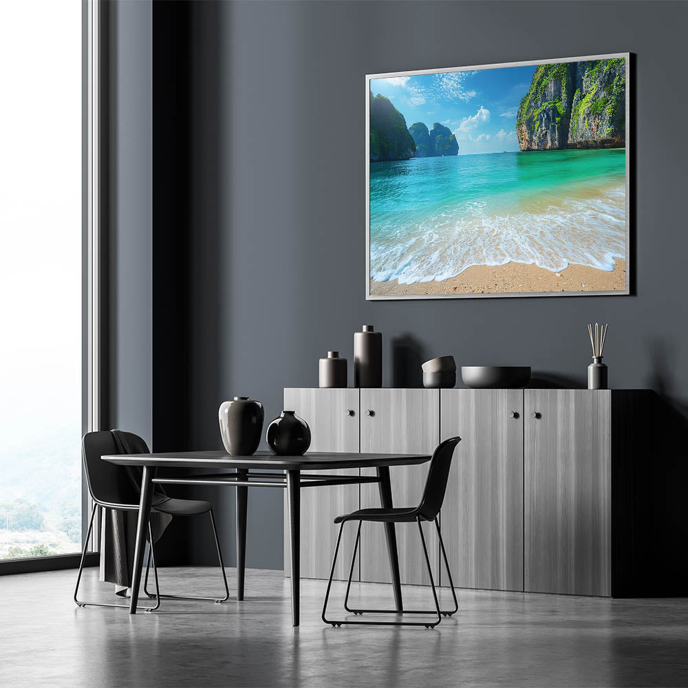Immerse yourself in the breathtaking beauty of our Tropical Beach Landscape Wall Art. This captivating piece features a serene beach scene where turquoise waters gently lap against the soft sandy shore, framed by towering cliffs adorned with lush greenery. The vibrant colors and stunning composition make this artwork a perfect addition to any room, bringing the tranquility and charm of a tropical paradise into your home.
