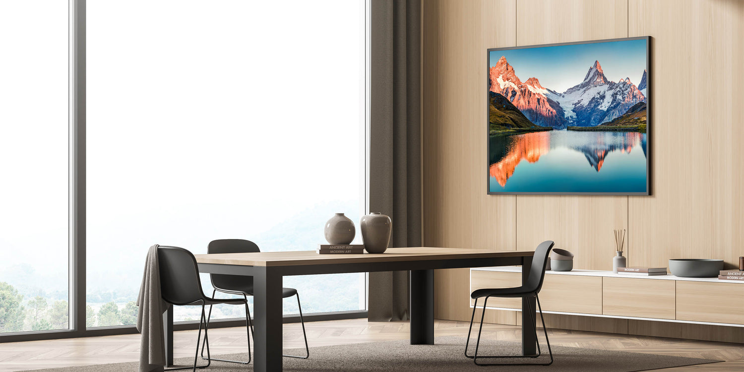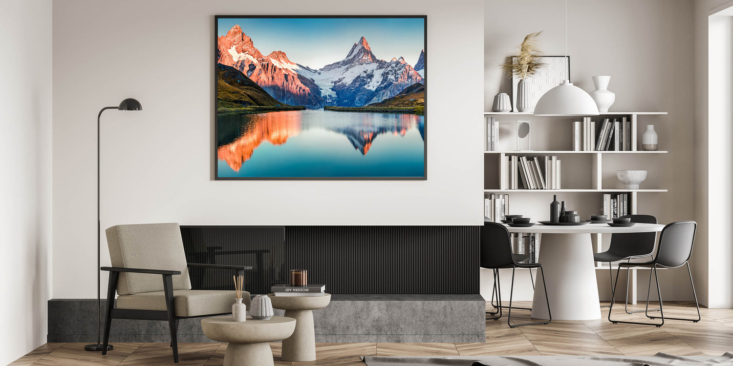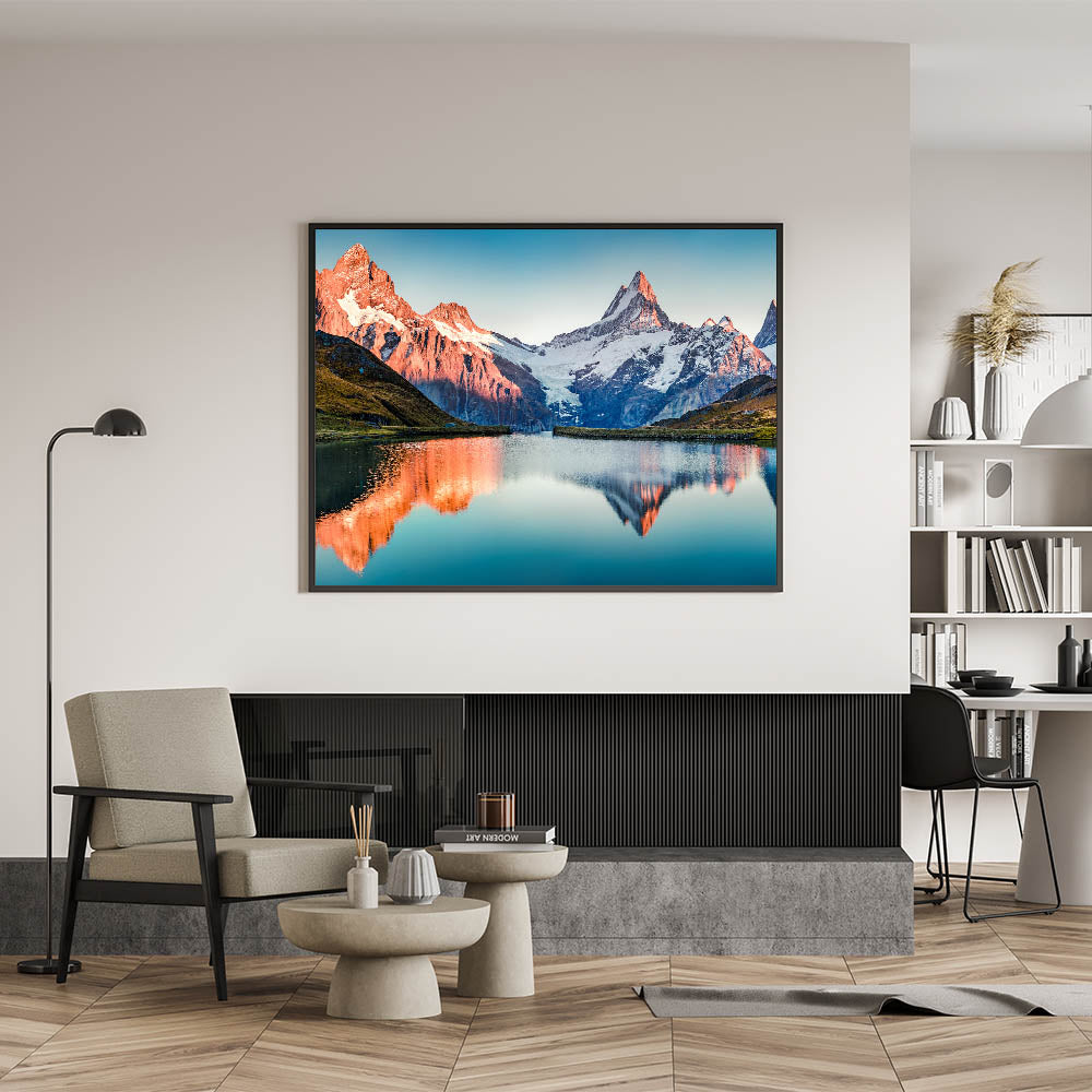 Transform your home decor with this beautiful mountain artwork. The sunlit peaks and their reflection in the calm waters bring a peaceful and radiant atmosphere to any space. Order today to bring this stunning landscape into your home.