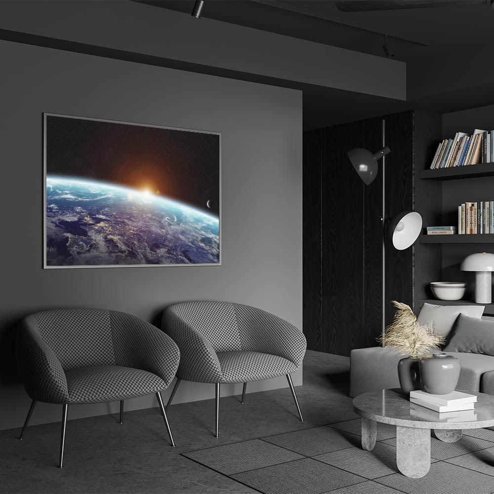 This captivating wall art captures the serene beauty of the Earth as the sun rises on the horizon, casting a warm glow over the planet. The detailed image highlights the rich blue tones of the oceans, the distant moon, and the vastness of space. Perfect for nature lovers, space enthusiasts, or anyone looking to add a touch of global perspective to their decor, this high-resolution artwork brings the majestic beauty of Earth and space into your home.