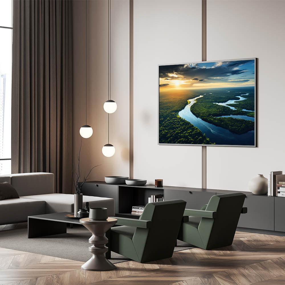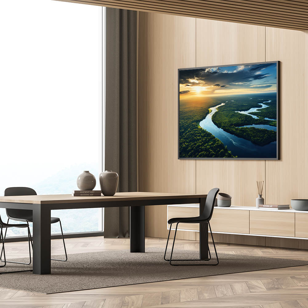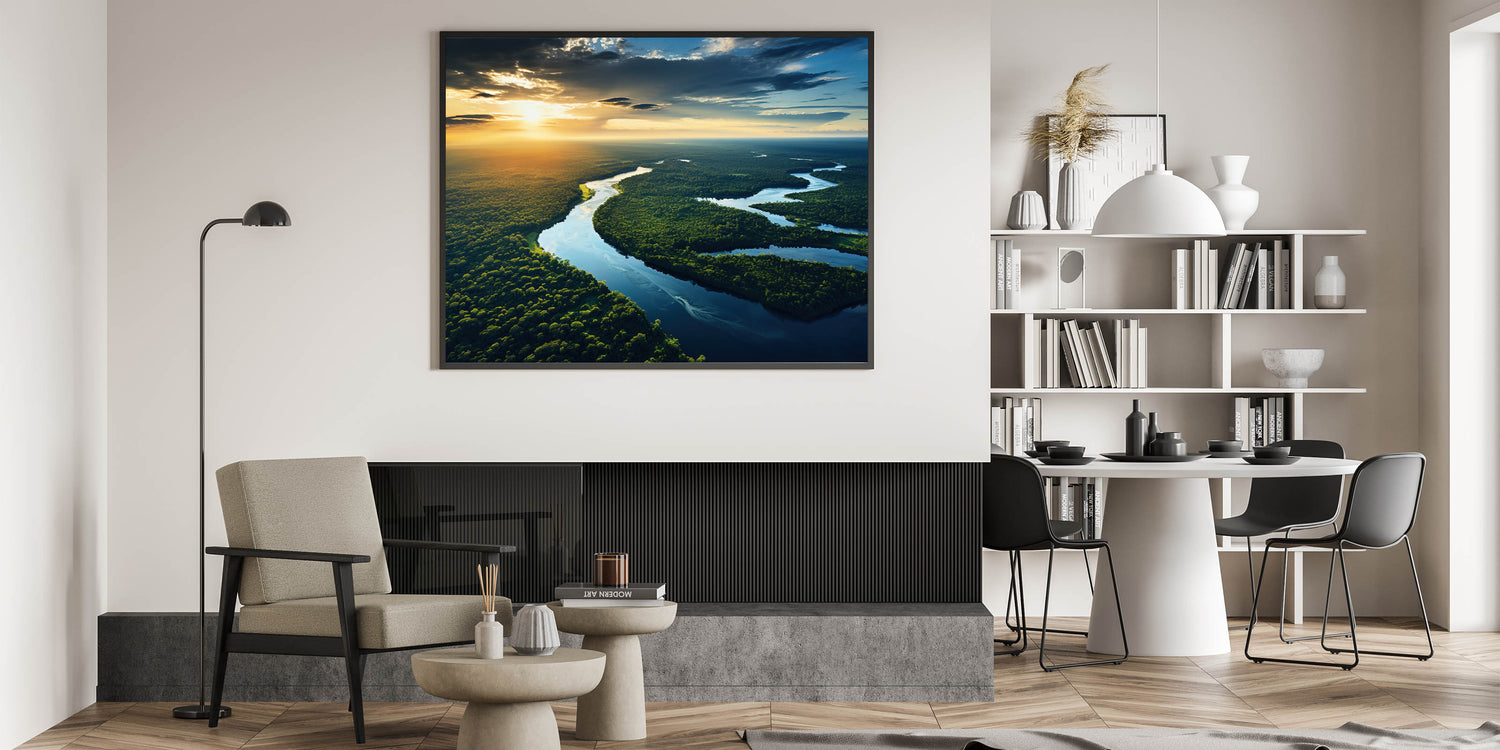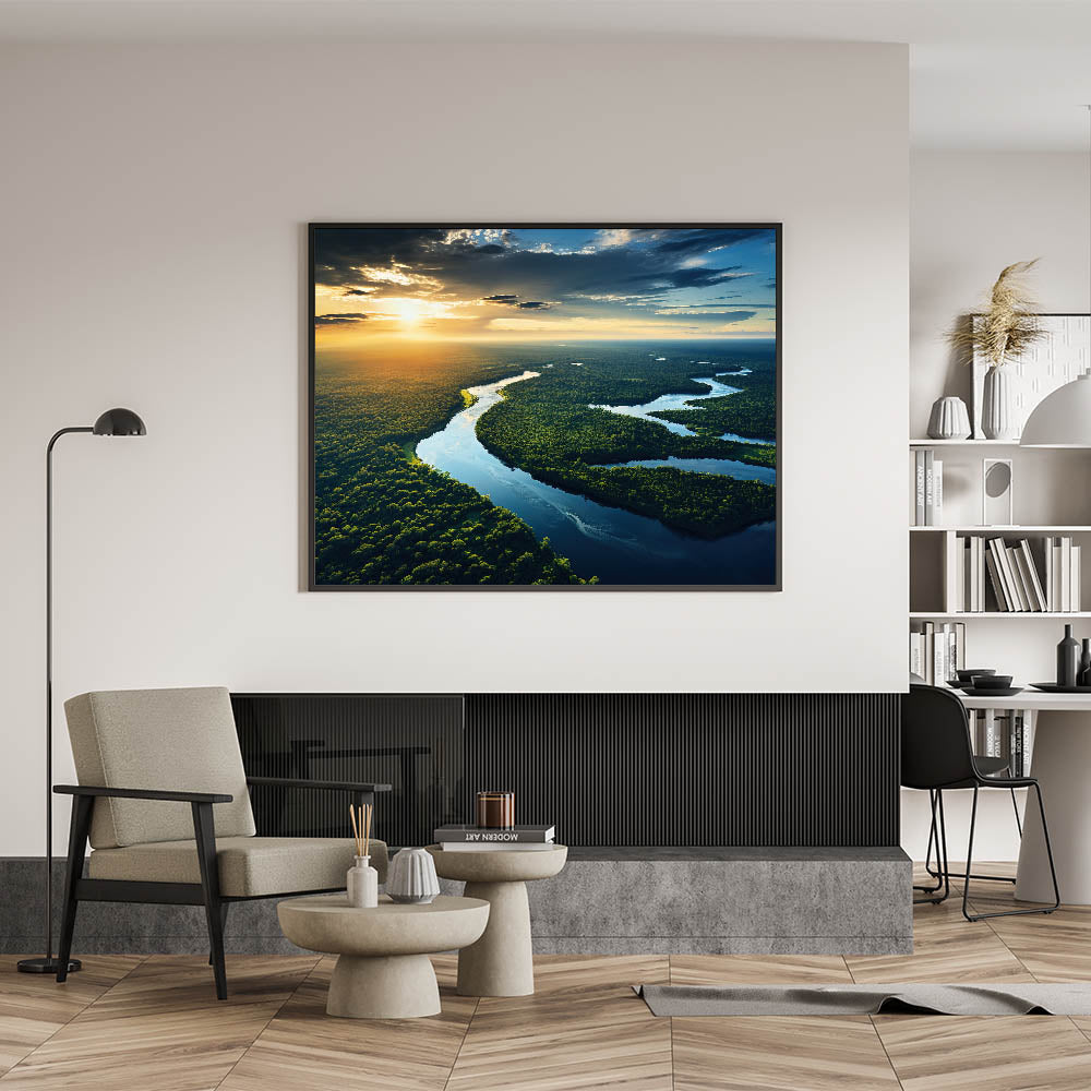 This sunrise over the rainforest river wall art is an excellent choice for nature lovers and those looking to create a calming retreat within their home. Its golden hues and serene imagery will transform any room into a peaceful escape.
