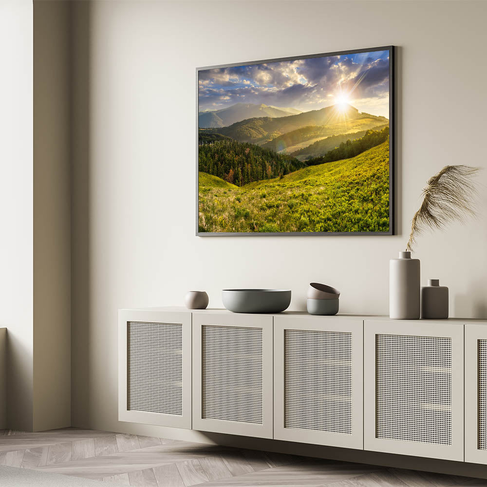 Awaken your space with the stunning beauty of this sunrise over a valley wall art. This captivating artwork captures the first light of day as it breaks over the rolling hills and lush green forests of a serene valley. The golden rays of the sun create a warm, inviting glow, highlighting the rich colors of the landscape and filling the scene with a sense of peace and renewal. Perfect for those who appreciate the beauty of nature, this piece brings the tranquility of the outdoors into your home.