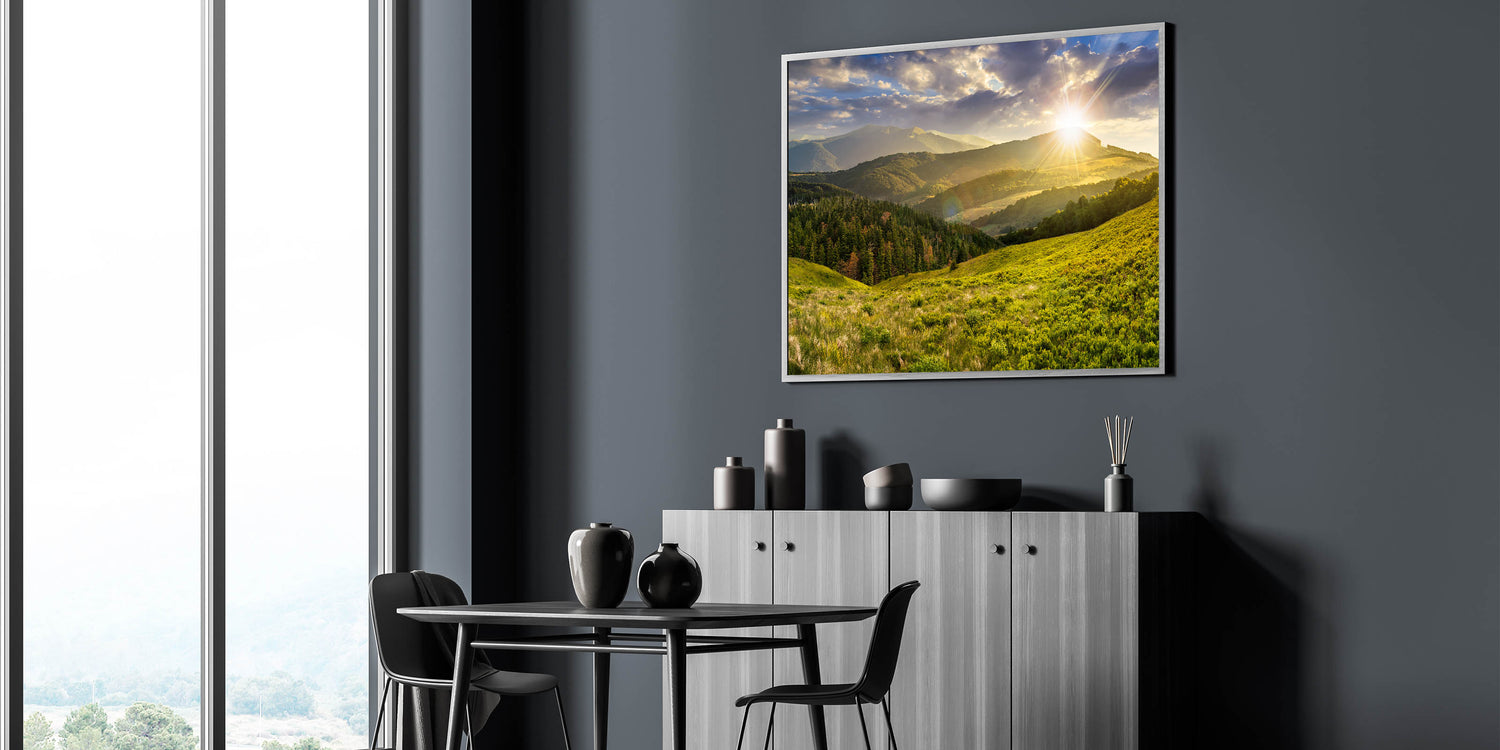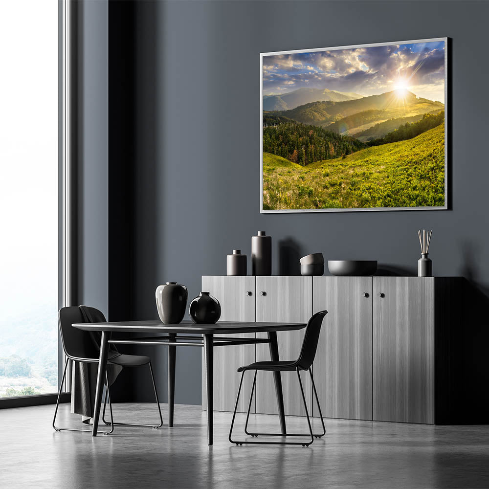 Bring the beauty and serenity of a sunrise in the mountains into your home with this exquisite valley-themed wall art. Perfect for creating a peaceful and uplifting atmosphere, this piece will add a touch of natural elegance to any decor. Order now to bring the warmth of the sunrise into your space.