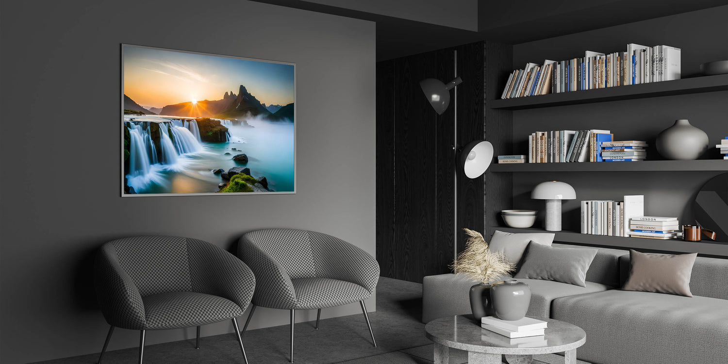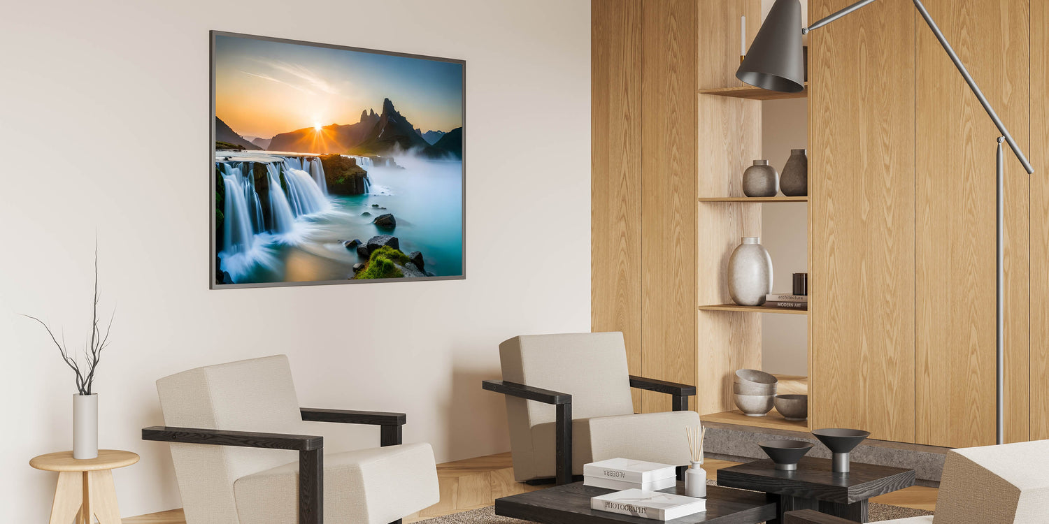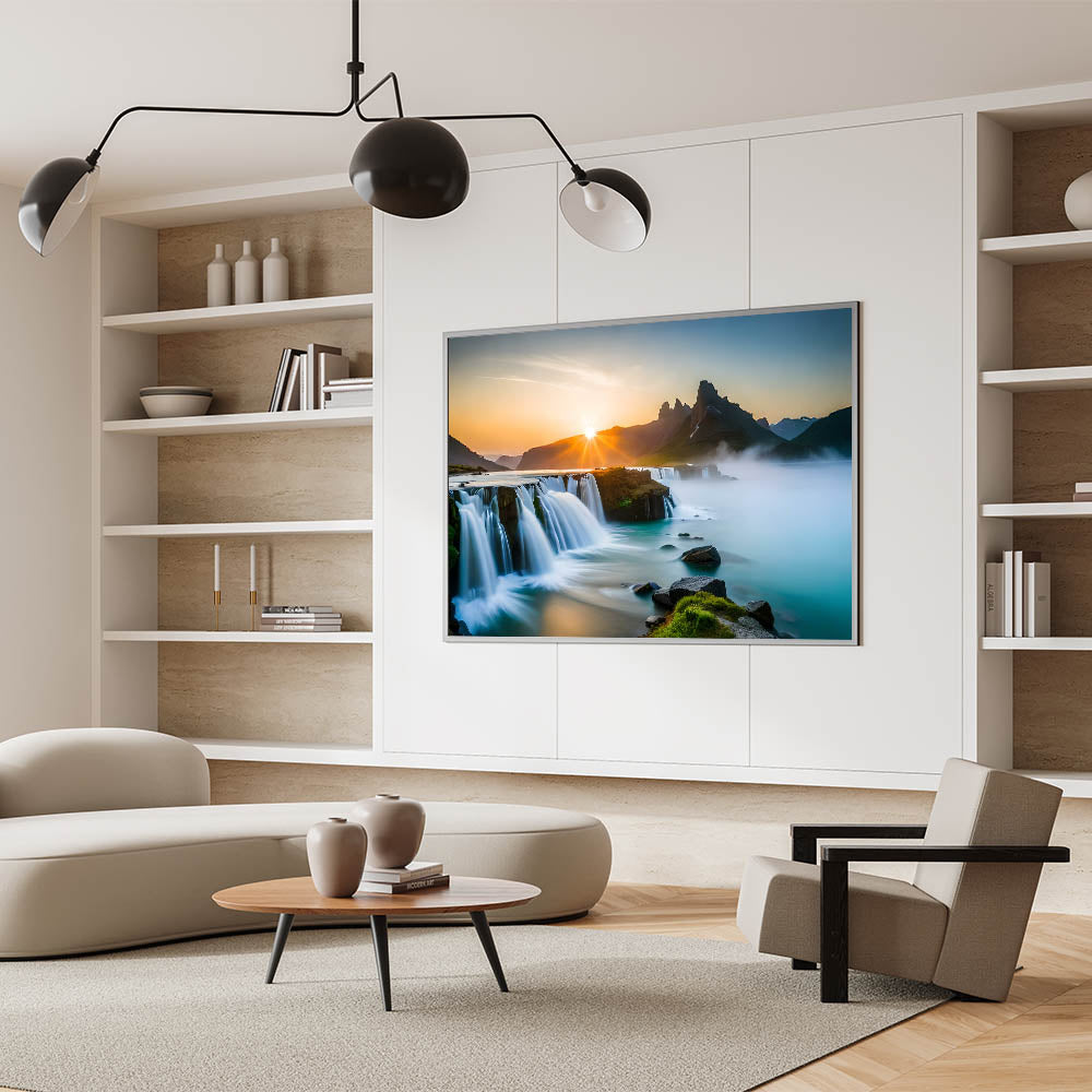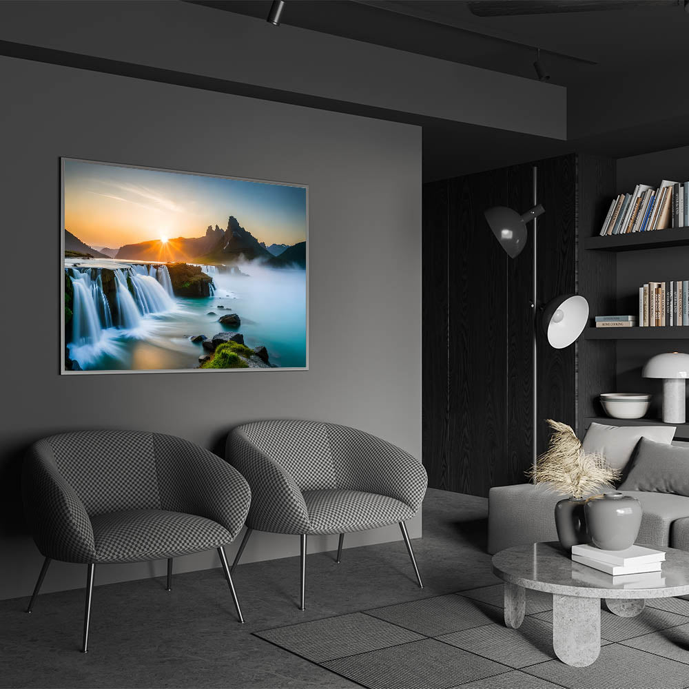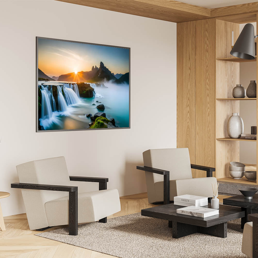 Transform your home with this stunning waterfall painting that captures the serene beauty of a sunrise-lit landscape. Whether displayed in a modern or traditional setting, this artwork is sure to evoke a sense of calm and elegance.