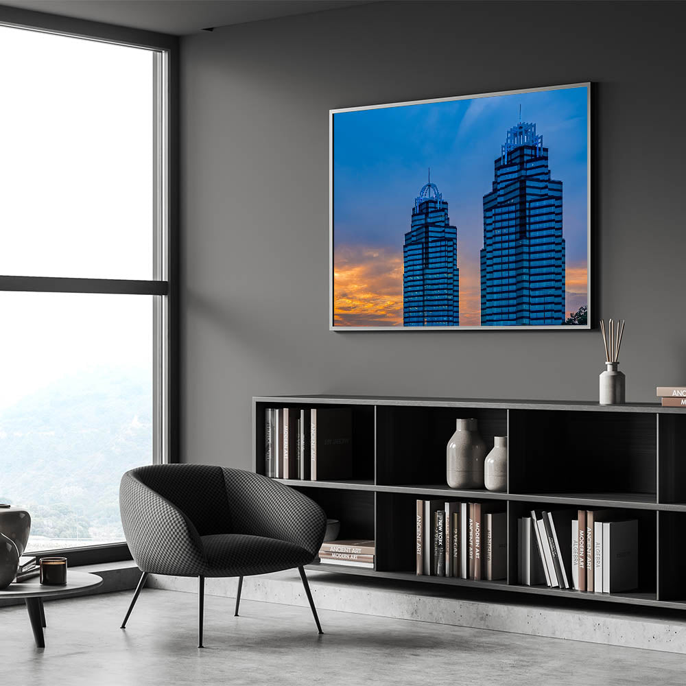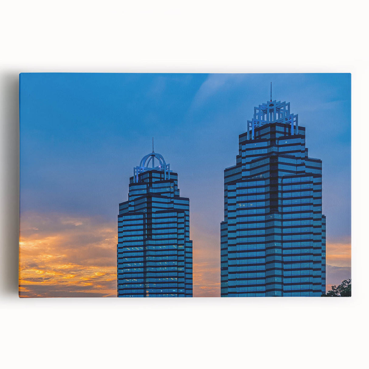This stunning Atlanta skyline wall art showcases two of the city’s most iconic towers set against a breathtaking sunset. The vibrant colors of the setting sun, blending with the deep blue sky, create a perfect backdrop to the bold architecture of the towers. This piece captures the essence of modern Atlanta, making it an ideal choice for anyone looking to bring a touch of urban elegance and natural beauty into their home or office decor.