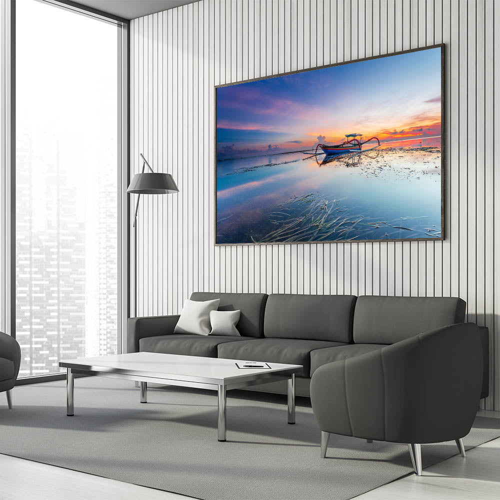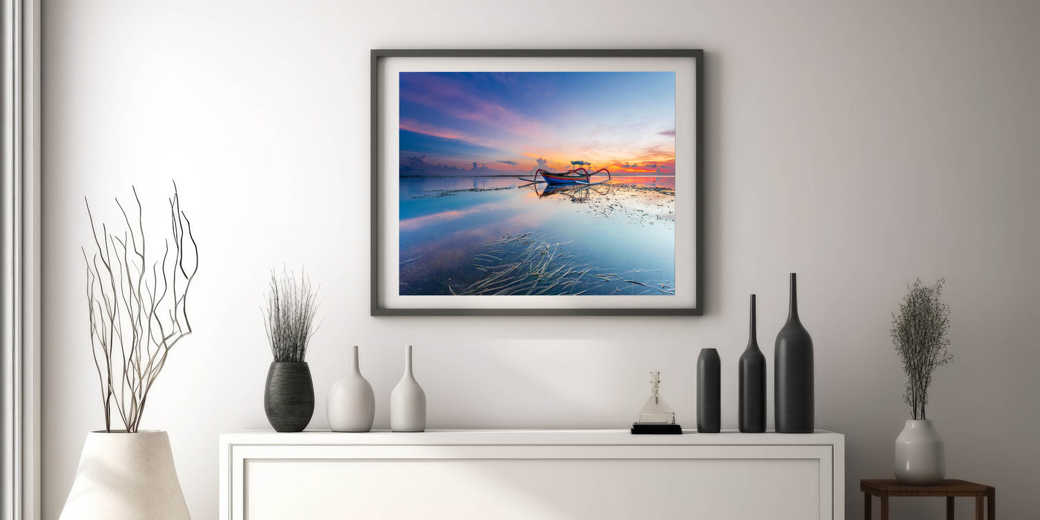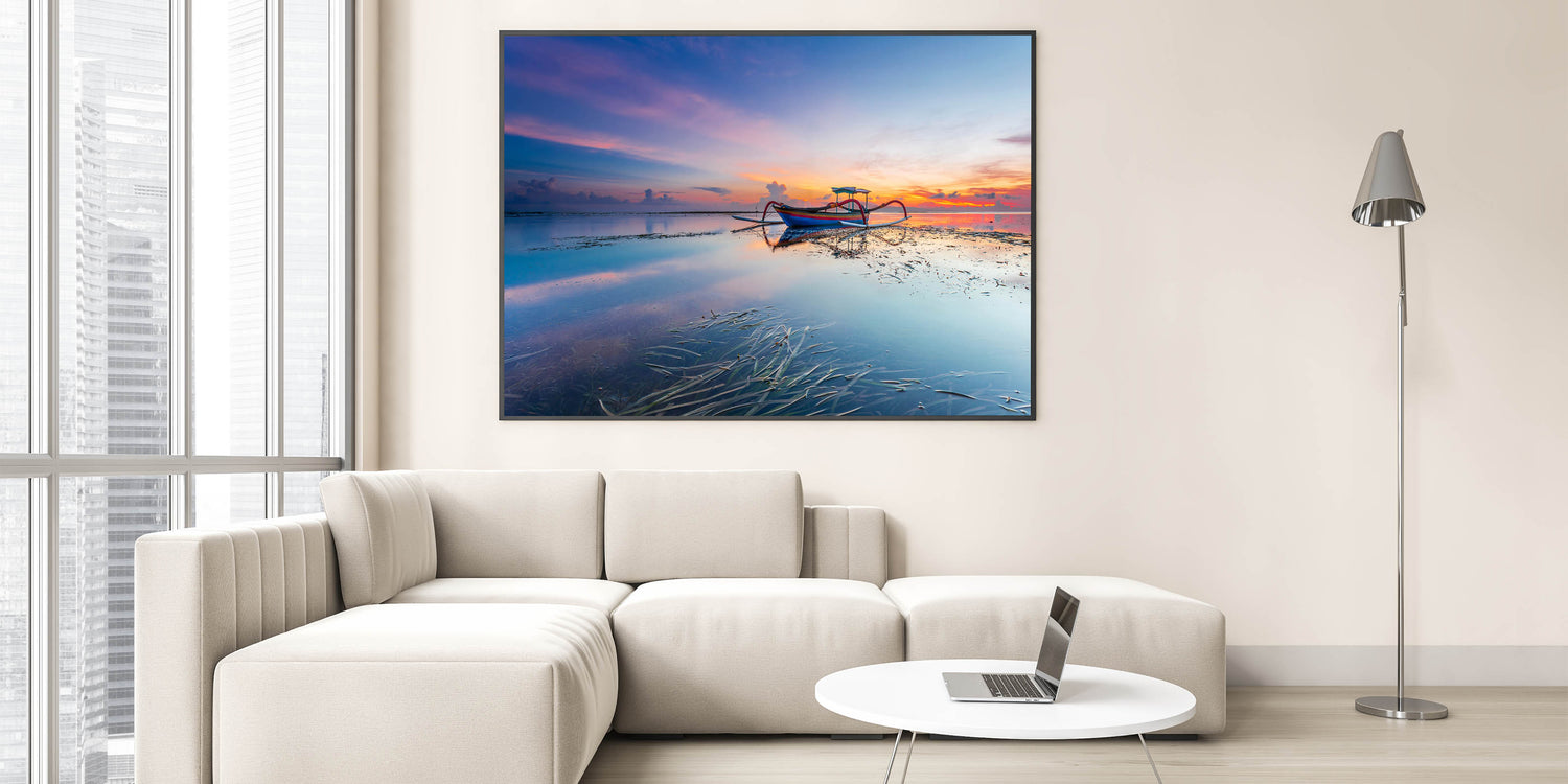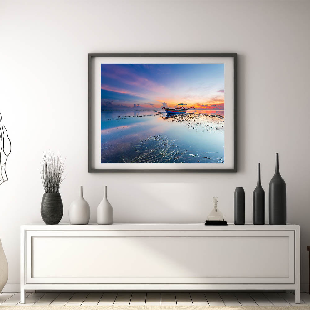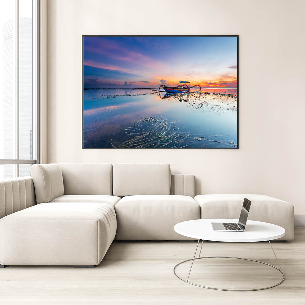 Experience the serene beauty of Bali's coastline with this captivating wall art featuring a traditional boat resting on calm waters at sunset. The vivid hues of pink, purple, and orange fill the sky, reflected perfectly in the still waters, creating a scene of tranquility. This piece of art captures the peaceful atmosphere of Bali's beaches and makes a perfect addition to any space looking for a calming, nature-inspired decor.