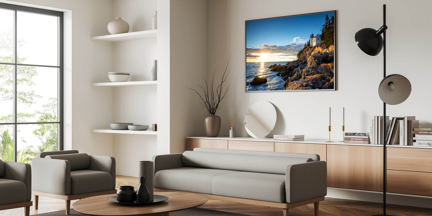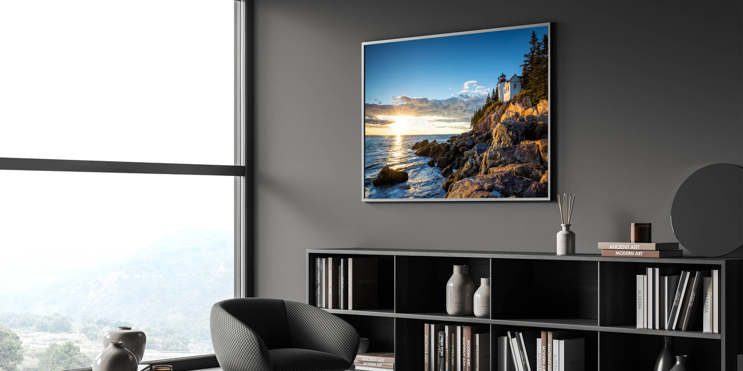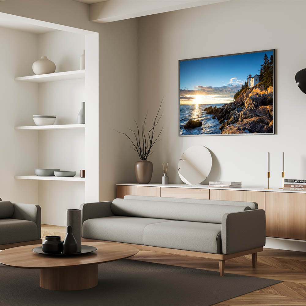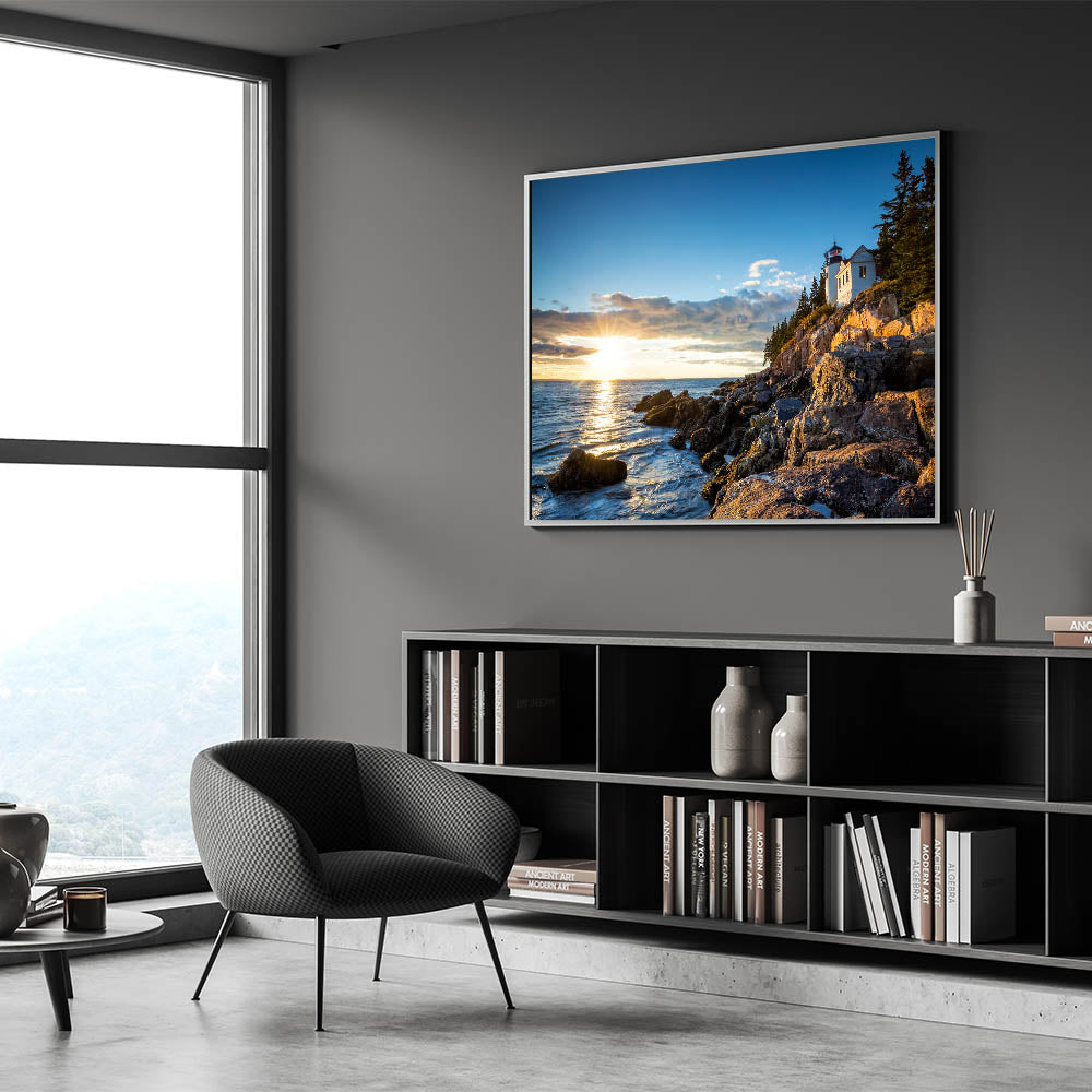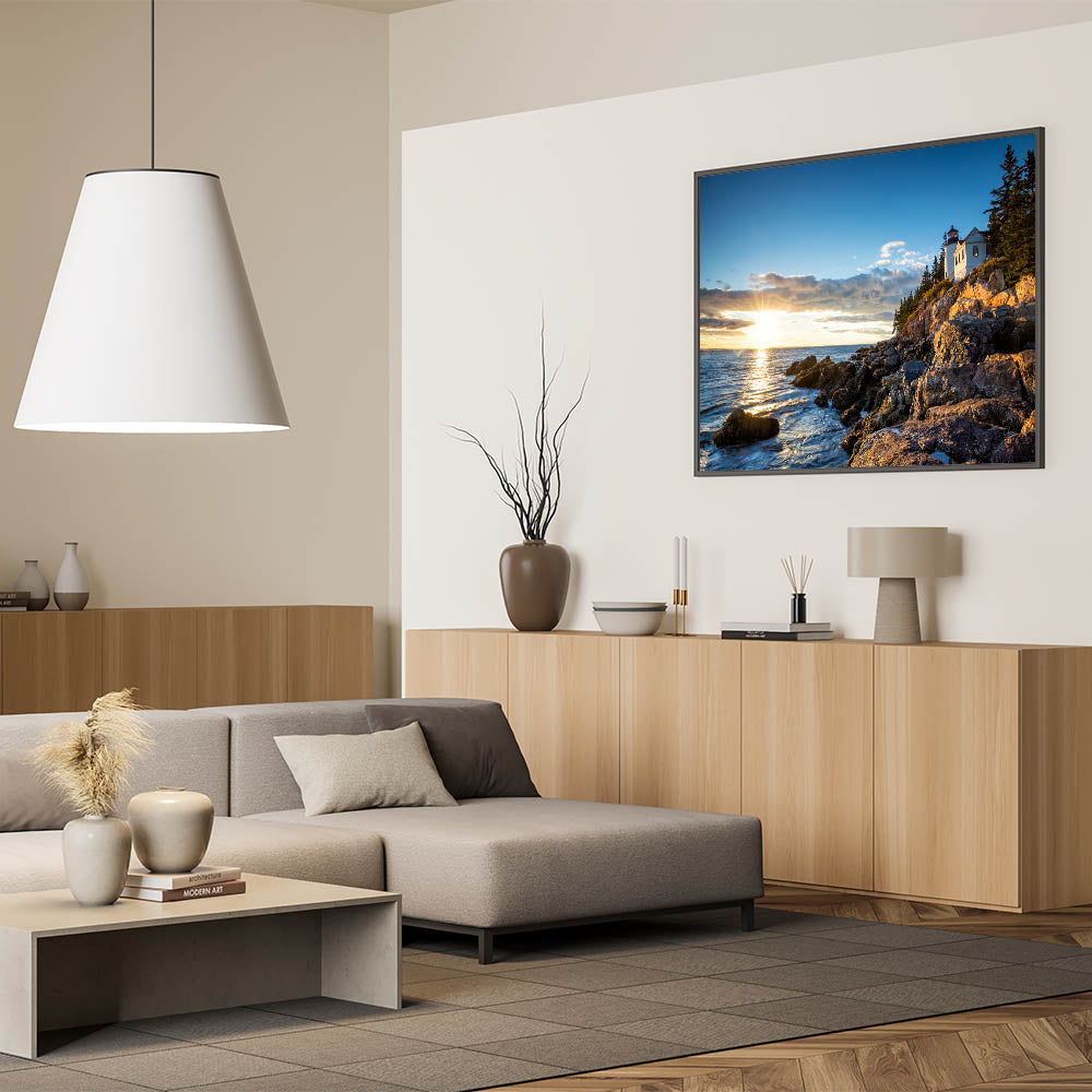 Capture the serene beauty of coastal landscapes with this Sunset Lighthouse Cliffs Wall Art. This stunning piece portrays a tranquil lighthouse perched on rugged cliffs as the setting sun casts a golden glow across the water. The peaceful scene is perfect for anyone who loves coastal views and the calming influence of nature.