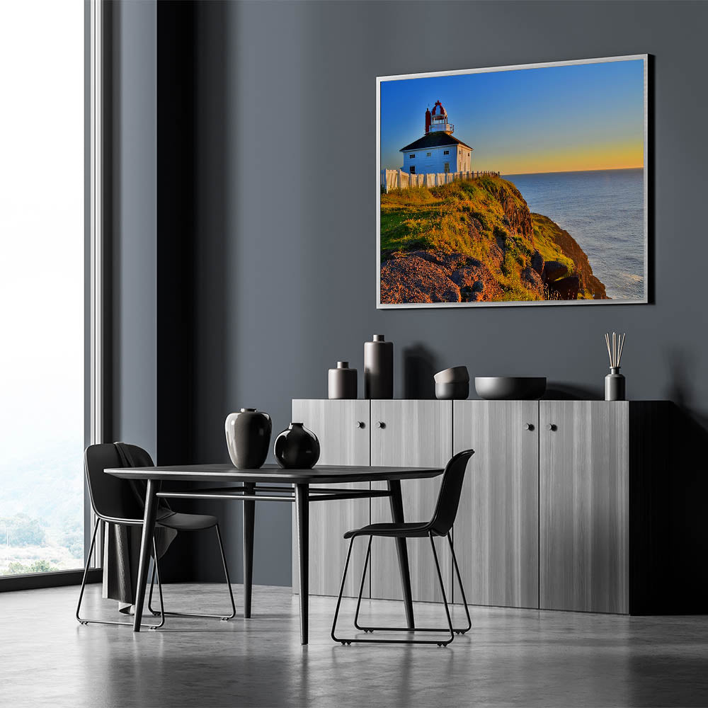 Capture the timeless beauty of Newfoundland’s coast with this stunning sunset lighthouse wall art. The image features a picturesque lighthouse perched atop a grassy cliff, with the warm hues of sunset casting a golden glow across the scene. The deep blue of the Atlantic Ocean provides a striking contrast, making this artwork perfect for those who appreciate coastal landscapes and tranquil seascapes.