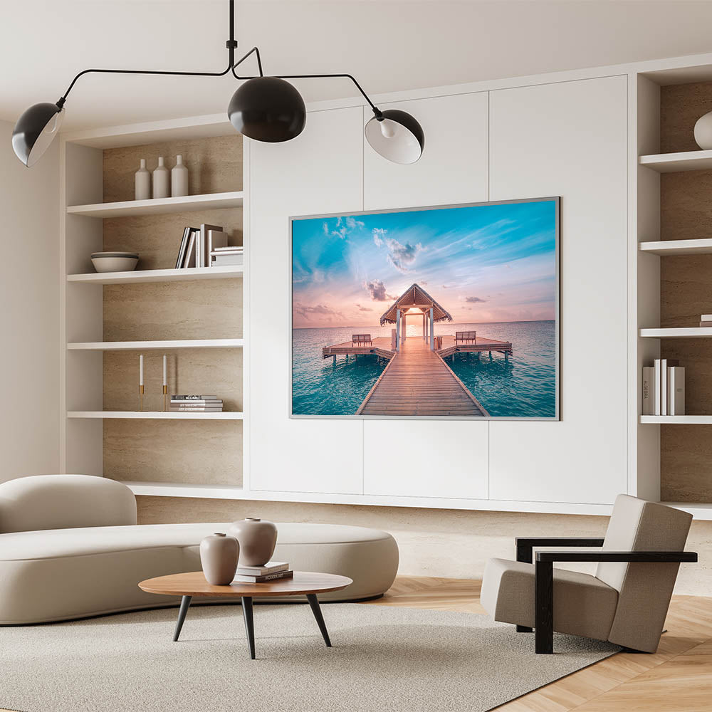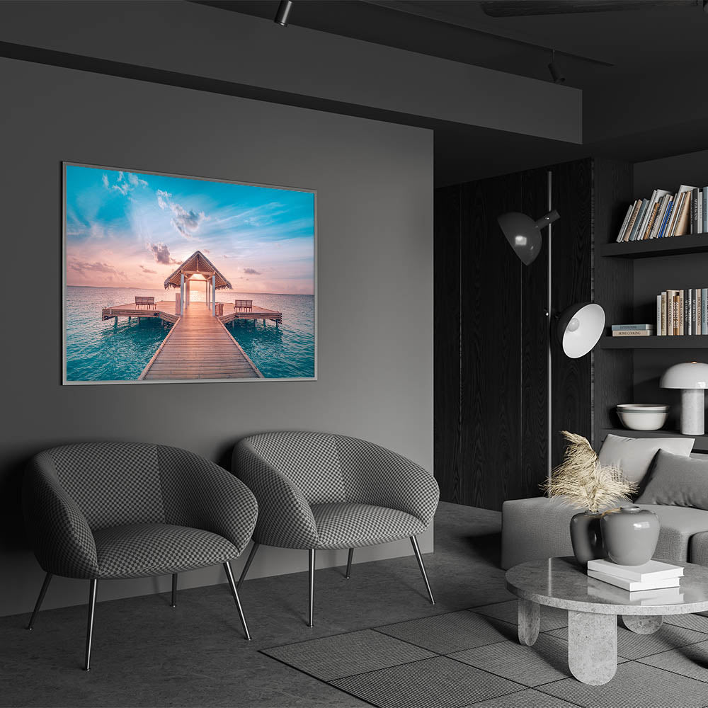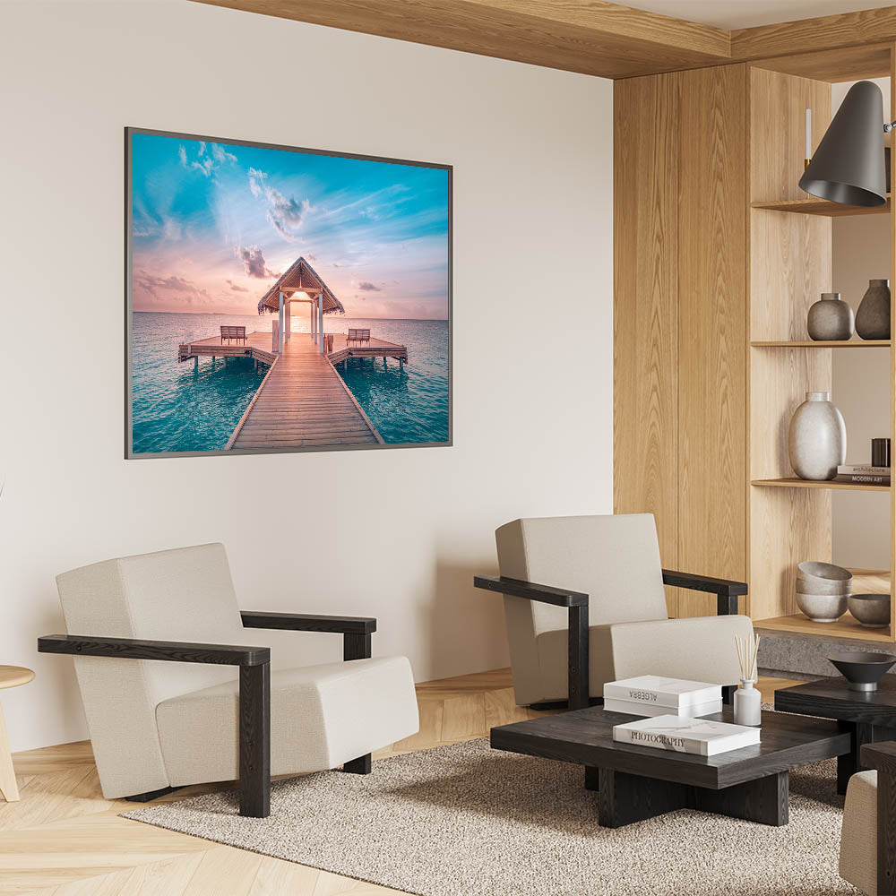 Our "Sunset Pier Canvas" captures the essence of serene evenings in Bora Bora. Perfect for those who wish to add a touch of calm and inspiration to their décor, this piece transforms your room into a haven of peace. Let this artwork inspire daily reflections and tranquility in your home or workspace