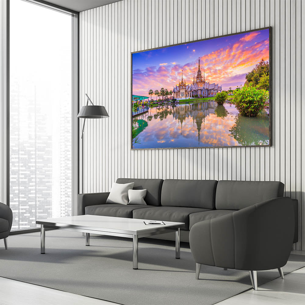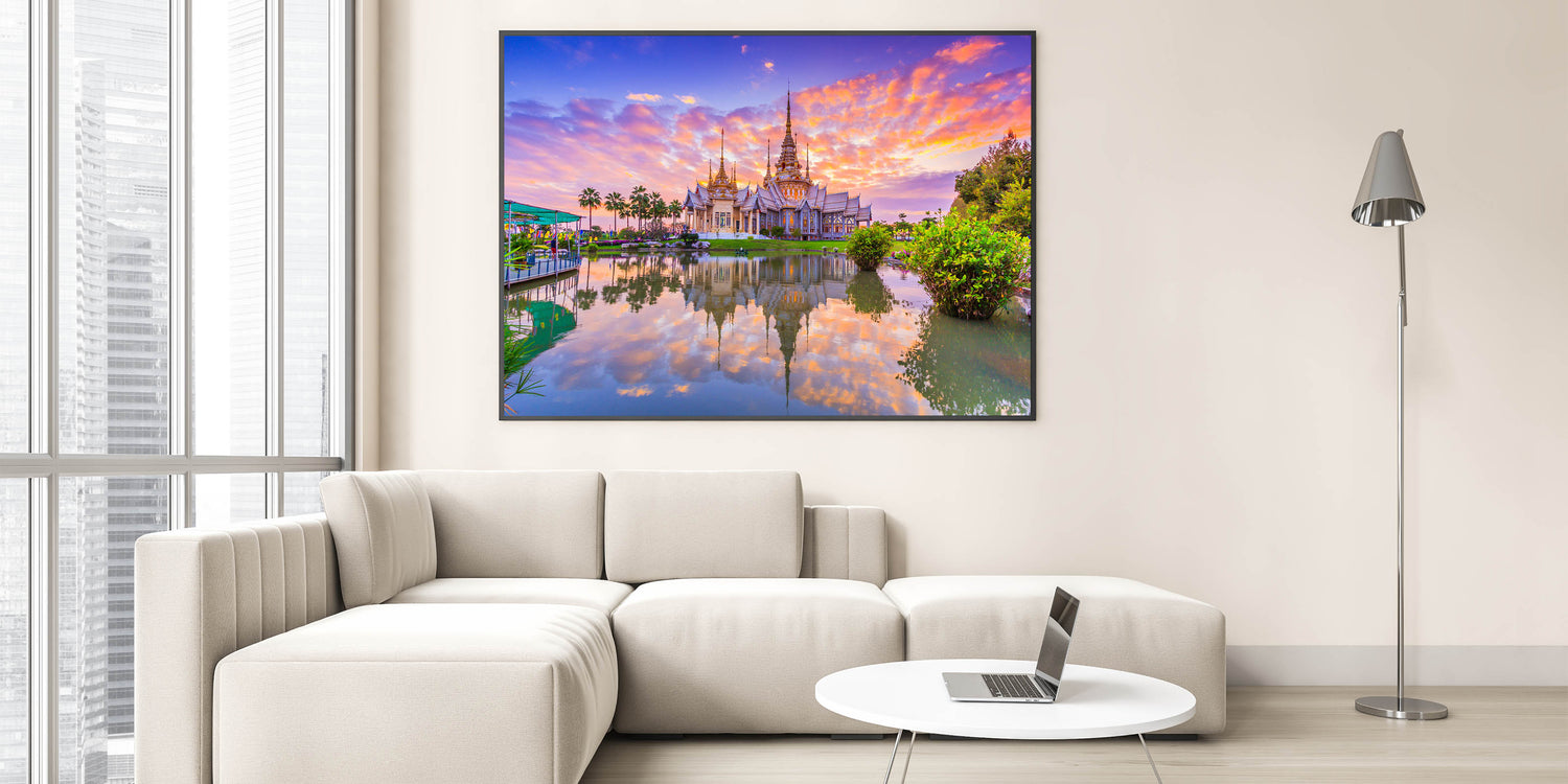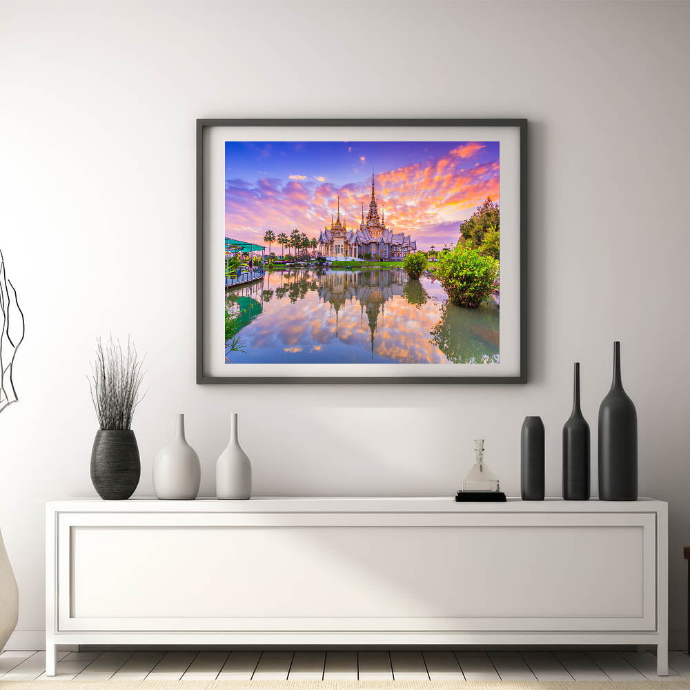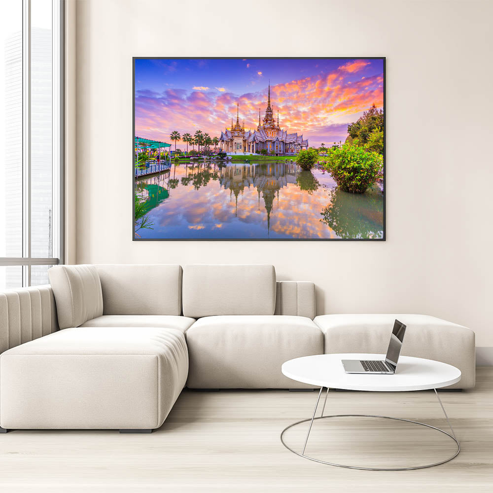 Behold the serene beauty of a Vietnamese temple at sunset with our "Sunset Reflections" wall art. This piece features a breathtaking view of a majestic temple, reflected perfectly in the tranquil waters below, all under a sky painted with vibrant sunset hues.