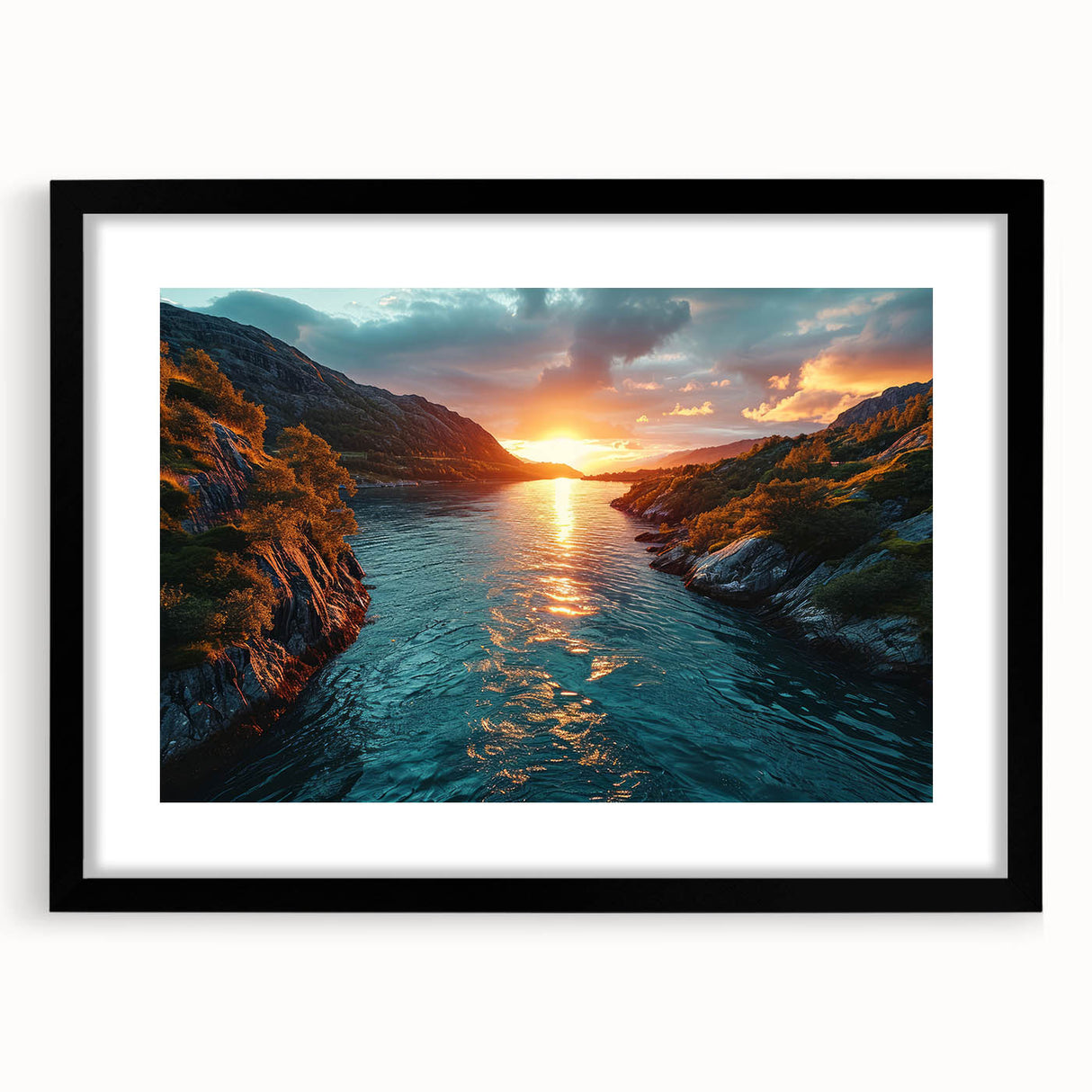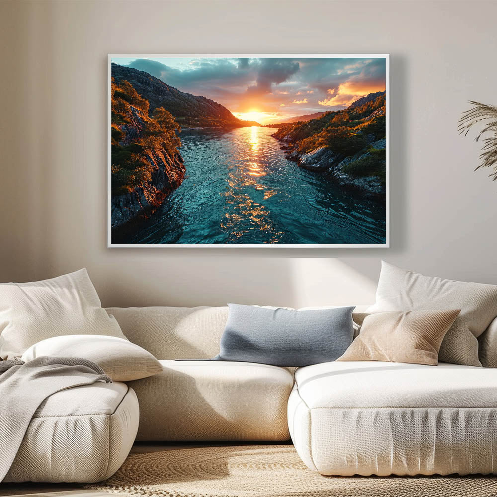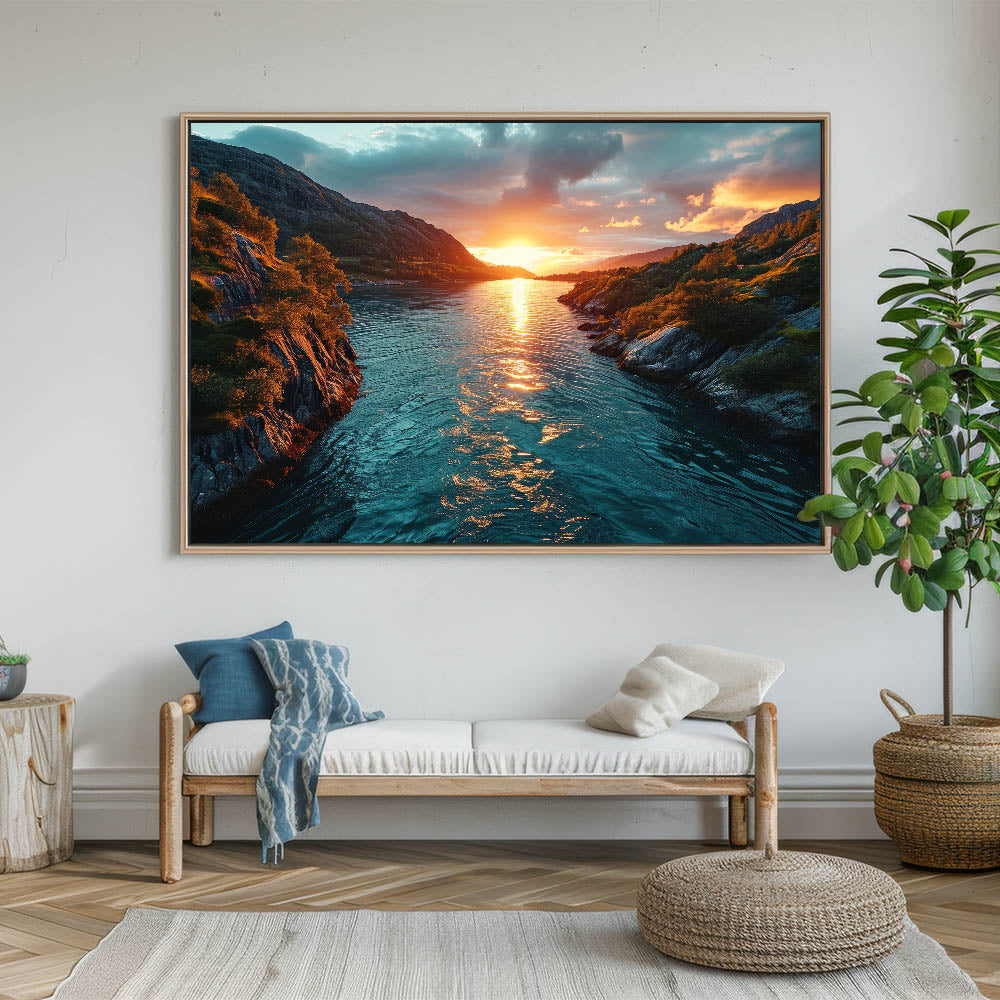 Transform your space with the awe-inspiring beauty of this sunset river valley wall art. Featuring a stunning view of a glowing sun setting over a serene river, framed by rugged cliffs and vibrant trees, this artwork captures nature’s majesty in a breathtaking moment. The fiery orange and golden hues of the sunset reflect brilliantly on the water’s surface, creating a mesmerizing contrast with the deep blue and green tones of the river and surrounding landscape. Perfect for those who love nature and coastal decor, this print brings warmth, tranquility, and a sense of adventure into your home.